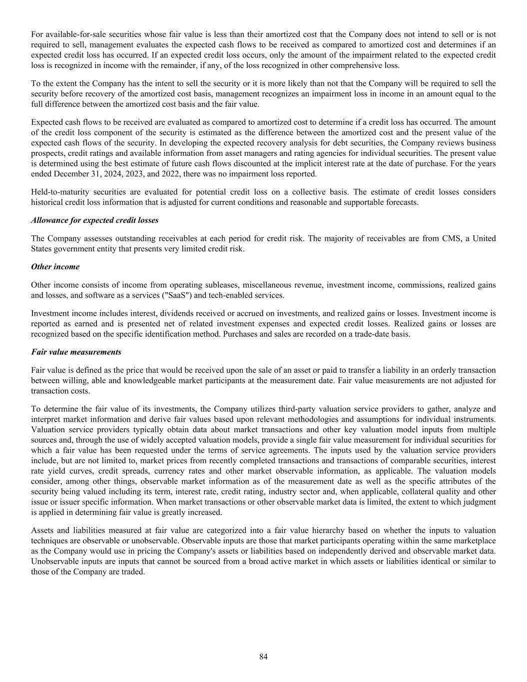 对于公允价值低于公司不打算出售或无需出售的摊余成本的可供出售证券,管理层评估预期将收到的现金流量与摊余成本的比较,并确定是否发生了预期信用损失。如果发生预期信用损失,则仅在收益中确认与预期信用损失相关的减值金额,其余部分(如有)在其他综合损失中确认。如果公司有出售证券的意图,或者公司很可能需要在收回摊余成本基础之前出售证券,管理层在收入中确认减值损失,金额等于摊余成本基础与公允价值之间的全部差额。预期收到的现金流量按摊余成本进行评估,以确定是否发生了信用损失。证券的信用损失部分金额估计为证券的摊余成本与预期现金流量现值之间的差额。在开发债务证券的预期回收分析时,公司审查业务前景、信用评级以及资产管理公司和评级机构就个别证券提供的可用信息。现值采用未来现金流量按购买日隐含利率折现的最佳估计值确定。截至2024年12月31日、2023年和2022年12月31日止年度,没有报告减值损失。持有至到期证券在集体基础上进行潜在信用损失评估。对信用损失的估计考虑了根据当前条件和合理且可支持的预测进行调整的历史信用损失信息。预期信用损失备抵公司在每个期间评估未偿还的应收账款的信用风险。大部分应收账款来自CMS,这是一家信用风险非常有限的美国政府实体。其他收入其他收入包括来自经营转租的收入、杂项收入、投资收入、佣金、已实现损益以及软件即服务(“SaaS”)和技术支持服务。投资收益包括利息、投资收到或应计的股息、已实现的收益或损失。投资收益报告为已赚,并在扣除相关投资费用和预期信用损失后列报。已实现损益根据具体认定方法确认。采购和销售按交易日期记录。公允价值计量公允价值定义为在计量日,有意愿、有能力和知情的市场参与者在有序交易中出售资产时将收到的价格或转移负债所支付的价格。公允价值计量不对交易成本进行调整。为确定其投资的公允价值,公司利用第三方估值服务提供商收集、分析和解释市场信息,并根据个别工具的相关方法和假设得出公允价值。估值服务提供商通常从多个来源获取有关市场交易和其他关键估值模型输入的数据,并通过使用广泛接受的估值模型,为根据服务协议条款要求公允价值的个别证券提供单一的公允价值计量。估值服务提供商使用的输入包括但不限于最近完成的交易和可比证券交易的市场价格、利率收益率曲线、信用利差、汇率和其他市场可观察信息(如适用)。估值模型考虑(其中包括)截至计量日期的可观察市场信息以及被估值证券的特定属性,包括其期限、利率、信用评级、行业部门以及(如适用)抵押品质量和其他发行或发行人的特定信息。当市场交易或其他可观察到的市场数据有限时,在确定公允价值时应用判断的程度大大增加。以公允价值计量的资产和负债根据估值技术的输入值是可观察的还是不可观察的,划分为公允价值层次。可观察输入值是指与公司在同一市场内经营的市场参与者根据独立得出和可观察的市场数据在为公司资产或负债定价时使用的输入值。不可观察的投入是指无法从交易与公司资产或负债相同或相似的广泛活跃市场中获得的投入。84