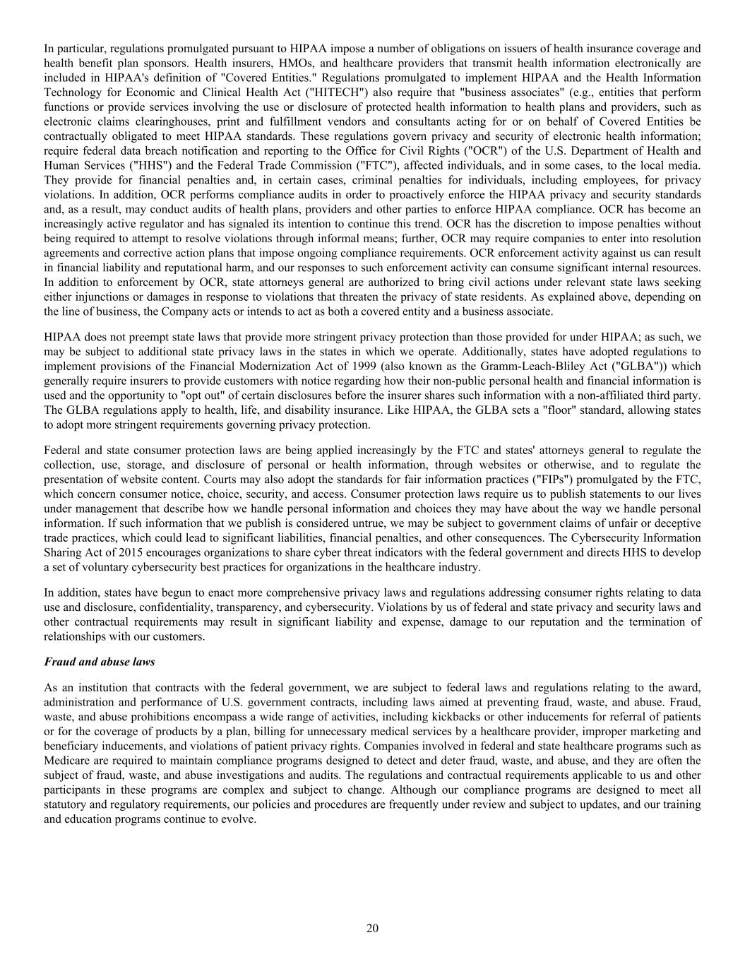 特别是,根据HIPAA颁布的法规对健康保险范围的发行人和健康福利计划发起人规定了一些义务。以电子方式传输健康信息的健康保险公司、HMO和医疗保健提供者被纳入HIPAA对“覆盖实体”的定义。为实施HIPAA和《健康信息技术促进经济和临床健康法》(“HITECH”)而颁布的条例还要求“商业伙伴”(例如,履行职能或提供服务涉及向健康计划和提供者使用或披露受保护的健康信息的实体,例如电子索赔信息交换所、打印和履行供应商以及代表或代表涵盖实体行事的顾问,在合同上有义务达到HIPAA标准。这些法规管理电子健康信息的隐私和安全;要求向美国卫生与公众服务部(“HHS”)的民权办公室(“OCR”)、联邦贸易委员会(“FTC”)、受影响的个人,在某些情况下,向当地媒体进行联邦数据泄露通知和报告。它们规定了经济处罚,在某些情况下,还对侵犯隐私的个人,包括雇员,进行了刑事处罚。此外,OCR执行合规审计,以便主动执行HIPAA隐私和安全标准,因此,可能会对健康计划、提供者和其他各方进行审计,以强制执行HIPAA合规。OCR已成为一个日益活跃的监管机构,并已表明其打算继续这一趋势。OCR有权酌情实施处罚,而无需试图通过非正式手段解决违规行为;此外,OCR可能会要求公司签订解决协议和纠正行动计划,这些协议和行动计划会施加持续的合规要求。针对我们的OCR执法活动可能会导致财务责任和声誉损害,我们对此类执法活动的回应可能会消耗大量内部资源。除OCR强制执行外,州检察长被授权根据相关州法律提起民事诉讼,寻求禁令或损害赔偿,以应对威胁州居民隐私的违规行为。如上文所述,根据业务范围的不同,公司既作为或打算作为涵盖实体也作为业务联营公司。HIPAA不会优先考虑提供比HIPAA规定的更严格的隐私保护的州法律;因此,我们可能会在我们经营所在的州受到额外的州隐私法的约束。此外,各州还通过了实施1999年《金融现代化法案》(也称为《格拉姆-利奇-布莱利法案》(GLBA))条款的法规,该法案通常要求保险公司向客户提供有关如何使用其非公开个人健康和财务信息的通知,以及在保险公司与非关联第三方共享此类信息之前“选择退出”某些披露的机会。GLBA条例适用于健康、人寿、伤残保险。与HIPAA一样,GLBA设定了“最低”标准,允许各州对隐私保护采取更严格的要求。联邦贸易委员会和各州总检察长越来越多地采用联邦和州消费者保护法,以规范通过网站或其他方式收集、使用、存储和披露个人或健康信息,并规范网站内容的呈现。法院还可以采用FTC颁布的公平信息实践(“FIPs”)标准,这些标准涉及消费者通知、选择、安全和访问。消费者保护法要求我们发布对我们在管理下的生活的陈述,描述我们如何处理个人信息以及他们对我们处理个人信息的方式可能有的选择。如果我们发布的此类信息被认为是不真实的,我们可能会受到政府关于不公平或欺骗性贸易行为的索赔,这可能会导致重大责任、经济处罚和其他后果。2015年的《网络安全信息共享法案》鼓励组织与联邦政府共享网络威胁指标,并指示HHS为医疗保健行业的组织制定一套自愿性网络安全最佳实践。此外,各州已开始颁布更全面的隐私法律法规,涉及与数据使用和披露、保密性、透明度和网络安全相关的消费者权利。我们违反联邦和州的隐私和安全法以及其他合同要求,可能会导致重大责任和费用,损害我们的声誉,并终止与客户的关系。欺诈和滥用法律作为与联邦政府签约的机构, 我们遵守与美国政府合同的授予、管理和履行有关的联邦法律法规,包括旨在防止欺诈、浪费和滥用的法律。欺诈、浪费和滥用禁令涵盖范围广泛的活动,包括为转诊患者或计划覆盖产品提供回扣或其他诱导,为医疗保健提供者不必要的医疗服务计费,不当营销和受益人诱导,以及侵犯患者隐私权。参与联邦和州医疗保健计划(如医疗保险)的公司被要求维持旨在发现和阻止欺诈、浪费和滥用的合规计划,它们经常成为欺诈、浪费和滥用调查和审计的对象。适用于我们和这些计划的其他参与者的法规和合同要求很复杂,可能会发生变化。尽管我们的合规计划旨在满足所有法定和监管要求,但我们的政策和程序经常受到审查并受到更新,我们的培训和教育计划也在不断发展。20