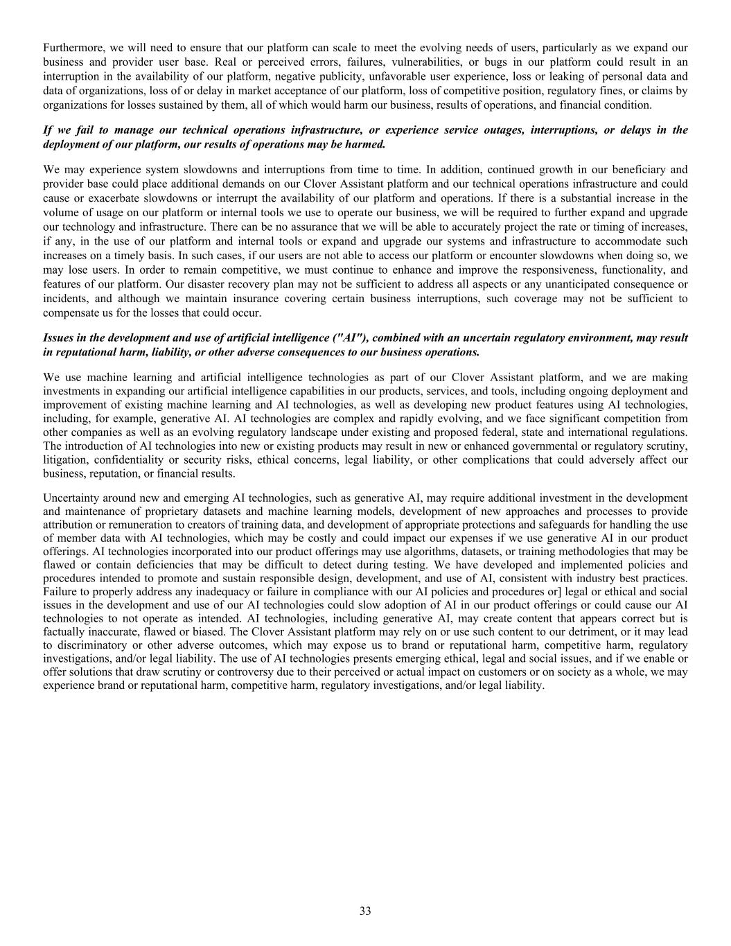 此外,我们将需要确保我们的平台能够扩展以满足用户不断变化的需求,尤其是在我们扩大业务和供应商用户群时。我们平台中真实的或感知到的错误、故障、漏洞或Bug可能导致我们平台的可用性中断、负面宣传、不利的用户体验、个人数据和组织数据的丢失或泄露、我们平台失去或延迟市场接受度、竞争地位丧失、监管罚款或组织就其遭受的损失提出索赔,所有这些都会损害我们的业务、运营结果和财务状况。如果我们未能管理我们的技术运营基础设施,或在部署我们的平台时遇到服务中断、中断或延迟,我们的运营结果可能会受到损害。我们可能会不时经历系统减速和中断。此外,我们的受益人和提供商群的持续增长可能会对我们的Clover Assistant平台和我们的技术运营基础设施提出额外的要求,并可能导致或加剧放缓或中断我们的平台和运营的可用性。如果我们用来运营业务的平台或内部工具的使用量大幅增加,我们将被要求进一步扩展和升级我们的技术和基础设施。我们无法保证在使用我们的平台和内部工具或扩展和升级我们的系统和基础设施以及时适应这种增长时,我们将能够准确预测增长的速度或时间(如果有的话)。在这种情况下,如果我们的用户无法访问我们的平台或在这样做时遇到减速,我们可能会失去用户。为了保持竞争力,我们必须继续增强和改进我们平台的响应能力、功能和特性。我们的灾难恢复计划可能不足以解决所有方面或任何意外后果或事件,尽管我们维持涵盖某些业务中断的保险,但此类保险可能不足以补偿我们可能发生的损失。人工智能(“AI”)的开发和使用中的问题,加上不确定的监管环境,可能会对我们的业务运营造成声誉损害、责任或其他不利后果。我们使用机器学习和人工智能技术作为Clover Assistant平台的一部分,我们正在投资扩展我们在产品、服务和工具方面的人工智能能力,包括持续部署和改进现有的机器学习和人工智能技术,以及使用人工智能技术开发新的产品功能,例如,包括生成人工智能。人工智能技术复杂且发展迅速,我们面临着来自其他公司的重大竞争,以及在现有和拟议的联邦、州和国际法规下不断变化的监管环境。将人工智能技术引入新产品或现有产品可能会导致新的或加强的政府或监管审查、诉讼、保密或安全风险、道德担忧、法律责任或其他可能对我们的业务、声誉或财务业绩产生不利影响的并发症。围绕新的和新兴的人工智能技术(例如生成式人工智能)的不确定性,可能需要额外投资于开发和维护专有数据集和机器学习模型,开发新的方法和流程,为训练数据的创建者提供归属或报酬,以及制定适当的保护和保障措施,以处理使用人工智能技术的成员数据,如果我们在产品中使用生成式人工智能,这可能会造成高昂的成本,并可能影响我们的开支。纳入我们产品中的AI技术可能会使用可能存在缺陷或包含在测试期间可能难以发现的缺陷的算法、数据集或训练方法。我们制定并实施了旨在促进和维持负责任的人工智能设计、开发和使用的政策和程序,符合行业最佳实践。未能妥善解决我们人工智能技术开发和使用过程中的任何不充分或未能遵守我们的人工智能政策和程序或]法律或道德和社会问题,可能会减缓人工智能在我们的产品中的采用,或可能导致我们的人工智能技术无法按预期运行。人工智能技术,包括生成式人工智能,可能会创造看起来正确但实际上不准确、有缺陷或有偏见的内容。Clover Assistant平台可能依赖或使用此类内容对我们不利,或可能导致歧视性或其他不良结果,这可能会使我们面临品牌或声誉损害、竞争损害、监管调查, 和/或法律责任。人工智能技术的使用提出了新出现的伦理、法律和社会问题,如果我们启用或提供的解决方案因其对客户或整个社会的感知或实际影响而引起审查或争议,我们可能会经历品牌或声誉损害、竞争损害、监管调查和/或法律责任。33