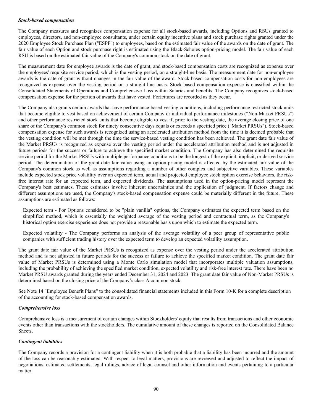 以股票为基础的薪酬公司根据授予日奖励的估计公允价值计量并确认所有以股票为基础的奖励,包括根据某些股权激励计划和根据2020年员工股票购买计划(“ESPP”)授予员工的股票购买权授予员工、董事和非员工顾问的期权和RSU。采用Black-Scholes期权定价模型估算每份期权和股票购买权的公允价值。每份受限制股份单位的公允价值以授予日公司普通股的估计公允价值为基础。员工奖励的计量日为授予日,以股票为基础的薪酬成本按直线法在员工规定的服务期即归属期内确认为费用。非雇员奖励的计量日为授予日,奖励的公允价值不发生变动。非雇员的股票薪酬成本在归属期内按直线法确认为费用。基于股票的补偿费用在合并运营报表中分类,综合损失在工资和福利中分类。公司就已归属的部分奖励确认基于股票的补偿费用。没收在发生时记录在案。公司还授予某些具有基于业绩的归属条件的奖励,包括基于实现某些公司或个人业绩里程碑而有资格归属的业绩限制性股票单位(“非市场PRSU”),以及如果在归属日期之前,公司普通股的一股股票连续九十天的平均收盘价等于或超过指定价格(“市场PRSU”),则有资格归属的其他业绩限制性股票单位。此类奖励的基于股票的补偿费用自被认为很可能满足归属条件时起至基于服务的归属条件已实现时使用加速归属法确认。市场PRSU的授予日公允价值在加速归属法下确认为归属期内的费用,不会在未来期间因成功或未能达到规定的市场条件而进行调整。公司还确定了具有多种履约条件的市场PRSU的必要服务期为显性、隐性或派生服务期中最长的。使用期权定价模型确定授予日公允价值受到公司普通股估计公允价值以及有关许多其他复杂和主观变量的假设的影响。这些变量包括预期期限内的预期股价波动、实际和预计的员工股票期权行权行为、预期期限的无风险利率以及预期的股息。期权定价模型所采用的假设代表公司的最佳估计。这些估计涉及固有的不确定性和判断的应用。如果因素发生变化,使用不同的假设,未来公司基于股票的补偿费用可能会出现重大差异。这些假设估计如下:预期期限-对于被视为“普通”期权的期权,公司根据简易法估计预期期限,本质上是归属期和合同期限的加权平均,因为公司的历史期权行权经验并不提供估计预期期限的合理基础。预期波动率-公司对预期期限内具有充分交易历史的代表性公众公司的同业组的平均波动率进行分析,以制定预期波动率假设。市场PRSU的授予日公允价值在加速归属法下确认为归属期内的费用,不会在未来期间因成功或未能达到规定的市场条件而进行调整。Market PRSUs的授予日公允价值采用蒙特卡洛模拟模型确定,该模型纳入了多种估值假设,包括实现特定市场条件的概率、预期波动性和无风险利率。在截至12月31日的年度内,没有授予市场PRSU奖励, 2024年和2023年。非市场PRSU的授予日公允价值根据公司A类普通股的收盘价确定。有关基于股票的薪酬奖励会计的完整描述,请参阅本10-K表中包含的合并财务报表附注14“员工福利计划”。综合损失综合损失是对股东权益内除与股东发生交易以外的交易和其他经济事件所导致的某些变动的计量。这些变化的累计金额在合并资产负债表中报告。或有负债本公司在负债很可能已经发生且损失金额可以合理估计的情况下,计提或有负债准备。关于法律事项,对条款进行审查和调整,以反映谈判、估计和解、法律裁决、法律顾问的建议以及与特定事项有关的其他信息和事件的影响。90