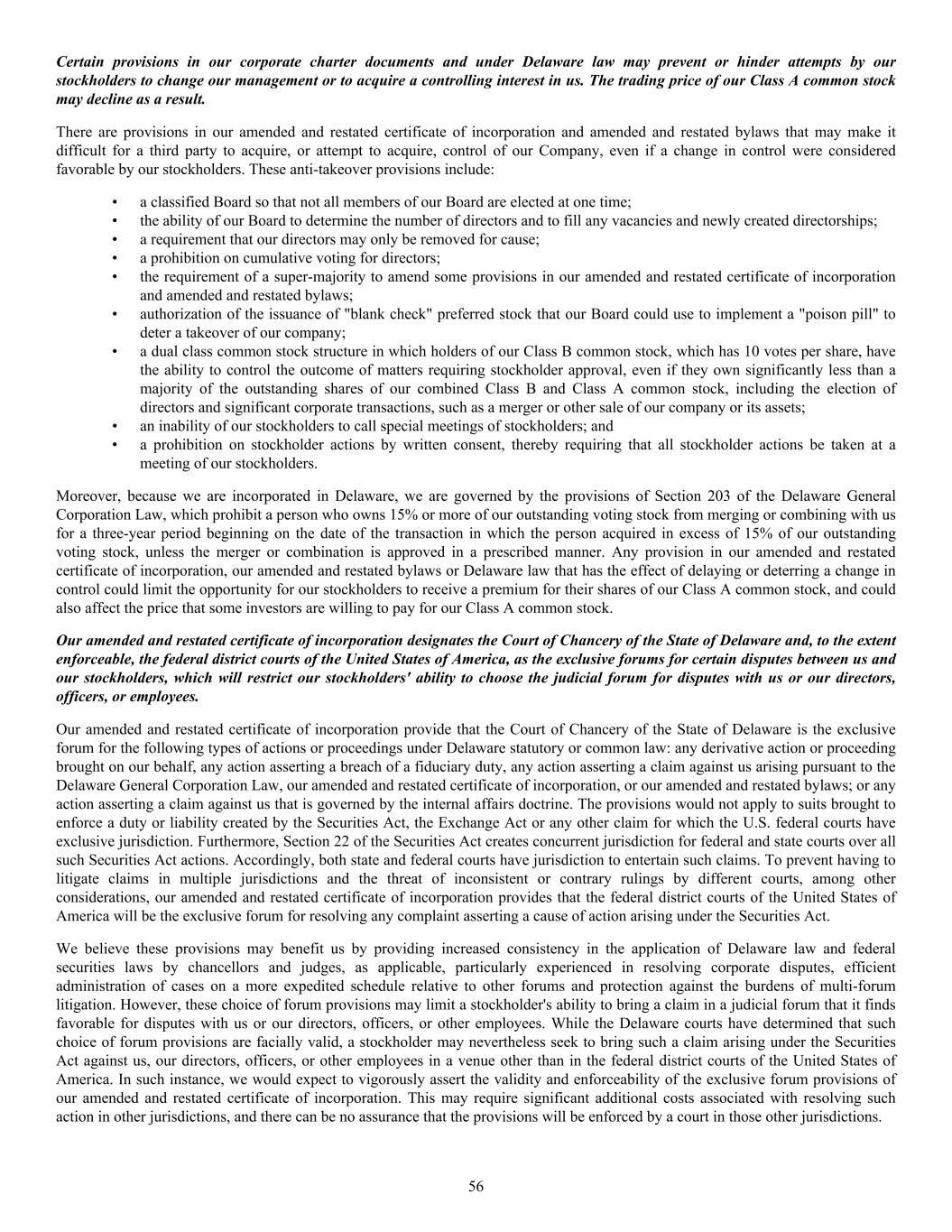 我们的公司章程文件和特拉华州法律中的某些规定可能会阻止或阻碍我们的股东试图改变我们的管理层或收购我们的控股权。我们A类普通股的交易价格可能因此而下降。我们经修订和重述的公司注册证书和经修订和重述的章程中有条款可能使第三方难以获得或试图获得我们公司的控制权,即使控制权变更被我们的股东认为是有利的。这些反收购条款包括:•分类董事会,使我们董事会的所有成员不是一次性选出的;•我们的董事会有能力确定董事人数,并填补任何空缺和新设立的董事职位;•要求我们的董事只能因故被免职;•禁止对董事进行累积投票;•要求以绝对多数修改我们经修订和重述的公司注册证书和经修订和重述的章程中的某些条款;•授权发行“空白支票”优先股我们的董事会可以用来实施“毒丸”来阻止对我们公司的收购;•双重类别普通股结构,在这种结构中,我们的B类普通股持有人,每股有10票投票权,有能力控制需要股东批准的事项的结果,即使他们拥有的股份明显少于我们合并后的B类和A类普通股的大多数流通股,包括选举董事和重大公司交易,例如合并或以其他方式出售我们公司或其资产;•我们的股东无法召集股东特别会议;•通过书面同意禁止股东行动,从而要求在我们的股东会议上采取所有股东行动。此外,由于我们在特拉华州注册成立,我们受《特拉华州一般公司法》第203条的规定管辖,该条禁止拥有我们已发行的有表决权股票15%或以上的人在自该人获得超过我们已发行有表决权股票15%的交易之日起的三年期间内与我们合并或合并,除非合并或合并以规定方式获得批准。我们经修订和重述的公司注册证书、我们经修订和重述的章程或特拉华州法律中任何具有延迟或阻止控制权变更效果的条款都可能限制我们的股东获得我们A类普通股股份溢价的机会,也可能影响一些投资者愿意为我们的A类普通股支付的价格。我们经修订和重述的公司注册证书指定特拉华州衡平法院以及在可强制执行的范围内,美利坚合众国联邦地区法院作为我们与我们的股东之间某些争议的独家论坛,这将限制我们的股东选择与我们或我们的董事、高级职员或雇员发生争议的司法论坛的能力。我们经修订和重述的公司注册证书规定,根据特拉华州成文法或普通法,特拉华州衡平法院是以下类型的诉讼或程序的专属法院:代表我们提起的任何派生诉讼或程序,任何声称违反信托义务的诉讼,根据特拉华州一般公司法、我们经修订和重述的公司注册证书或我们经修订和重述的章程对我们提出索赔的任何诉讼;或根据内政原则对我们提出索赔的任何诉讼。这些规定不适用于为执行《证券法》、《交易法》或美国联邦法院拥有专属管辖权的任何其他索赔而产生的义务或责任而提起的诉讼。此外,《证券法》第22条为联邦法院和州法院对所有此类《证券法》诉讼设立了并行管辖权。因此,州法院和联邦法院都有权受理这类索赔。为防止必须在多个司法管辖区就索赔提起诉讼以及不同法院做出不一致或相反裁决的威胁,除其他考虑因素外,我们修订和重述的公司注册证书规定,美利坚合众国联邦地区法院将是解决任何声称根据《证券法》产生的诉讼因由的投诉的唯一论坛。我们认为,这些条款可能会使我们受益,因为在适用的情况下,特别是在解决公司纠纷方面经验丰富的财政大臣和法官在适用特拉华州法律和联邦证券法方面提供了更高的一致性, 以相对于其他论坛更快的进度高效管理案件,并保护免受多论坛诉讼的负担。然而,这些选择法院地条款可能会限制股东在其认为有利于与我们或我们的董事、高级职员或其他员工发生纠纷的司法法院提起索赔的能力。虽然特拉华州法院已确定此类选择法院条款在表面上是有效的,但股东仍可能寻求在美利坚合众国联邦地区法院以外的场所对我们、我们的董事、高级职员或其他雇员提出根据《证券法》产生的此类索赔。在这种情况下,我们希望大力主张我们修订和重述的公司注册证书的专属法院地条款的有效性和可执行性。这可能需要与在其他法域解决此类行动相关的大量额外费用,并且无法保证这些规定将由这些其他法域的法院执行。56