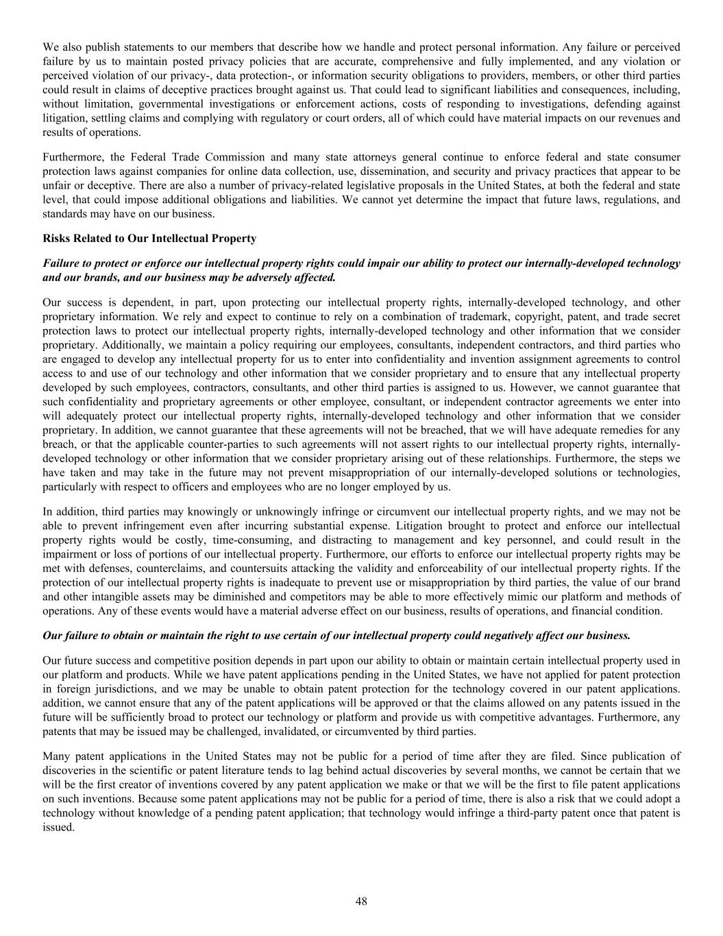 我们还向会员发布声明,描述我们如何处理和保护个人信息。我们未能或被认为未能维护已发布的准确、全面和全面实施的隐私政策,以及任何违反或被认为违反我们对提供者、成员或其他第三方的隐私、数据保护或信息安全义务的行为,都可能导致对我们提起的欺骗性做法索赔。这可能导致重大责任和后果,包括但不限于政府调查或执法行动、应对调查、抗辩诉讼、解决索赔和遵守监管或法院命令的成本,所有这些都可能对我们的收入和经营业绩产生重大影响。此外,联邦贸易委员会和许多州检察长继续针对在线数据收集、使用、传播以及安全和隐私做法似乎不公平或具有欺骗性的公司执行联邦和州消费者保护法。在美国,联邦和州一级也有一些与隐私相关的立法提案,可能会施加额外的义务和责任。我们尚无法确定未来的法律、法规和标准可能对我们的业务产生的影响。与我们的知识产权相关的风险未能保护或执行我们的知识产权可能会损害我们保护我们内部开发的技术和我们的品牌的能力,我们的业务可能会受到不利影响。我们的成功部分取决于保护我们的知识产权、内部开发的技术和其他专有信息。我们依赖并期望继续依靠商标、版权、专利和商业秘密保护法律的组合来保护我们的知识产权、内部开发的技术和我们认为专有的其他信息。此外,我们维持一项政策,要求我们的员工、顾问、独立承包商和受聘为我们开发任何知识产权的第三方签订保密和发明转让协议,以控制对我们的技术和我们认为专有的其他信息的访问和使用,并确保这些员工、承包商、顾问和其他第三方开发的任何知识产权被转让给我们。然而,我们无法保证我们订立的此类保密和专有协议或其他雇员、顾问或独立承包商协议将充分保护我们的知识产权、内部开发的技术和我们认为专有的其他信息。此外,我们不能保证这些协议不会被违反,我们将对任何违约行为有足够的补救措施,或者此类协议的适用交易对手不会对我们的知识产权、内部开发的技术或我们认为因这些关系而产生的专有的其他信息主张权利。此外,我们已经采取和将来可能采取的步骤可能无法防止我们内部开发的解决方案或技术被盗用,特别是对于不再受我们雇用的官员和雇员而言。此外,第三方可能会在知情或不知情的情况下侵犯或规避我们的知识产权,我们可能即使在产生大量费用后也无法防止侵权。为保护和执行我们的知识产权而提起的诉讼将是昂贵的、耗时的,并且会分散管理层和关键人员的注意力,并可能导致我们部分知识产权的减值或损失。此外,我们执行知识产权的努力可能会遇到抗辩、反诉和反诉,攻击我们知识产权的有效性和可执行性。如果我们的知识产权保护不足以防止第三方使用或盗用,我们的品牌和其他无形资产的价值可能会被削弱,竞争对手可能能够更有效地模仿我们的平台和运营方法。任何这些事件都会对我们的业务、经营业绩和财务状况产生重大不利影响。我们未能获得或维持使用我们某些知识产权的权利可能会对我们的业务产生负面影响。我们未来的成功和竞争地位部分取决于我们获得或维护我们平台和产品中使用的某些知识产权的能力。虽然我们在美国有专利申请在申请中,但我们没有在外国司法管辖区申请专利保护, 我们可能无法为我们的专利申请所涵盖的技术获得专利保护。此外,我们无法确保任何专利申请将获得批准,或未来发布的任何专利上允许的权利要求将足够广泛,以保护我们的技术或平台并为我们提供竞争优势。此外,任何可能发布的专利都可能被第三方质疑、作废或规避。美国的许多专利申请在提交后可能在一段时间内不会公开。由于在科学或专利文献中发表发现往往比实际发现滞后几个月,我们无法确定我们将成为我们提出的任何专利申请所涵盖的发明的第一个创造者,或者我们将成为第一个就此类发明提交专利申请的人。因为有些专利申请可能在一段时间内不会公开,所以也存在这样一种风险,即我们可能会在不知道某项待审专利申请的情况下采用某项技术;一旦该专利被颁发,该技术就会侵犯第三方专利。48