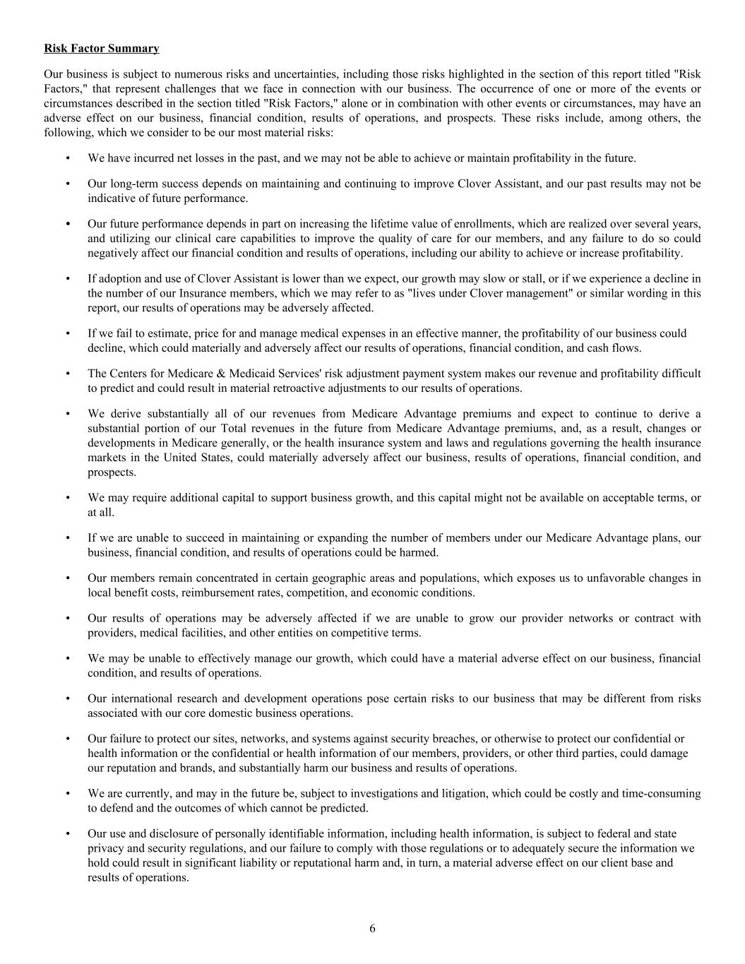 风险因素摘要我们的业务受到众多风险和不确定性的影响,包括本报告标题为“风险因素”部分中强调的那些风险,这些风险代表了我们在业务方面面临的挑战。发生标题为“风险因素”一节中描述的一项或多项事件或情况,单独或与其他事件或情况相结合,可能会对我们的业务、财务状况、经营业绩和前景产生不利影响。这些风险包括,除其他外,以下我们认为是我们最重大的风险:•我们过去发生了净亏损,我们可能无法在未来实现或保持盈利。•我们的长期成功取决于保持并持续改进Clover Assistant,我们过去的结果可能并不代表未来的表现。•我们未来的业绩部分取决于增加注册的终生价值,这是在几年内实现的,并利用我们的临床护理能力来提高我们会员的护理质量,任何不这样做都可能对我们的财务状况和经营业绩产生负面影响,包括我们实现或提高盈利能力的能力。•如果Clover Assistant的采用率和使用率低于我们的预期,我们的增长可能会放缓或停滞,或者如果我们的保险会员数量下降,我们可能将其称为“Clover管理下的生命”或本报告中的类似措辞,我们的经营业绩可能会受到不利影响。•如果我们未能有效地估计、定价和管理医疗费用,我们业务的盈利能力可能会下降,这可能会对我们的经营业绩、财务状况和现金流产生重大不利影响。•医疗保险和医疗补助服务中心的风险调整支付系统使我们的收入和盈利能力难以预测,并可能导致对我们的经营业绩进行重大的追溯调整。•我们几乎所有的收入都来自Medicare Advantage保费,并预计未来我们总收入的很大一部分将继续来自Medicare Advantage保费,因此,医疗保险的总体变化或发展,或医疗保险制度和管理美国医疗保险市场的法律法规,可能会对我们的业务、经营业绩、财务状况和前景产生重大不利影响。•我们可能需要额外的资本来支持业务增长,而这些资本可能无法以可接受的条件获得,或者根本无法获得。•如果我们无法成功维持或扩大我们的Medicare Advantage计划下的会员数量,我们的业务、财务状况和运营结果可能会受到损害。•我们的成员仍然集中在某些地理区域和人口中,这使我们面临当地福利成本、报销率、竞争和经济状况的不利变化。•如果我们无法发展我们的供应商网络或以竞争性条款与供应商、医疗设施和其他实体签订合同,我们的经营业绩可能会受到不利影响。•我们可能无法有效管理我们的增长,这可能对我们的业务、财务状况和经营业绩产生重大不利影响。•我们的国际研发业务对我们的业务构成某些风险,这些风险可能不同于与我们的核心国内业务运营相关的风险。•我们未能保护我们的站点、网络和系统免受安全漏洞的影响,或以其他方式保护我们的机密或健康信息或我们的会员、提供商或其他第三方的机密或健康信息,可能会损害我们的声誉和品牌,并严重损害我们的业务和经营业绩。•我们目前以及将来可能会受到调查和诉讼的影响,这可能是昂贵和耗时的辩护,其结果无法预测。•我们对个人身份信息(包括健康信息)的使用和披露受联邦和州隐私和安全法规的约束,我们未能遵守这些法规或未能充分保护我们所持有的信息可能会导致重大责任或声誉损害,进而对我们的客户群和运营结果产生重大不利影响。6