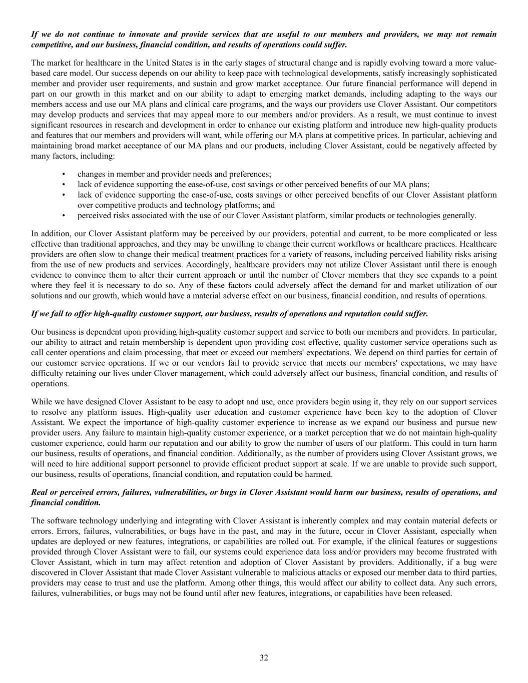 如果我们不继续创新并提供对我们的会员和供应商有用的服务,我们可能无法保持竞争力,我们的业务、财务状况和运营结果可能会受到影响。美国的医疗保健市场正处于结构变化的早期阶段,正迅速向更加基于价值的护理模式演变。我们的成功取决于我们跟上技术发展步伐、满足日益复杂的会员和供应商用户要求以及维持和提高市场接受度的能力。我们未来的财务表现将部分取决于我们在这个市场的增长以及我们适应新兴市场需求的能力,包括适应我们的会员访问和使用我们的MA计划和临床护理计划的方式,以及我们的提供者使用Clover Assistant的方式。我们的竞争对手可能会开发对我们的会员和/或供应商更有吸引力的产品和服务。因此,我们必须继续在研发方面投入大量资源,以增强我们现有的平台,并推出我们的会员和供应商想要的新的高质量产品和功能,同时以具有竞争力的价格提供我们的MA计划。特别是,实现并保持市场对我们的MA计划和我们的产品(包括Clover Assistant)的广泛认可,可能会受到许多因素的负面影响,包括:•会员和供应商需求和偏好的变化;•缺乏证据支持我们的MA计划的易用性、成本节约或其他可感知的好处;•缺乏证据支持我们的Clover Assistant平台相对于竞争产品和技术平台的易用性、成本节约或其他可感知的好处;以及•感知到与使用我们的Clover Assistant平台、一般类似产品或技术相关的风险。此外,我们的Clover Assistant平台可能被我们的供应商、潜在的和当前的供应商认为比传统方法更复杂或更不有效,他们可能不愿意改变他们当前的工作流程或医疗保健实践。医疗保健提供者往往由于各种原因而迟迟不改变其医疗治疗做法,包括因使用新产品和服务而产生的感知责任风险。因此,医疗保健提供者可能不会使用Clover Assistant,直到有足够的证据说服他们改变目前的方法,或者直到他们看到的Clover成员数量扩大到他们认为有必要这样做的地步。任何这些因素都可能对我们解决方案的需求和市场利用率以及我们的增长产生不利影响,这将对我们的业务、财务状况和经营业绩产生重大不利影响。如果我们不能提供高质量的客户支持,我们的业务、运营结果和声誉可能会受到影响。我们的业务依赖于向我们的会员和供应商提供高质量的客户支持和服务。特别是,我们吸引和保留会员的能力取决于提供符合或超过会员期望的具有成本效益、高质量的客户服务运营,例如呼叫中心运营和索赔处理。我们的某些客户服务业务依赖第三方。如果我们或我们的供应商未能提供满足会员期望的服务,我们可能难以在Clover管理下保留我们的生命,这可能会对我们的业务、财务状况和经营业绩产生不利影响。虽然我们将Clover Assistant设计为易于采用和使用,但一旦供应商开始使用它,他们就依赖我们的支持服务来解决任何平台问题。高质量的用户教育和客户体验一直是采用三叶草助手的关键。随着我们扩展业务和追求新的供应商用户,我们预计高质量客户体验的重要性将会增加。任何未能保持高质量的客户体验,或市场认为我们没有保持高质量的客户体验,都可能损害我们的声誉和我们增加平台用户数量的能力。这可能反过来损害我们的业务、运营结果和财务状况。此外,随着使用Clover Assistant的供应商数量增加,我们将需要雇用更多的支持人员来大规模提供高效的产品支持。如果我们无法提供这样的支持,我们的业务、运营结果、财务状况和声誉都可能受到损害。Clover Assistant中真实或感知到的错误、故障、漏洞或错误会损害我们的业务、运营结果和财务状况。Clover Assistant底层和集成的软件技术本质上是复杂的,可能包含材料缺陷或错误。错误、故障、漏洞或bug过去有,未来也可能有, 发生在Clover Assistant中,尤其是在部署更新或推出新特性、集成或功能时。例如,如果通过Clover Assistant提供的临床功能或建议失败,我们的系统可能会出现数据丢失和/或提供者可能会对Clover Assistant感到沮丧,这反过来可能会影响提供者对Clover Assistant的保留和采用。此外,如果在Clover Assistant中发现了使Clover Assistant易受恶意攻击或将我们的会员数据暴露给第三方的漏洞,提供商可能会停止信任并使用该平台。除其他外,这将影响我们收集数据的能力。任何此类错误、故障、漏洞或错误可能要等到新特性、集成或功能发布后才能被发现。32