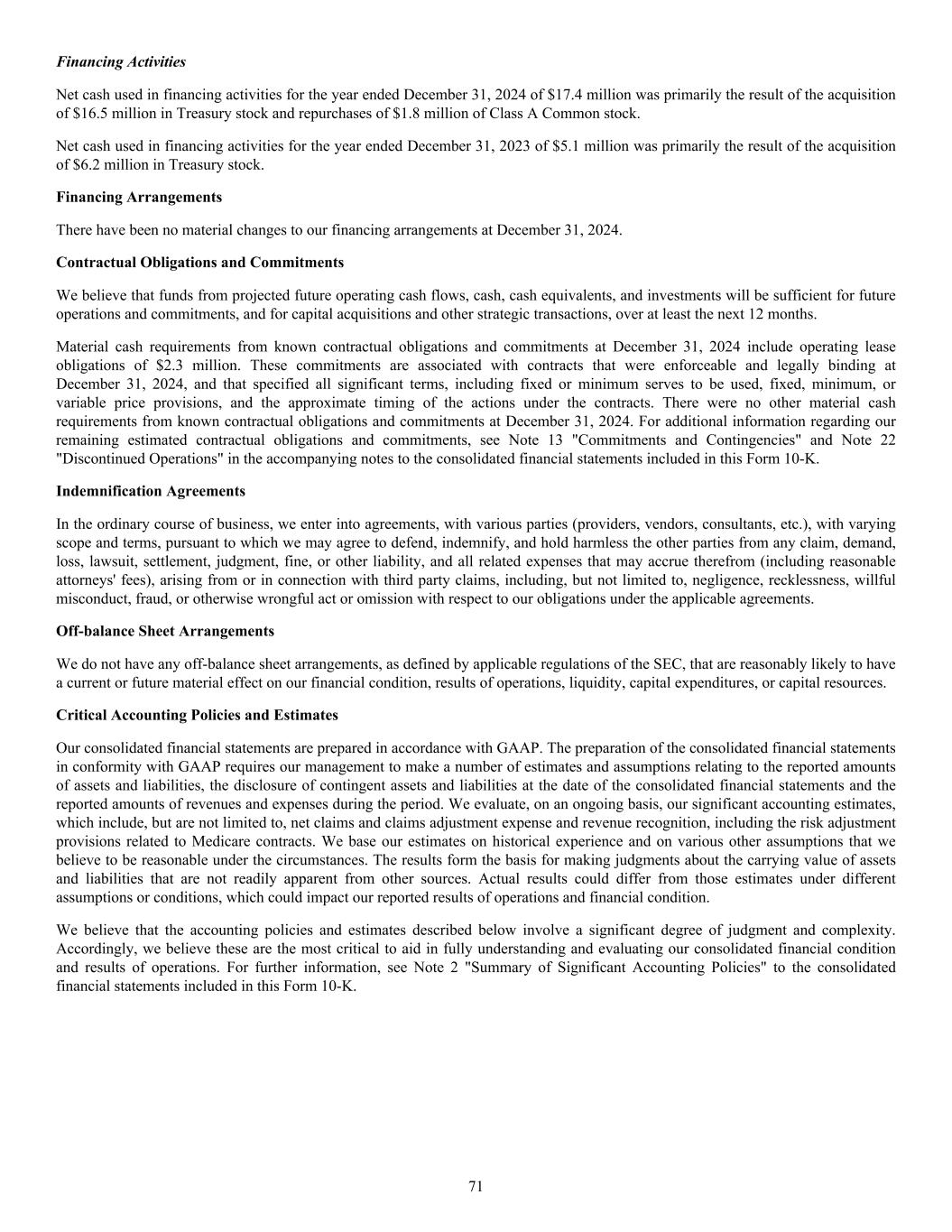融资活动截至2024年12月31日止年度用于融资活动的现金净额1740万美元,主要是由于购买了1650万美元的库存股和回购了180万美元的A类普通股。截至2023年12月31日止年度用于融资活动的现金净额510万美元,主要是由于购买了620万美元的库存股票。融资安排截至2024年12月31日,我们的融资安排没有重大变化。合同义务和承诺我们认为,至少在未来12个月内,来自预计未来经营现金流、现金、现金等价物和投资的资金将足以用于未来的经营和承诺,以及资本收购和其他战略交易。截至2024年12月31日,已知合同义务和承付款的重大现金需求包括经营租赁义务230万美元。这些承诺与截至2024年12月31日可执行且具有法律约束力的合同相关,这些合同规定了所有重要条款,包括固定或最低服务使用、固定、最低或可变价格条款,以及合同项下行动的大致时间。截至2024年12月31日,没有来自已知合同义务和承诺的其他重大现金需求。有关我们剩余的估计合同义务和承诺的更多信息,请参阅本10-K表所附合并财务报表附注中的附注13“承诺和或有事项”和附注22“终止经营”。赔偿协议在日常业务过程中,我们与各方(供应商、供应商、顾问等)订立协议,范围和条款各不相同,据此,我们可能同意抗辩、赔偿并使其他方免受任何索赔、要求、损失、诉讼、和解、判决、罚款或其他责任,以及由此可能产生的所有相关费用(包括合理的律师费),产生于或与第三方索赔有关,包括但不限于疏忽、鲁莽、故意不当行为、欺诈或与我们在适用协议下的义务有关的其他不法行为或不作为。表外安排我们没有任何合理可能对我们的财务状况、经营业绩、流动性、资本支出或资本资源产生当前或未来重大影响的、由SEC适用法规定义的表外安排。关键会计政策和估计我们的合并财务报表是根据公认会计原则编制的。按照公认会计原则编制合并财务报表要求我们的管理层就资产和负债的报告金额、在合并财务报表日期披露或有资产和负债以及该期间收入和支出的报告金额作出一些估计和假设。我们持续评估我们的重要会计估计,其中包括但不限于净索赔和索赔调整费用和收入确认,包括与医疗保险合同相关的风险调整条款。我们的估计基于历史经验和我们认为在当时情况下合理的各种其他假设。这些结果构成了对从其他来源不易看出的资产和负债的账面价值作出判断的基础。在不同的假设或条件下,实际结果可能与这些估计不同,这可能会影响我们报告的经营业绩和财务状况。我们认为,下文所述的会计政策和估计涉及重大程度的判断和复杂性。因此,我们认为这些是最关键的,有助于充分了解和评估我们的综合财务状况和经营业绩。如需更多信息,请参阅本10-K表中包含的合并财务报表附注2“重要会计政策摘要”。71