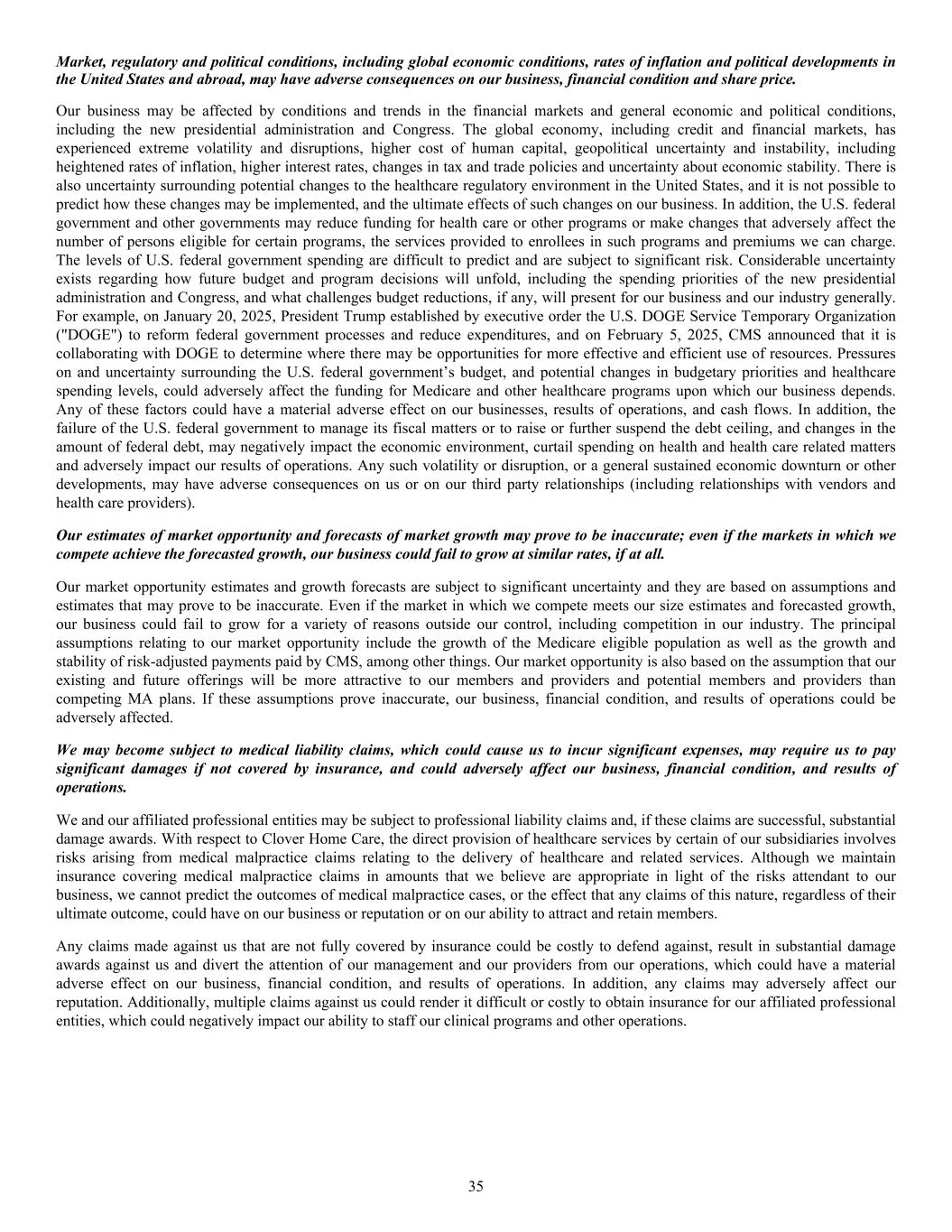市场、监管和政治状况,包括全球经济状况、通货膨胀率以及美国和国外的政治发展,可能会对我们的业务、财务状况和股价产生不利影响。我们的业务可能会受到金融市场的状况和趋势以及总体经济和政治状况的影响,包括新的总统政府和国会。全球经济,包括信贷和金融市场,经历了极端波动和混乱、人力资本成本上升、地缘政治不确定性和不稳定,包括通货膨胀率上升、利率上升、税收和贸易政策变化以及经济稳定的不确定性。围绕美国医疗监管环境的潜在变化也存在不确定性,无法预测这些变化可能如何实施,以及这些变化对我们业务的最终影响。此外,美国联邦政府和其他政府可能会减少对医疗保健或其他项目的资助或做出改变,从而对符合某些项目资格的人数、为此类项目的参保人提供的服务以及我们可以收取的保费产生不利影响。美国联邦政府支出水平难以预测,面临重大风险。关于未来预算和计划决策将如何展开,包括新一届总统政府和国会的支出优先事项,以及预算削减(如果有的话)将给我们的业务和整个行业带来哪些挑战,存在相当大的不确定性。例如,2025年1月20日,特朗普总统通过行政命令成立了美国DOGE服务临时组织(简称“DOGE”),以改革联邦政府流程并减少开支,而在2025年2月5日,CMS宣布正与DOGE合作,以确定哪些地方可能存在更有效、更高效地利用资源的机会。围绕美国联邦政府预算的压力和不确定性,以及预算优先事项和医疗保健支出水平的潜在变化,可能会对我们业务所依赖的医疗保险和其他医疗保健项目的资金产生不利影响。这些因素中的任何一个都可能对我们的业务、经营业绩和现金流产生重大不利影响。此外,美国联邦政府未能管理其财政事务或未能提高或进一步暂停债务上限,以及联邦债务金额的变化,可能会对经济环境产生负面影响,削减卫生和医疗保健相关事务的支出,并对我们的经营业绩产生不利影响。任何此类波动或中断,或普遍持续的经济衰退或其他发展,都可能对我们或我们的第三方关系(包括与供应商和医疗保健提供者的关系)产生不利影响。我们对市场机会的估计和对市场增长的预测可能被证明是不准确的;即使我们竞争的市场实现了预测的增长,我们的业务也可能无法以类似的速度增长,如果有的话。我们的市场机会估计和增长预测受到重大不确定性的影响,它们基于可能被证明不准确的假设和估计。即使我们竞争的市场达到我们的规模估计和预测的增长,我们的业务也可能由于我们无法控制的各种原因而无法增长,包括我们行业的竞争。与我们的市场机会相关的主要假设包括医疗保险合格人群的增长以及CMS支付的风险调整后付款的增长和稳定性等。我们的市场机会还基于这样的假设,即我们现有和未来的产品将比竞争的MA计划对我们的会员和供应商以及潜在的会员和供应商更具吸引力。如果这些假设被证明不准确,我们的业务、财务状况和经营业绩可能会受到不利影响。我们可能会成为医疗责任索赔的对象,这可能会导致我们产生重大费用,如果不在保险范围内,可能会要求我们支付重大损害赔偿,并可能对我们的业务、财务状况和经营业绩产生不利影响。我们和我们的关联专业实体可能会受到专业责任索赔,如果这些索赔成功,将获得实质性损害赔偿。关于Clover Home Care,我们的某些子公司直接提供医疗保健服务涉及与提供医疗保健和相关服务相关的医疗事故索赔所产生的风险。尽管我们根据业务所伴随的风险,以我们认为适当的金额维持涵盖医疗事故索赔的保险, 我们无法预测医疗事故案件的结果,或者任何这种性质的索赔,无论其最终结果如何,可能对我们的业务或声誉或我们吸引和留住会员的能力产生的影响。针对我们提出的任何未被保险完全覆盖的索赔可能会造成高昂的抗辩成本,导致对我们的重大损害赔偿,并转移我们的管理层和供应商对我们运营的注意力,这可能对我们的业务、财务状况和运营结果产生重大不利影响。此外,任何索赔都可能对我们的声誉产生不利影响。此外,针对我们的多项索赔可能会使我们的关联专业实体难以获得保险或成本高昂,这可能会对我们为临床项目和其他业务配备人员的能力产生负面影响。35