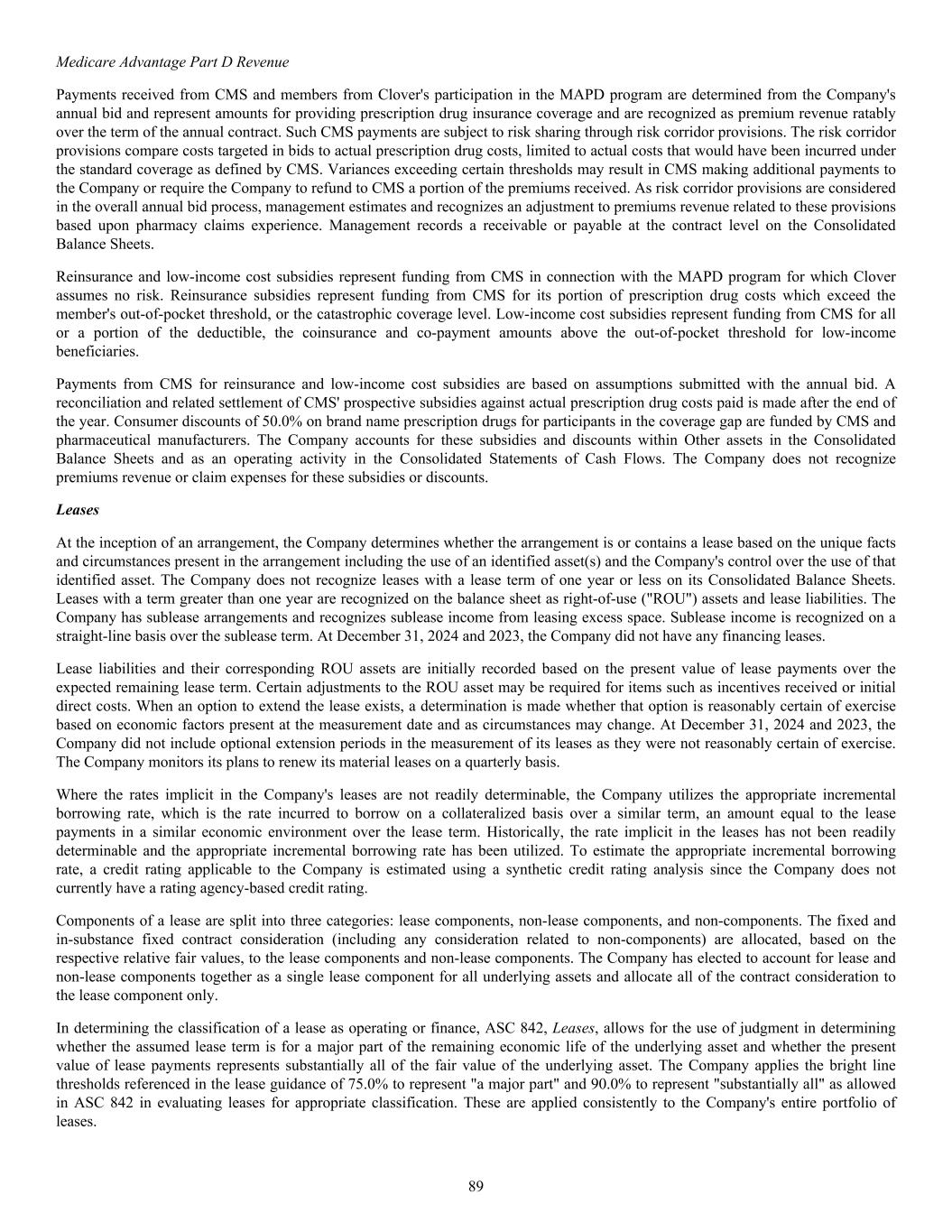 Medicare Advantage Part D从CMS和Clover参与MAPD计划的成员收到的收入付款根据公司的年度投标确定,代表提供处方药保险的金额,并在年度合同期限内按比例确认为保费收入。此类CMS支付通过风险走廊条款进行风险分担。风险走廊条款将投标中的目标成本与实际处方药成本进行比较,仅限于在CMS定义的标准覆盖范围下本应产生的实际成本。超过某些阈值的差异可能会导致CMS向公司支付额外款项或要求公司向CMS退还部分收到的保费。由于风险走廊拨备在总体年度投标过程中被考虑,管理层根据药房索赔经验估计并确认与这些拨备相关的保费收入调整。管理层在合并资产负债表上记录合同一级的应收或应付款项。再保险和低收入成本补贴代表CMS为与MAPD计划相关的资金,Clover不承担风险。再保险补贴是指来自CMS的资金,用于支付其超过会员自付费用门槛或灾难性覆盖水平的部分处方药费用。低收入成本补贴是指由CMS为低收入受益人提供的全部或部分免赔额、共同保险和共同支付金额高于自付门槛的资金。CMS为再保险和低收入成本补贴支付的款项是基于与年度投标一起提交的假设。康哲药业预期补贴与实际支付的处方药费用的对账和相关结算在年底后进行。覆盖缺口参与者品牌处方药50.0%的消费折扣由康哲药业和药品生产企业出资。公司将这些补贴和折扣计入合并资产负债表的其他资产内,并作为一项经营活动计入合并现金流量表。公司不确认这些补贴或折扣的保费收入或索赔费用。租赁在安排开始时,公司根据安排中存在的独特事实和情况,包括使用一项已识别资产以及公司对该已识别资产的使用的控制,确定该安排是否为或包含租赁。公司不在合并资产负债表上确认租赁期为一年或一年以下的租赁。期限超过一年的租赁在资产负债表上确认为使用权(“ROU”)资产和租赁负债。公司有转租安排,确认租赁多余空间的转租收入。转租收入在转租期内按直线法确认。于2024年12月31日及2023年12月31日,公司并无任何融资租赁。租赁负债及其对应的ROU资产按预计剩余租赁期内租赁付款额的现值进行初始入账。对于收到的奖励或初始直接成本等项目,可能需要对ROU资产进行某些调整。当存在延长租赁的选择权时,根据计量日存在的经济因素并视情况可能发生变化,确定该选择权是否合理确定行使。于2024年12月31日及2023年12月31日,公司并未在其租赁的计量中包括可选的延长期,因为它们无法合理地确定行使。该公司每季度监测其续签材料租约的计划。如果公司租赁中隐含的利率不容易确定,公司使用适当的增量借款利率,即在类似期限内以抵押方式借款所产生的利率,金额等于租赁期内类似经济环境下的租赁付款。从历史上看,租赁的内含利率并不容易确定,因此采用了适当的增量借款利率。为估计适当的增量借款利率,由于公司目前没有基于评级机构的信用评级,因此使用合成信用评级分析估计适用于公司的信用评级。租赁的组成部分分为三类:租赁组成部分、非租赁组成部分和非组成部分。固定和实质上的固定合同对价(包括与非组成部分相关的任何对价)进行分配,基于各自的相对公允价值, 到租赁组件和非租赁组件。公司选择将租赁和非租赁部分作为所有基础资产的单一租赁部分一起核算,并将所有合同对价仅分配给租赁部分。在确定租赁分类为经营类还是融资类时,ASC 842,租赁,允许在确定假定的租赁期是否为标的资产剩余经济年限的主要部分以及租赁付款额的现值是否基本上代表了标的资产的全部公允价值时使用判断。在评估租赁以进行适当分类时,该公司应用租赁指引中参考的75.0%代表“主要部分”,以及90.0%代表“基本上所有”的亮线阈值,这在ASC 842中是允许的。这些一致适用于公司的整个租赁组合。89