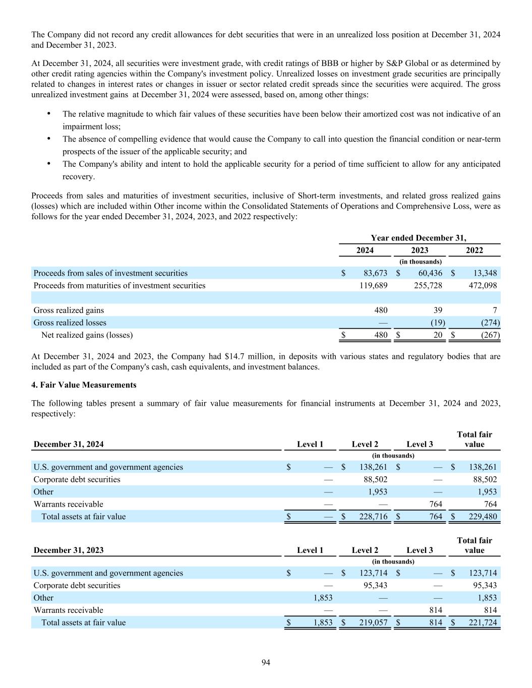 公司没有为2024年12月31日和2023年12月31日处于未实现亏损状态的债务证券记录任何信用备抵。于2024年12月31日,所有证券均为投资级,经标普全球或公司投资政策范围内其他信用评级机构确定的信用评级为BBB或更高。投资级证券的未实现亏损主要与收购证券以来利率变化或发行人或行业相关信用利差变化有关。评估截至2024年12月31日的未实现投资收益毛额的依据,除其他外:•这些证券的公允价值一直低于其摊余成本的相对幅度并不表明存在减值损失;•没有令人信服的证据会导致公司对适用证券发行人的财务状况或近期前景提出质疑;以及•公司持有适用证券一段足以允许任何预期回收的时间的能力和意图。投资证券的销售和到期收益(包括短期投资)以及相关的已实现收益(亏损)毛额(包括在综合经营报表和综合亏损的其他收入中)分别截至2024年12月31日、2023年和2022年12月31日止年度如下:截至12月31日止年度,202420232022(千)销售投资证券所得83,673美元60,436美元13,348投资证券到期所得119,689255,728472,098已实现总收益480397已实现总亏损——(19)(274)已实现净收益(亏损)480美元20美元(267)截至2024年12月31日和2023年12月31日,公司有1470万美元的存款存放在各州和监管机构,这些存款被列为公司现金、现金等价物和投资余额的一部分。4.公允价值计量下表分别汇总了2024年12月31日和2023年12月31日金融工具的公允价值计量情况:2024年12月31日1级2级3级公允价值总额(千美元)美国政府和政府机构美元—— 138,261美元—— 138,261美元公司债务证券—— 88,502 —— 88,502其他—— 1,953 —— 1,953应收认股权证—— 764764公允价值资产总额—— 228,716美元764美元229,480美元12月31日,2023 Level 1 Level 2 Level 3公允价值总额(千)美国政府和政府机构$ — $ 123,714 $ — $ 123,714公司债务证券— 95,343 — 95,343其他1,853 —— 1,853应收认股权证—— 814814公允价值资产总额$ 1,853 $ 219,057 $ 814 $ 221,72494