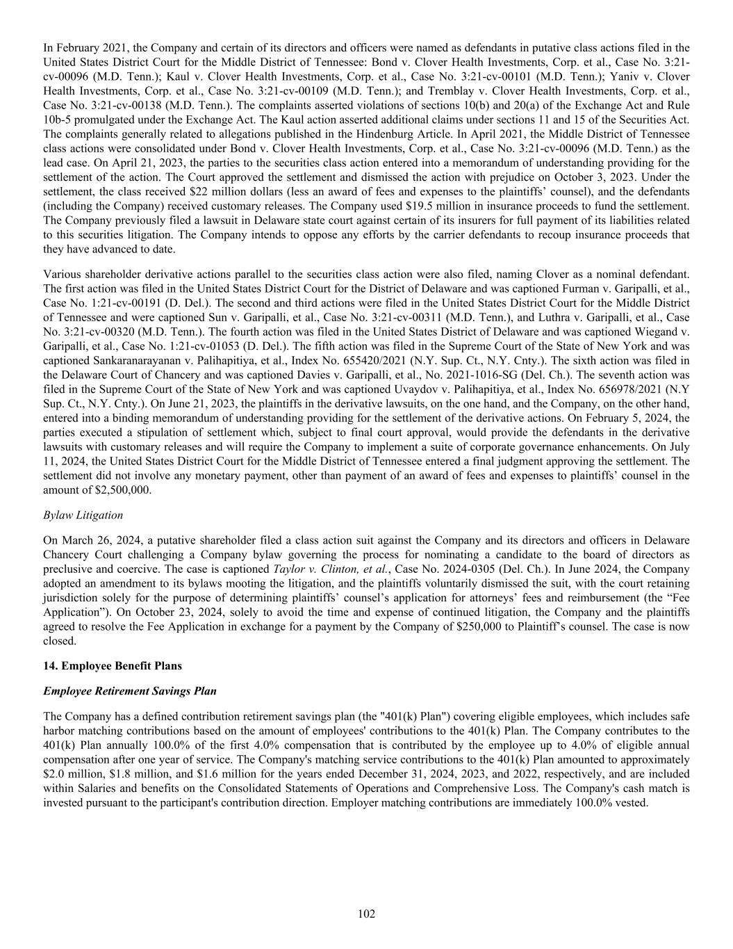 2021年2月,该公司及其某些董事和高级职员在美国田纳西州中区地方法院提起的推定集体诉讼中被列为被告:Bond v. Clover Health Investments, Corp.等人,案件编号3:21-CV-00096(M.D. Tenn.);Kaul v. TERM0等人,案件编号3:21-CV-00101(M.D. Tann.);Yaniv v. TERM0等人,案件编号3:21-CV-00109(M.D. Tann.);Tremblay v. TERM0 Health Investments,Corp. Clover Health Investments, Corp. et al.,Case No. 3:21-CV-00138(M.D. Tann.)。这些投诉声称违反了《交易法》第10(b)和20(a)条以及根据《交易法》颁布的规则10b-5。Kaul诉讼根据《证券法》第11条和第15条提出了额外的索赔要求。这些投诉一般与《兴登堡条款》中公布的指控有关。2021年4月,田纳西州中区集体诉讼在Bond诉Clover Health Investments, Corp.等人案下合并,案件编号3:21-CV-00096(M.D. Tenn.)为主要案件。于2023年4月21日,证券集团诉讼的各方订立谅解备忘录,就诉讼的解决作出规定。法院于2023年10月3日批准和解并驳回诉讼。根据和解协议,该集体获得2200万美元(减去判给原告律师的费用和开支),被告(包括公司)获得了惯常的释放。该公司使用了1950万美元的保险收益来为和解提供资金。该公司此前在特拉华州法院对其某些保险公司提起诉讼,要求其全额支付与此次证券诉讼相关的负债。公司打算反对承运人被告为收回他们迄今为止垫付的保险收益所做的任何努力。与证券集体诉讼平行的各种股东派生诉讼也被提起,将Clover列为名义被告。第一项诉讼在美国特拉华州地区法院提起,标题为Furman v. Garipalli,et al.,Case No. 1:21-CV-00191(D. Del.)。第二项和第三项诉讼在美国田纳西州中区地方法院提起,标题分别为Sun诉Garipalli等人,案件编号3:21-CV-00311(M.D. Tenn.),以及Luthra诉Garipalli等人,案件编号3:21-CV-00320(M.D. Tenn.)。第四项诉讼在美国特拉华州地区提起,标题为Wiegand v. Garipalli,et al.,Case No. 1:21-CV-01053(D. Del.)。第五项诉讼向纽约州最高法院提起,标题为Sankaranarayanan诉Palihapitiya等人,索引号655420/2021(N.Y. Sup. CT.,N.Y. CNTY.)。第六项诉讼向特拉华州衡平法院提起,标题为Davies v. Garipalli,et al.,No. 2021-1016-SG(Del。CH.)。第七项诉讼向纽约州最高法院提起,标题为Uvaydov诉Palihapitiya等人,索引号656978/2021(N.Y Sup. CT.,N.Y. Cnty.)。于2023年6月21日,衍生诉讼的原告一方面与公司订立具约束力的谅解备忘录,就衍生诉讼的和解作出规定。2024年2月5日,双方执行了一项和解约定,在最终法院批准的情况下,该约定将为衍生诉讼中的被告提供习惯性免责,并将要求公司实施一整套公司治理增强措施。2024年7月11日,美国田纳西州中区地方法院作出最终判决,批准和解。除向原告律师支付2500000美元的费用和开支裁决外,和解不涉及任何金钱支付。章程诉讼2024年3月26日,一名推定股东在特拉华州衡平法院对公司及其董事和高级管理人员提起集体诉讼,质疑公司章程规定的董事会候选人提名程序具有排斥性和胁迫性。该案标题为Taylor v. Clinton,et al.,Case No. 2024-0305(Del。CH.)。2024年6月,公司通过了对章程的修订,提出诉讼,原告自愿驳回诉讼,法院保留管辖权,仅用于确定原告律师的律师费和报销申请(“费用申请”)。2024年10月23日,仅为避免继续诉讼的时间和费用,公司和原告同意解决费用申请,以换取公司向原告律师支付25万美元。该案现已结案。14.雇员福利计划雇员退休储蓄计划公司设有一项定额供款退休储蓄计划(「 401(k)计划」),涵盖合资格雇员, 其中包括基于员工对401(k)计划的供款金额的安全港匹配供款。公司每年为401(k)计划提供100.0%的首个4.0%薪酬,该薪酬由雇员在服务一年后提供,最高可达合格年度薪酬的4.0%。截至2024年12月31日、2023年和2022年12月31日止年度,公司对401(k)计划的匹配服务供款分别约为200万美元、180万美元和160万美元,并计入综合运营和综合亏损报表的工资和福利中。公司现金匹配根据参与者的出资方向进行投资。雇主匹配供款立即归属100.0%。102