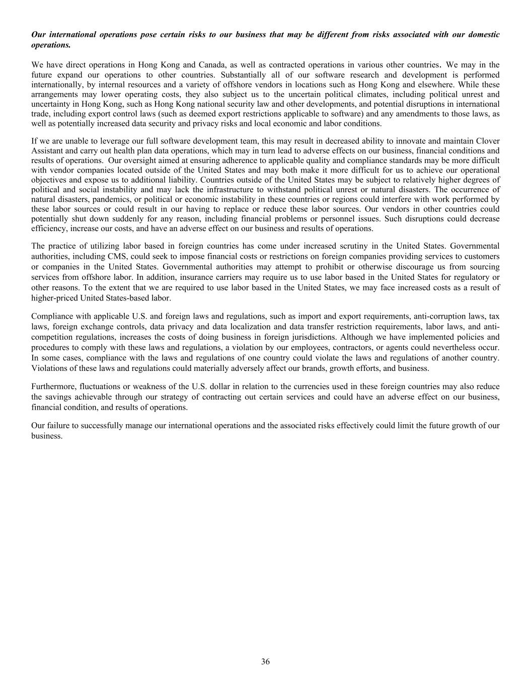 我们的国际业务对我们的业务构成某些风险,这些风险可能不同于与我们的国内业务相关的风险。我们在香港和加拿大有直接业务,在其他多个国家也有承包业务。我们将来可能会把业务扩展到其他国家。基本上我们所有的软件研发都是在国际上进行的,由内部资源和香港和其他地方的各种离岸供应商进行。虽然这些安排可能会降低运营成本,但它们也使我们受到不确定的政治气候的影响,包括香港的政治动荡和不确定性,例如香港国家安全法和其他事态发展,以及国际贸易的潜在中断,包括出口管制法律(例如适用于软件的视为出口限制)和对这些法律的任何修订,以及潜在增加的数据安全和隐私风险以及当地经济和劳动条件。如果我们无法利用我们完整的软件开发团队,这可能会导致创新和维护Clover Assistant以及开展健康计划数据运营的能力下降,进而可能对我们的业务、财务状况和运营结果产生不利影响。我们旨在确保遵守适用的质量和合规标准的监督对于位于美国以外的供应商公司来说可能更加困难,并且可能使我们更难实现我们的运营目标并使我们承担额外的责任。美国以外的国家可能受到相对更高程度的政治和社会不稳定影响,可能缺乏抵御政治动荡或自然灾害的基础设施。这些国家或地区发生自然灾害、流行病或政治或经济不稳定,可能会干扰这些劳动力来源开展的工作,或可能导致我们不得不更换或减少这些劳动力来源。我们在其他国家的供应商可能会因为任何原因突然关闭,包括财务问题或人员问题。此类中断可能会降低效率,增加我们的成本,并对我们的业务和运营结果产生不利影响。利用以外国为基地的劳动力的做法在美国受到了越来越多的审查。包括CMS在内的政府当局可能会寻求对在美国为客户或公司提供服务的外国公司施加财务成本或限制。政府当局可能会试图禁止或以其他方式阻止我们从离岸劳工那里采购服务。此外,出于监管或其他原因,保险公司可能会要求我们使用位于美国的劳动力。在一定程度上,我们被要求使用以美国为基地的劳动力,我们可能会因为以美国为基地的劳动力价格更高而面临成本增加。遵守适用的美国和外国法律法规,例如进出口要求、反腐败法、税法、外汇管制、数据隐私和数据本地化以及数据转移限制要求、劳动法和反竞争法规,增加了在外国司法管辖区开展业务的成本。虽然我们已执行政策和程序以遵守这些法律法规,但我们的员工、承包商或代理商的违规行为仍可能发生。在有些情况下,遵守一国的法律法规可能违反另一国的法律法规。违反这些法律法规可能会对我们的品牌、增长努力和业务产生重大不利影响。此外,美元相对于这些外国使用的货币的波动或疲软也可能减少通过我们将某些服务外包的战略可实现的节省,并可能对我们的业务、财务状况和经营业绩产生不利影响。我们未能有效管理我们的国际业务和相关风险,可能会限制我们业务的未来增长。36