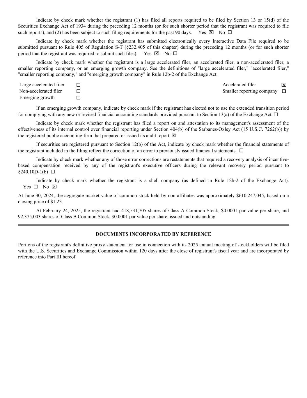 用复选标记表明注册人(1)在过去12个月内(或要求注册人提交此类报告的较短期限内)是否已提交1934年证券交易法第13或15(d)条要求提交的所有报告,以及(2)在过去90天内是否已遵守此类提交要求。是x否o用复选标记表明注册人在过去12个月内(或要求注册人提交此类文件的较短期限内)是否以电子方式提交了根据S-T规则第405条(本章第232.405条)要求提交的每个交互式数据文件。是x否o用复选标记表明注册人是大型加速申报人、加速申报人、非加速申报人、较小的报告公司还是新兴成长型公司。见《交易法》第12b-2条中“大型加速申报人”、“加速申报人”、“小型报告公司”、“新兴成长型公司”的定义。大型加速申报人o加速申报人x非加速申报人o较小的报告公司o新兴成长型公司o如果是新兴成长型公司,请用复选标记表明注册人是否选择不使用延长的过渡期来遵守根据《交易法》第13(a)节规定的任何新的或修订的财务会计准则。☐用复选标记表明注册人是否已就其管理层对编制或出具审计报告的注册会计师事务所根据《萨班斯-奥克斯利法案》(15 U.S.C.7262(b))第404(b)节对其财务报告内部控制有效性的评估提交报告和证明。如果证券是根据该法第12(b)节进行登记的,请用复选标记表明备案中包含的注册人的财务报表是否反映了对先前发布的财务报表的错误更正。o用复选标记表明这些错误更正中是否有任何重述需要对注册人的任何执行官根据§ 240.10D-1(b)在相关恢复期间收到的基于激励的薪酬进行恢复分析o用复选标记表明注册人是否为空壳公司(定义见《交易法》第12b-2条)。是o否x截至2024年6月30日,非关联公司持有的普通股总市值约为610,247,045美元,基于1.23美元的收盘价。截至2025年2月24日,注册人已发行和流通的A类普通股418,531,705股,每股面值0.0001美元,B类普通股92,375,003股,每股面值0.0001美元。以引用方式并入的文件注册人最终代理声明中用于2025年年度股东大会的部分将在注册人的财政年度结束后120天内提交给美国证券交易委员会,并通过引用方式并入本协议第三部分。