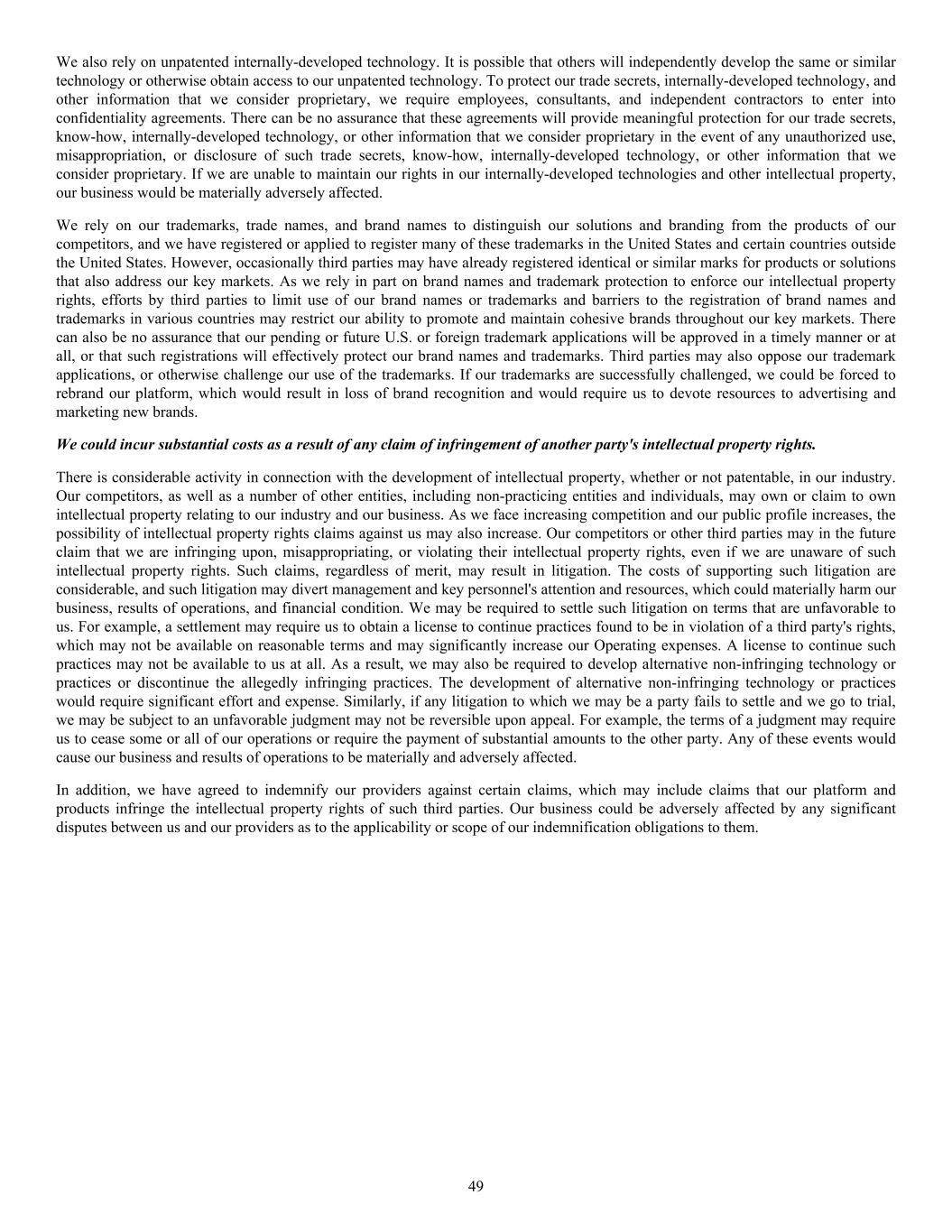 我们还依赖未获得专利的内部开发技术。有可能其他人会独立开发相同或相似的技术或以其他方式获得我们的非专利技术。为保护我们的商业秘密、内部开发的技术以及我们认为专有的其他信息,我们要求员工、顾问和独立承包商签订保密协议。无法保证这些协议将为我们的商业秘密、专有技术、内部开发的技术或我们认为专有的其他信息提供有意义的保护,以防此类商业秘密、专有技术、内部开发的技术或我们认为专有的其他信息发生任何未经授权的使用、盗用或泄露。如果我们无法维护我们在内部开发的技术和其他知识产权方面的权利,我们的业务将受到重大不利影响。我们依靠我们的商标、商品名称和品牌名称将我们的解决方案和品牌与竞争对手的产品区分开来,我们已经在美国和美国以外的某些国家注册或申请注册了许多此类商标。然而,偶尔第三方可能已经为同样针对我们关键市场的产品或解决方案注册了相同或相似的标记。由于我们部分依赖品牌名称和商标保护来强制执行我们的知识产权,第三方限制使用我们的品牌名称或商标的努力以及在各国注册品牌名称和商标的障碍可能会限制我们在整个关键市场推广和维持具有凝聚力的品牌的能力。也无法保证我们的未决或未来的美国或外国商标申请将及时或完全获得批准,或者此类注册将有效保护我们的品牌名称和商标。第三方也可能反对我们的商标申请,或以其他方式质疑我们对商标的使用。如果我们的商标被成功挑战,我们可能会被迫对我们的平台进行品牌重塑,这将导致品牌认知度的丧失,并要求我们将资源用于广告和营销新品牌。我们可能会因任何侵犯另一方知识产权的索赔而产生大量费用。在我们的行业中,与知识产权的发展相关的活动相当多,无论是否可申请专利。我们的竞争对手,以及许多其他实体,包括非执业实体和个人,可能拥有或声称拥有与我们的行业和业务相关的知识产权。随着我们面临日益加剧的竞争和我们的公众形象增加,对我们提出知识产权索赔的可能性也可能增加。我们的竞争对手或其他第三方未来可能会声称我们正在侵犯、盗用或侵犯他们的知识产权,即使我们对这些知识产权并不知情。这类索赔,无论案情如何,都可能导致诉讼。支持此类诉讼的成本相当可观,此类诉讼可能会转移管理层和关键人员的注意力和资源,这可能会对我们的业务、经营业绩和财务状况造成重大损害。我们可能被要求以对我们不利的条款解决此类诉讼。例如,和解可能要求我们获得许可,以继续被发现侵犯第三方权利的做法,这可能无法以合理的条款获得,并可能显着增加我们的运营费用。我们可能根本无法获得继续此类做法的许可。因此,我们还可能被要求开发替代的非侵权技术或做法,或停止涉嫌侵权的做法。开发替代的非侵权技术或做法将需要大量的努力和费用。同样,如果我们可能是一方当事人的任何诉讼未能解决,我们进行审判,我们可能会受到不利的判决,可能无法在上诉时逆转。例如,判决条款可能要求我们停止部分或全部业务或要求向另一方支付大量款项。任何这些事件都将导致我们的业务和经营业绩受到重大不利影响。此外,我们已同意就某些索赔对我们的提供商进行赔偿,其中可能包括我们的平台和产品侵犯此类第三方的知识产权的索赔。我们的业务可能会受到我们与我们的供应商之间关于我们对他们的赔偿义务的适用性或范围的任何重大争议的不利影响。49