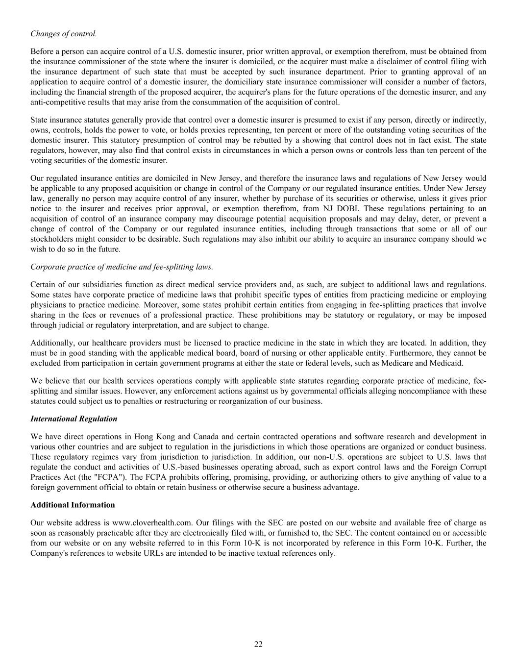 控制权变更。一个人在获得美国国内保险人的控制权之前,必须事先获得保险人住所所在州的保险专员的书面批准或豁免,或者收购人必须向该州的保险部门作出控制权备案的免责声明,该声明必须得到该保险部门的接受。在批准收购国内保险公司控制权的申请之前,住所地国家保险专员将考虑多个因素,包括拟议收购方的资金实力、收购方对国内保险公司未来运营的计划,以及完成收购控制权可能产生的任何反竞争结果。州保险法规一般规定,如果任何人直接或间接拥有、控制、拥有投票权或持有代表国内保险公司已发行有表决权证券的百分之十或更多的代理人,则推定对国内保险公司的控制权存在。这种控制权的法定推定可能会被证明控制权实际上并不存在而反驳。然而,州监管机构也可能会发现,在一个人拥有或控制国内保险公司投票证券的比例低于10%的情况下,存在控制权。我们受监管的保险实体的住所位于新泽西州,因此新泽西州的保险法律法规将适用于公司或我们受监管的保险实体的任何拟议收购或控制权变更。根据新泽西州法律,一般来说,任何人不得通过购买其证券或其他方式获得任何保险公司的控制权,除非该公司事先通知保险公司并获得NJ DOBI的事先批准或豁免。这些与收购保险公司控制权有关的规定可能会阻止潜在的收购提议,并可能会延迟、阻止或阻止公司或我们受监管的保险实体的控制权变更,包括通过我们的一些或所有股东可能认为可取的交易。如果我们希望将来收购一家保险公司,这样的规定也可能会抑制我们的收购能力。医药和分费法的企业实践。我们的某些子公司作为直接医疗服务提供商运作,因此受到额外法律法规的约束。一些州有企业行医法,禁止特定类型的实体行医或雇用医生行医。此外,一些州禁止某些实体从事涉及分享专业实践的费用或收入的分费做法。这些禁令可能是法定的或监管的,也可能是通过司法或监管解释施加的,并且可能会发生变化。此外,我们的医疗保健提供者必须获得在其所在州行医的许可。此外,他们还必须在适用的医疗委员会、护理委员会或其他适用实体中具有良好的信誉。此外,不能将他们排除在参与州或联邦一级的某些政府项目之外,例如医疗保险和医疗补助。我们认为,我们的健康服务运营符合适用的州法规,涉及企业行医、费用分摊和类似问题。然而,政府官员指控不遵守这些法规而对我们采取的任何执法行动可能会使我们受到处罚或重组或重组我们的业务。国际监管我们在香港和加拿大有直接业务,在其他多个国家有某些承包业务和软件研发,并受组织这些业务或开展业务的司法管辖区的监管。这些监管制度因法域而异。此外,我们的非美国业务受美国法律的约束,这些法律规范了在海外经营的美国企业的行为和活动,例如出口管制法和《反海外腐败法》(“FCPA”)。FCPA禁止提供、承诺、提供或授权他人向外国政府官员提供任何有价值的东西,以获得或保留业务或以其他方式获得业务优势。附加信息我们的网站地址是www.cloverhealth.com。我们向SEC提交的文件将发布在我们的网站上,并在以电子方式向SEC提交或提供给SEC后,在合理可行的范围内尽快免费提供。我们网站或本10-K表格中提及的任何网站上包含或可访问的内容不以引用方式并入本10-K表格。此外, 该公司对网站URL的引用仅旨在作为非活动文本引用。22