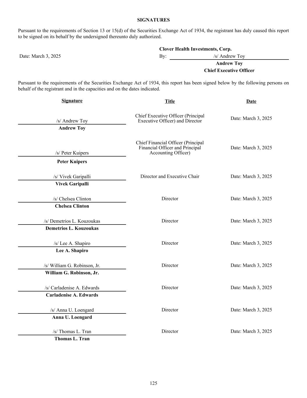 签名根据1934年《证券交易法》第13或15(d)节的要求,注册人已正式安排由以下签署人正式授权代表其签署本报告。Clover Health Investments, Corp.日期:2025年3月3日由:/s/Andrew Toy Andrew Toy首席执行官根据1934年《证券交易法》的要求,本报告已由以下人员代表注册人并以所示身份和日期在下方签署。署名日期/s/Andrew Toy首席执行官(首席执行官)兼董事日期:2025年3月3日Andrew Toy/s/Peter Kuipers 首席财务官(首席财务官兼首席会计官)日期:2025年3月3日Peter Kuipers/s/Vivek Garipalli董事兼执行主席日期:2025年3月3日Vivek Garipalli/s/Chelsea Clinton董事日期:2025年3月3日Chelsea Clinton/s/Demetrios L. Kouzoukas董事日期:2025年3月3日Demetrios L. Kouzoukas/s/Lee A. Shapiro董事日期:2025年3月3日Lee A. Shapiro/s/William G. Robinson, Jr.董事日期:3月3日,2025 William G. Robinson, Jr./s/Carladenise A. Edwards董事日期:2025年3月3日Carladenise A. Edwards/s/Anna U. Loengard董事日期:2025年3月3日Anna U. Loengard/s/Thomas L. Tran董事日期:2025年3月3日Thomas L. Tran 125