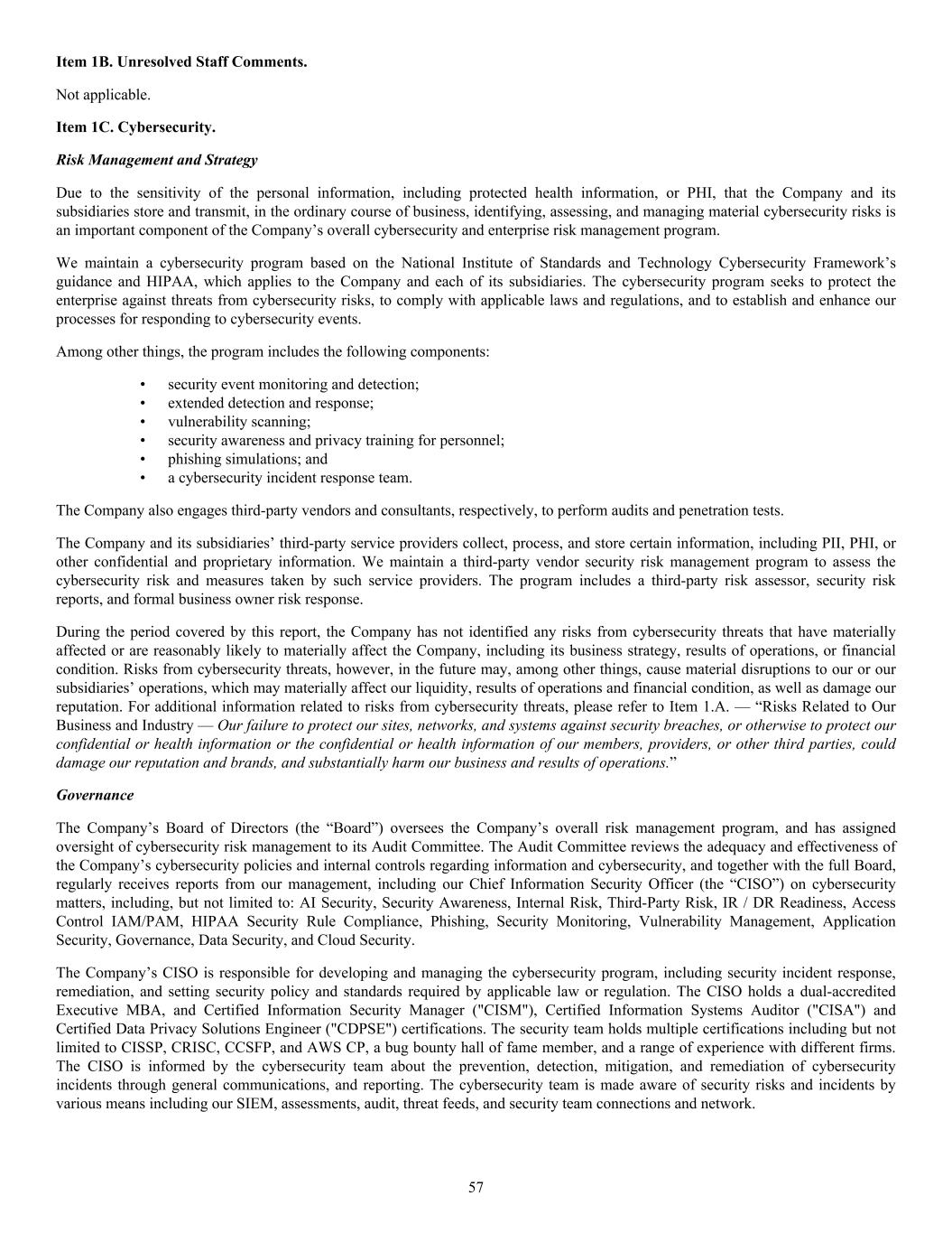 项目1b。未解决的员工评论。不适用。项目1c。网络安全。风险管理和战略由于公司及其子公司存储和传输的个人信息,包括受保护的健康信息或PHI的敏感性,在日常业务过程中,识别、评估和管理重大网络安全风险是公司整体网络安全和企业风险管理方案的重要组成部分。我们根据美国国家标准研究院网络安全框架的指导意见和HIPAA维护网络安全计划,该计划适用于公司及其每个子公司。网络安全计划旨在保护企业免受网络安全风险的威胁,遵守适用的法律法规,并建立和加强我们应对网络安全事件的流程。除其他外,该方案包括以下组成部分:•安全事件监测和检测;•扩展检测和响应;•漏洞扫描;•人员的安全意识和隐私培训;•网络钓鱼模拟;•网络安全事件响应小组。该公司还分别聘请第三方供应商和顾问进行审计和渗透测试。公司及其子公司的第三方服务提供商收集、处理和存储某些信息,包括PII、PHI或其他机密和专有信息。我们维护第三方供应商安全风险管理计划,以评估此类服务提供商的网络安全风险和采取的措施。该计划包括第三方风险评估师、安全风险报告、正式的企业主风险响应。在本报告所述期间,公司没有发现任何来自网络安全威胁的风险,这些风险已对公司产生重大影响或有合理可能对公司产生重大影响,包括其业务战略、经营业绩或财务状况。然而,未来来自网络安全威胁的风险可能(其中包括)对我们或我们子公司的运营造成重大干扰,这可能会对我们的流动性、运营结果和财务状况产生重大影响,并损害我们的声誉。有关网络安全威胁风险的更多信息,请参阅项目1.A. ——“与我们的业务和行业相关的风险——我们未能保护我们的站点、网络和系统免受安全漏洞的侵害,或未能以其他方式保护我们的机密或健康信息或我们的会员、提供商或其他第三方的机密或健康信息,可能会损害我们的声誉和品牌,并对我们的业务和经营业绩造成重大损害。”治理公司董事会(“董事会”)监督公司的整体风险管理计划,并将网络安全风险管理的监督工作分配给其审计委员会。审计委员会审查公司有关信息和网络安全的网络安全政策和内部控制的充分性和有效性,并与全体董事会一起,定期收到我们的管理层,包括我们的首席信息安全官(“CISO”)关于网络安全事项的报告,包括但不限于:人工智能安全、安全意识、内部风险、第三方风险、IR/DR准备、访问控制IAM/PAM、HIPAA安全规则合规、网络钓鱼、安全监控、漏洞管理、应用程序安全、治理、数据安全和云安全。公司的CISO负责制定和管理网络安全计划,包括安全事件响应、补救以及制定适用法律或法规要求的安全政策和标准。CISO持有双重认证的执行MBA、认证信息安全管理师(“CISM”)、认证信息系统审计员(“CISA”)和认证数据隐私解决方案工程师(“CDPSE”)认证。该安全团队拥有多项认证,包括但不限于CISSP、CRISC、CCSFP和AWS CP、Bug Bounty名人堂成员,以及在不同公司的一系列经验。通过一般通信、报告等方式向网络安全团队通报网络安全事件的预防、检测、缓解、整治等情况,并向CISO网络安全团队通过包括我们的SIEM、评估、审计、威胁馈送、安全团队连接和网络在内的各种手段了解安全风险和事件。57