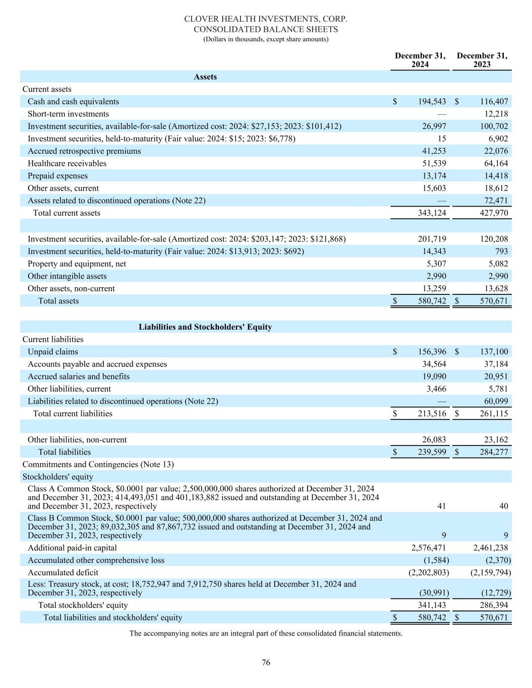CLOVER Health Investments,CORP。合并资产负债表(单位:千美元,股份金额除外)2024年12月31日2023年12月31日资产流动资产现金和现金等价物194,543美元116,407美元短期投资— 12,218份投资证券,可供出售(摊余成本:2024年:27,153美元;2023年:101,412美元)26,997100,702份投资证券,持有至到期(公允价值:2024年:15美元;2023年:6,778美元)156,902应计追溯溢价41,25322,076医疗保健应收款51,53964,164预付费用13,17414,418其他资产,流动15,60318,612与终止经营相关的资产(附注22)— 72,471流动资产总额343,124427,970投资证券,可供出售(摊余成本:2020持有至到期(公允价值:2024年:13,913美元;2023年:692美元)14,343793财产和设备,净额5,3075,082其他无形资产2,9902,990其他资产,非流动13,25913,628总资产580,742美元570,671美元负债和股东权益流动负债未付债权156,396美元137,100美元应付账款和应计费用34,56437,184应计工资和福利19,09020,951其他负债,流动3,4665,781与终止经营相关的负债(附注22)— 60,099流动负债总额213,516美元261,115其他负债,非流动26,08323,162负债总额239,599美元284,277美元承诺和或有事项(注13)股东权益A类普通股,0.0001美元面值;2,500,000,000股于2024年12月31日和2023年12月31日授权;414,493,051股和401,183,882股于2024年12月31日和2023年12月31日已发行和流通,分别为4140股B类普通股,面值0.0001美元;500,000,000股于2024年12月31日和2023年12月31日授权;89,032,305股和87,867,732股于2024年12月31日和2023年12月31日已发行和流通,分别为99 额外实收资本 2,576,4712,461,238累计其他综合亏损(1,584)(2,370)累计亏损(2,202,803)(2,159,794)减:库存股,按成本计算;于2024年12月31日和2023年12月31日分别持有18,752,947股和7,912,750股,分别(30,991)(12,729)股东权益总额341,143286,394负债和股东权益总额580,742美元570,671美元随附的附注是这些综合财务报表的组成部分。76