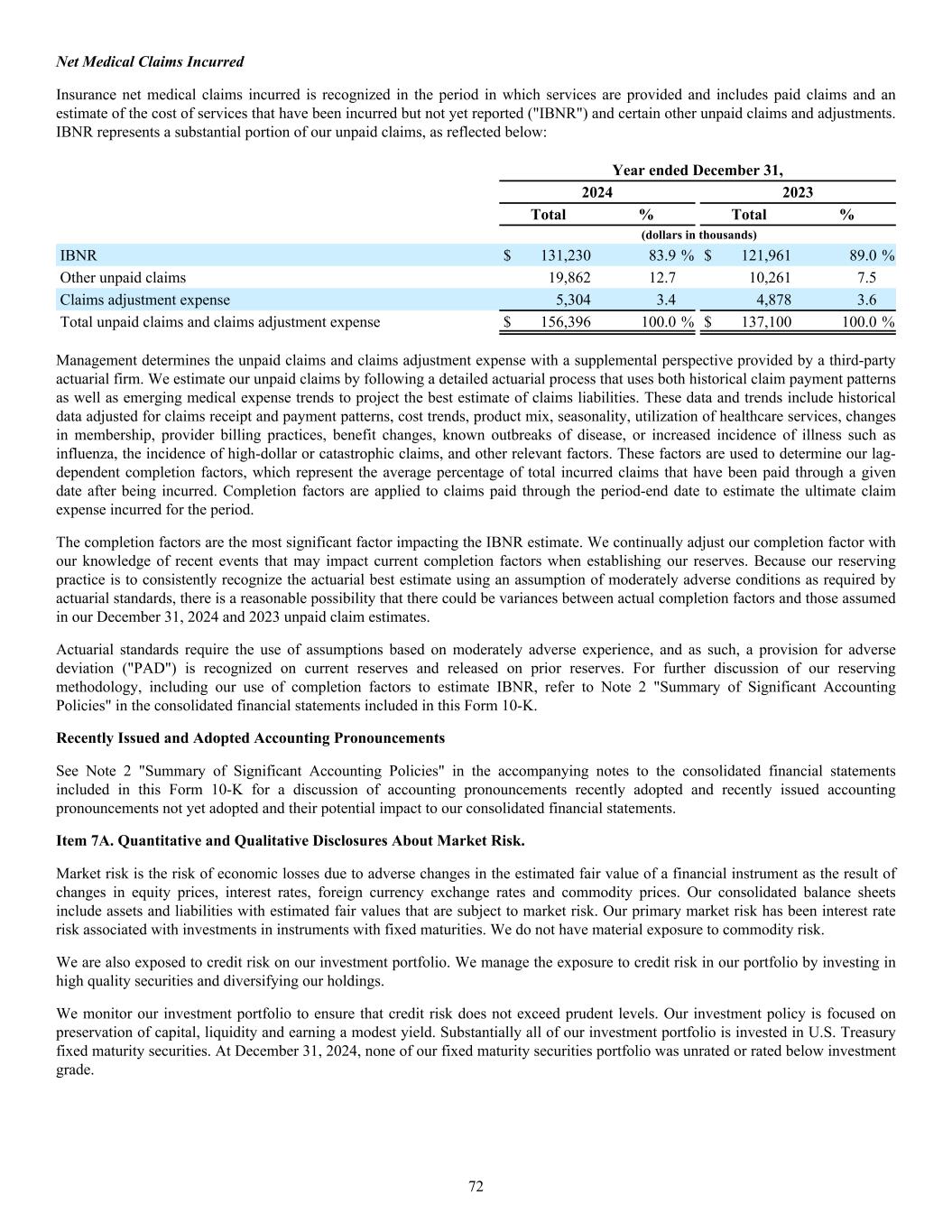 发生的净医疗索赔保险发生的净医疗索赔在提供服务期间确认,包括已支付的索赔和已发生但尚未报告的服务成本估计(“IBNR”)以及某些其他未支付的索赔和调整。IBNR代表了我们未付索赔的很大一部分,如下所示:截至2024年12月31日的年度2023 Total % Total %(单位:千美元)IBNR $ 131,23083.9% $ 121,96189.0%其他未付索赔19,86212.7 10,2617.5索赔调整费用5,3043.44,8783.6未付索赔和索赔调整费用总额156,396100.0% 137,100美元100.0%管理层通过第三方精算公司提供的补充视角确定未付索赔和索赔调整费用。我们通过遵循一个详细的精算过程来估计我们的未付索赔,该过程使用历史索赔支付模式以及新出现的医疗费用趋势来预测索赔负债的最佳估计。这些数据和趋势包括根据索赔接收和支付模式、成本趋势、产品组合、季节性、医疗保健服务的使用、成员的变化、提供者的计费做法、福利变化、已知的疾病爆发或流感等疾病发病率增加、高美元或灾难性索赔的发生率以及其他相关因素进行调整的历史数据。这些因素被用来确定我们的滞后依赖完成因素,它们表示在发生后通过特定日期已支付的已发生索赔总额的平均百分比。完成系数适用于截至期末已支付的索赔,以估计该期间发生的最终索赔费用。完成因素是影响IBNR估计的最重要因素。在建立我们的储备时,我们会根据我们对可能影响当前完成因素的近期事件的了解,不断调整我们的完成因素。由于我们的准备金做法是使用精算标准要求的适度不利条件假设来一致确认精算最佳估计,因此实际完成因素与我们在2024年12月31日和2023年12月31日未付索赔估计中假设的因素之间存在差异的合理可能性。精算标准要求使用基于中度不利经验的假设,因此,在当前准备金上确认不利偏差准备金(“PAD”),并在先前准备金上释放。有关我们的准备金方法的进一步讨论,包括我们使用完工因素来估计IBNR,请参阅本10-K表中包含的合并财务报表中的附注2“重要会计政策摘要”。最近发布和采用的会计公告请参阅本10-K表中包含的合并财务报表附注中的附注2“重要会计政策摘要”,以讨论最近采用和最近发布的尚未采用的会计公告及其对我们的合并财务报表的潜在影响。项目7a。关于市场风险的定量和定性披露。市场风险是指由于股权价格、利率、外币汇率和商品价格的变动,导致金融工具的估计公允价值发生不利变化而造成经济损失的风险。我们的综合资产负债表包括估计公允价值的资产和负债,这些资产和负债受到市场风险的影响。我们的主要市场风险一直是与固定期限工具投资相关的利率风险。我们没有大宗商品风险的实质性敞口。我们的投资组合也面临信用风险。我们通过投资于优质证券和分散持股来管理投资组合中的信用风险敞口。我们监控我们的投资组合,以确保信用风险不超过审慎水平。我们的投资政策侧重于保本、流动性和赚取适度的收益率。基本上我们所有的投资组合都投资于美国国债固定期限证券。截至2024年12月31日,我们的固定期限证券投资组合中没有一个没有评级或评级低于投资级。72