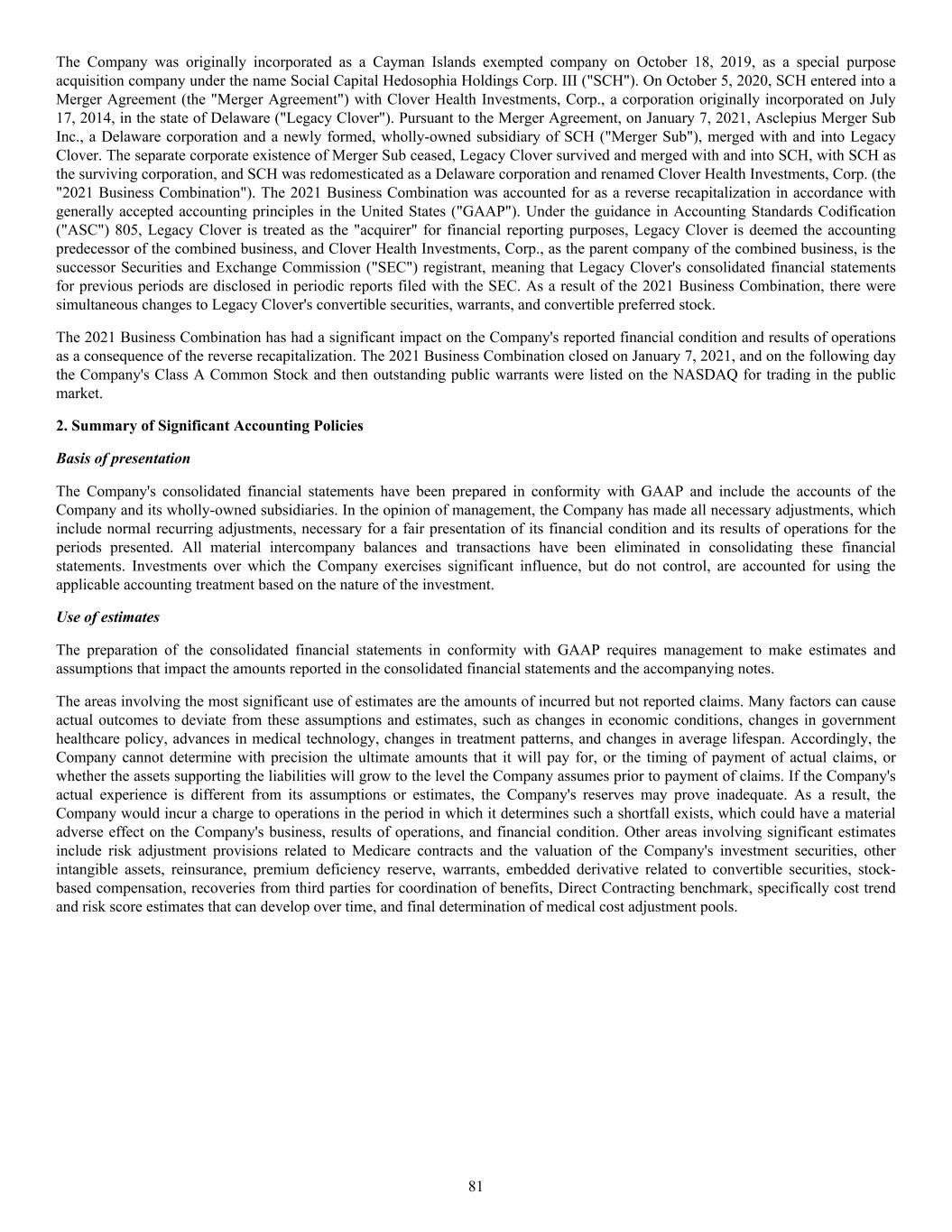 该公司最初于2019年10月18日作为开曼群岛豁免公司注册成立,作为一家特殊目的收购公司,名称为Social Capital Hedosophia Holdings Corp. III(“SCH”)。2020年10月5日,SCH与Clover Health Investments, Corp.(一家最初于2014年7月17日在特拉华州注册成立的公司)签订了合并协议(“合并协议”)(“Legacy Clover”)。根据合并协议,于2021年1月7日,Asclepius Merger Sub Inc.,一家特拉华州公司和SCH新成立的全资子公司(“Merger Sub”)与Legacy Clover合并并入Legacy Clover。Merger Sub的单独公司存在终止,Legacy Clover存续并与SCH合并,SCH作为存续公司,SCH被重新调整为特拉华州公司并更名为Clover Health Investments, Corp.(“2021年业务合并”)。根据美国公认会计原则(“GAAP”),2021年业务合并作为反向资本重组入账。根据会计准则编纂(“ASC”)805的指导,出于财务报告目的,Legacy Clover被视为“收购方”,Legacy Clover被视为合并后业务的会计前身,而作为合并后业务的母公司,Clover Health Investments, Corp.是继任的美国证券交易委员会(“SEC”)注册人,这意味着Legacy Clover以前期间的合并财务报表在向SEC提交的定期报告中披露。由于2021年的业务合并,Legacy Clover的可转换证券、认股权证和可转换优先股同时发生变化。由于反向资本重组,2021年业务合并对公司报告的财务状况和经营业绩产生了重大影响。2021年业务合并于2021年1月7日结束,次日公司的A类普通股和当时已发行的公开认股权证在纳斯达克上市并在公开市场交易。2.重要会计政策摘要列报基础公司的合并财务报表是按照公认会计原则编制的,包括公司及其全资子公司的账目。管理层认为,公司已作出一切必要调整,包括正常的经常性调整,这是公平列报其财务状况和列报期间的经营业绩所必需的。所有重要的公司间余额和交易已在合并这些财务报表时消除。公司对其实施重大影响但不具有控制权的投资,根据投资性质采用适用的会计处理方法进行会计处理。使用估计按照公认会计原则编制合并财务报表要求管理层作出影响合并财务报表和所附附注中报告的金额的估计和假设。涉及估计使用最重要的领域是已发生但未报告的索赔金额。许多因素会导致实际结果偏离这些假设和估计,例如经济状况的变化、政府医疗保健政策的变化、医疗技术的进步、治疗模式的变化以及平均寿命的变化。因此,公司无法精确确定其将支付的最终金额,或实际债权的支付时间,或支持负债的资产是否会增长到公司在支付债权之前承担的水平。如果公司的实际经验与其假设或估计不同,公司的储备可能被证明是不足的。因此,公司将在其确定存在此种短缺的期间内对运营产生费用,这可能对公司的业务、经营业绩和财务状况产生重大不利影响。其他涉及重大估计的领域包括与医疗保险合同和公司投资证券估值相关的风险调整条款、其他无形资产、再保险、保费不足准备金、认股权证、与可转换证券相关的嵌入式衍生工具、基于股票的补偿、为协调利益而从第三方进行的追偿、直接合同基准,特别是随着时间的推移可能发展的成本趋势和风险评分估计,以及最终确定医疗成本调整池。81
