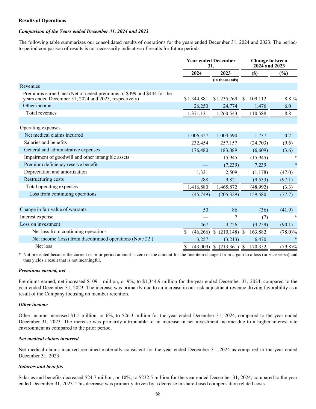 截至2024年12月31日和2023年12月31日止年度的经营业绩比较下表汇总了我们截至2024年12月31日和2023年12月31日止年度的综合经营业绩。结果的期间与期间比较并不一定表明未来期间的结果。截至12月31日止年度,2024至202320242023($)(%)(单位:千)收入保费收入,净额(扣除截至2024年12月31日和2023年12月31日止年度的分出保费399美元和444美元,分别)1,344,881美元1,235,769美元109,1128.8%其他收入26,25024,7741,4766.0总收入1,371,1311,260,543110,5888.8营业费用发生的医疗索赔净额1,006,3271,004,5901,7370.2工资和福利232,454257,157(24,703)(9.6)一般和行政费用176,480183,089(6,609)(3.6)商誉和其他无形资产减值— 15,945(15,945)*保费不足准备金利益—(7,239)7,239*折旧及摊销1,3312,509(1,178)(47.0)重组费用2889,821(9,533)(97.1)营业费用总额1,416,8801,465,872(48,992)(3.3)持续经营亏损(45,749)(205,329)159,580(77.7)认股权证公允价值变动5086(36)(41.9)利息费用— 7(7)*投资亏损4674,726(4,259)(90.1)持续经营净亏损$(46,266)$(210,148)$ 163,882(78.0)%终止经营净收益(亏损)(附注22)3,257(3,213)6,470*净亏损$(43,009)$(213,361)$ 170,352(79.8)%*因本期或上期金额为零而未列报或该项目的金额从收益变为损失(或反之亦然),从而产生一个没有意义的结果。与截至2023年12月31日止年度相比,截至2024年12月31日止年度已赚保费净额增加1.091亿美元,或9%,至13.449亿美元。这一增长主要是由于公司专注于会员保留,我们的风险调整收入增加推动了好感度。其他收入截至2024年12月31日止年度,与截至2023年12月31日止年度相比,其他收入增加150万美元,即6%,至2630万美元。增加的主要原因是,与上一期间相比,利率环境较高,导致净投资收入增加。发生的医疗索赔净额与截至2023年12月31日止年度相比,截至2024年12月31日止年度发生的医疗索赔净额基本保持一致。与截至2023年12月31日止年度相比,截至2024年12月31日止年度的工资和福利减少2470万美元,或10%,至2.325亿美元。这一减少主要是由于与股份薪酬相关的成本减少。68