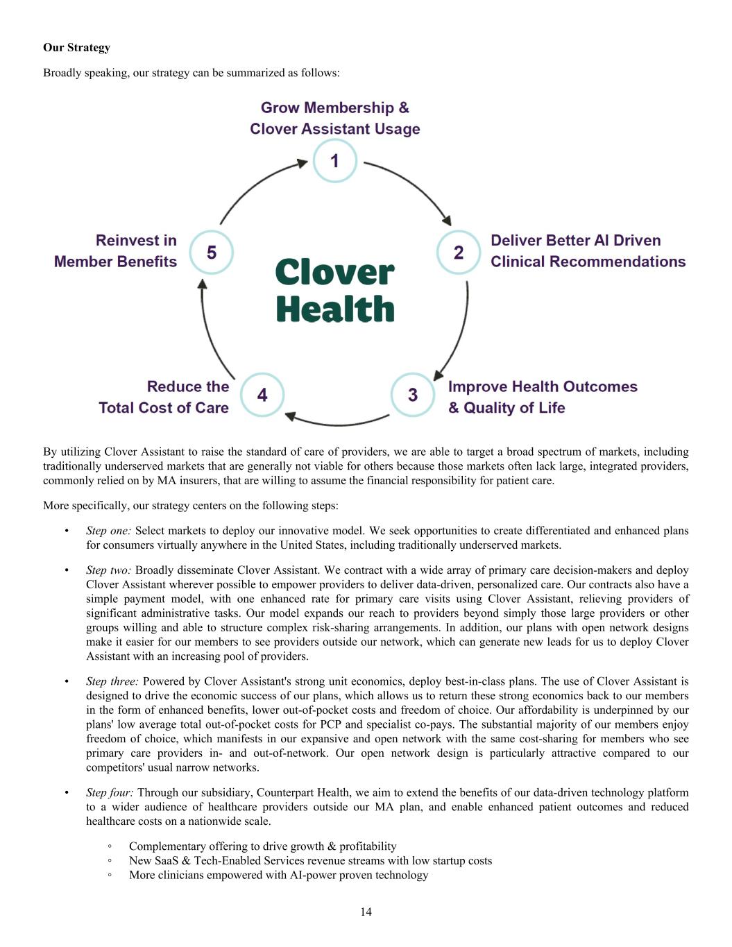 第一部分第1项。生意。General在Clover Health,我们的愿景是用技术赋能每一位医生,让他们能够更早地识别、管理和治疗慢性病。这导致更早的诊断和治疗、更早的疾病管理以及更负担得起和更容易获得的护理。我们的战略是改善我们的医疗保险受益人的护理,发展广泛的医生网络,并提供技术帮助赋予医生权力。我们的专有软件平台Clover Assistant(外部授权为Counterpart Assistant)通过使医生能够比其他方式更好地检测、识别和管理慢性疾病,帮助我们执行这一策略。这项技术是一个基于云的软件平台,它管理来自100多个数据源的医疗记录,并为医生提供访问数据驱动的见解和为患者提供的个性化护理建议。我们的差异化方法可以总结如下:(1)代表Clover Health 2024年全年的MCR和BER比率,以及截至提交本10-K表格时已报告结果的其他采用“传统MA计划”方法的公众公司的最新结果。(2)保险福利费用率(“BER”)是一种非公认会计准则财务指标。我们计算我们的保险BER的方法是,将保险发生的净医疗费用和质量改进的总和,并将该总和除以在特定时期内按净额赚取的保费。提供者使用Clover Assistant可实现数据驱动的临床决策,从而使我们的成员受益并推动快速的软件迭代:提供者使用Clover Assistant的次数越多,它学习的内容就越多,并促进了个性化数据驱动建议的精准性。我们将我们的受益数据与供应商生成的数据相结合,并使用这个强大的闭环反馈循环不断微调我们专有的临床规则和机器学习模型,以及选择和优先考虑未来的软件能力。我们认为,Clover Assistant的使用和持续改进不仅改善了临床决策,而且增强了MA计划绩效。该平台有助于为我们的临床项目识别和接触我们风险最高的成员。这些计划旨在提供额外的定向护理支持,并进一步推动更好的计划绩效。我们在首选提供商组织(“OPPO”)和健康维护组织(“HMO”)计划中利用Clover Assistant。我们的目标是提供负担得起的高质量医疗保健,我们在我们的Medicare Advantage(“MA”)计划中为我们的大多数成员(简称“成员”)提供的平均自付费用最低的初级保健提供者(“PCP”)和专家共同支付在各自的市场中。我们坚信为我们的会员提供供应商选择,并认为我们的OPPO计划是我们的旗舰保险产品。我们MA产品的一个重要特点是其广泛的医生网络。我们经常为与网络内和网络外的初级保健提供者的就诊提供相同的费用分摊(共付额和免赔额)。我们通过使用Clover Assistant为提供者的患者(我们的成员)提供直观的数据驱动的个性化见解,从而在我们广泛的网络上管理护理。我们认为,这使提供者能够做出更好的临床决策。我们接触到广泛的消费者,包括传统上服务不足的市场。2025年1月1日,我们在五个州和200个县实施了MA计划。8