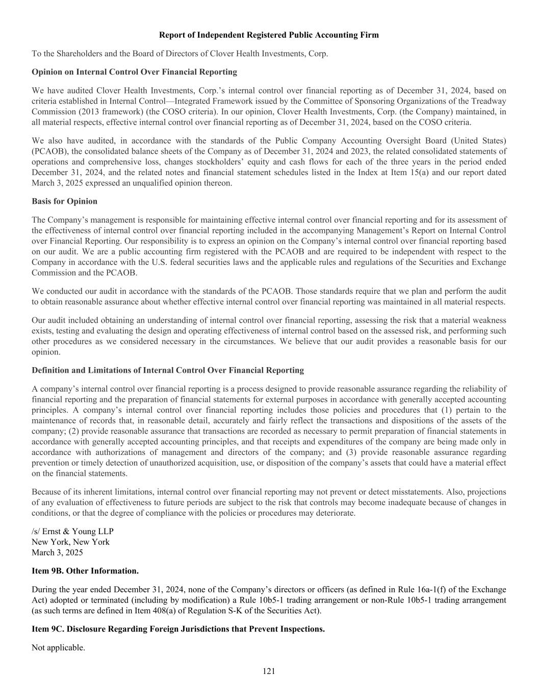 独立注册会计师事务所致Clover Health Investments, Corp.股东和董事会的报告关于财务报告内部控制的意见我们根据Treadway委员会发起组织委员会(2013年框架)发布的内部控制——综合框架(COSO标准),对Clover Health Investments, Corp.截至2024年12月31日的财务报告内部控制进行了审计。我们认为,截至2024年12月31日,Clover Health Investments, Corp.(公司)根据COSO标准,在所有重大方面对财务报告保持有效的内部控制。我们还根据美国公众公司会计监督委员会(PCAOB)的标准,审计了公司截至2024年12月31日和2023年12月31日的合并资产负债表、相关的合并经营和综合亏损报表、截至2024年12月31日止三年期间每年的股东权益变动和现金流量,以及索引第15(a)项所列的相关附注和财务报表附表以及我们日期为2025年3月3日的报告对此发表了无保留意见。意见依据公司管理层负责维护有效的财务报告内部控制,并负责评估随附的管理层财务报告内部控制报告中包含的财务报告内部控制的有效性。我们的责任是在我们审计的基础上,对公司财务报告内部控制发表意见。我们是一家在PCAOB注册的公共会计师事务所,根据美国联邦证券法以及美国证券交易委员会和PCAOB的适用规则和条例,我们被要求对公司具有独立性。我们按照PCAOB的标准进行了审计。这些准则要求我们计划和执行审计,以就是否在所有重大方面保持了有效的财务报告内部控制获得合理保证。我们的审计包括了解财务报告内部控制,评估存在重大缺陷的风险,根据评估的风险测试和评估内部控制的设计和运行有效性,以及在当时情况下执行我们认为必要的其他程序。我们认为,我们的审计为我们的意见提供了合理的依据。财务报告内部控制的定义和限制公司对财务报告的内部控制是一个旨在为财务报告的可靠性和根据公认会计原则为外部目的编制财务报表提供合理保证的过程。公司对财务报告的内部控制包括:(1)与维护记录有关的政策和程序,这些记录以合理的细节准确和公平地反映了公司资产的交易和处置;(2)提供合理的保证,即交易记录是必要的,以允许按照公认会计原则编制财务报表,并且公司的收支只是根据公司管理层和董事的授权进行的;(3)就防止或及时发现未经授权的获取、使用、或处置可能对财务报表产生重大影响的公司资产。财务报告内部控制由于其固有的局限性,可能无法防止或发现错报。此外,对未来期间的任何有效性评估的预测都受到以下风险的影响:由于条件的变化,控制可能变得不充分,或者政策或程序的遵守程度可能恶化。/s/Ernst & Young LLP纽约、纽约2025年3月3日项目9b。其他信息。截至2024年12月31日止年度,公司董事或高级管理人员(定义见《交易法》第16a-1(f)条)均未采纳或终止(包括通过修改)规则10b5-1交易安排或非规则10b5-1交易安排(这些条款定义见《证券法》第S-K条例第408(a)项)。项目9c。关于阻止检查的外国司法管辖区的披露。不适用。121
