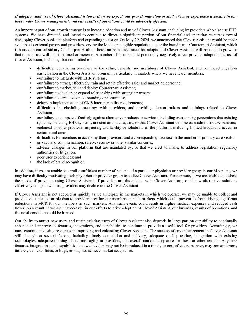 如果Clover Assistant的采用率和使用率低于我们的预期,我们的增长可能会放缓或停滞。我们在三叶草管理下的生活可能会下降,我们的经营业绩可能会受到不利影响。我们增长战略的一个重要部分是增加对Clover Assistant的采用和使用,包括同时使用EHR系统的供应商。我们已经并打算继续将我们财务和运营资源的很大一部分用于开发Clover Assistant平台并扩大其使用范围。2024年5月29日,我们宣布,Clover Assistant将以Counterpart Assistant品牌提供给服务于Medicare合格人群的外部付款人和提供者,该品牌位于我们的子公司Counterpart Health。无法保证Clover Assistant的采用率将继续增长,或者使用率将保持或增加。许多因素可能会对供应商采用和使用Clover Assistant产生潜在的负面影响,包括但不限于:•难以让供应商相信Clover Assistant的价值、好处和用处,以及医生继续参与Clover Assistant计划,特别是在我们会员较少的市场;•我们未能与EHR系统集成;•我们未能吸引、有效培训和留住有效的销售和营销人员;•我们未能营销,销售和部署对口助理;•我们未能发展或扩大与战略合作伙伴的关系;•我们未能利用联合品牌机会;• CMS互操作性要求的实施出现延迟;•在安排与供应商的会议以及提供与Clover Assistant相关的演示和培训方面存在困难;•我们未能与替代产品或服务进行有效竞争,包括未能克服对现有系统(包括EHR系统)相似且足够、或者Clover Assistant将增加行政负担的看法;•影响平台可用性或可靠性的技术或其他问题,包括在某些农村地区有限的宽带接入;•成员在接入其提供者方面遇到困难,初级保健就诊次数相应减少;•隐私和通信、安全、安保或其他类似问题;•我们的平台发生了由立法、监管机构或诉讼授权或我们选择做出的不利变化;•用户体验不佳;•缺乏品牌认知度。此外,如果我们无法在我们的MA计划中招募特定医生或提供者群体的足够数量的患者,我们可能难以激励此类医生或提供者群体使用Clover Assistant。此外,如果我们无法满足供应商使用Clover Assistant的需求,如果供应商对Clover Assistant不满意,或者如果新的替代解决方案与我们有效竞争,供应商可能会拒绝使用Clover Assistant。如果Clover Assistant在我们经营所在的市场没有像我们预期的那样迅速被采用,我们可能无法收集并向在此类市场中为我们的会员提供服务的提供商提供有价值的可操作数据,这可能会阻止我们推动我们在此类市场中为我们的会员大幅降低MCR。任何此类事件都可能导致更高的医疗费用和减少的现金流。因此,如果我们推动采用Clover Assistant的努力不成功,我们的业务、运营结果和财务状况可能会受到损害。我们吸引新用户和留住Clover Assistant现有用户的能力也在很大程度上取决于我们不断增强和改进其功能、集成的能力,以及继续为供应商提供有用工具的能力。因此,我们必须继续投入资源来改进和增强三叶草助手。Clover Assistant的任何增强功能的成功将取决于几个因素,包括及时完成和交付、充分的质量测试、与现有技术的集成、对供应商的充分培训和消息传递,以及由于这些或其他原因的整体市场接受度。我们开发的任何新特性、集成和能力都可能无法及时或以具有成本效益的方式引入,可能包含错误、故障、漏洞或错误,或者可能无法获得市场认可。25
