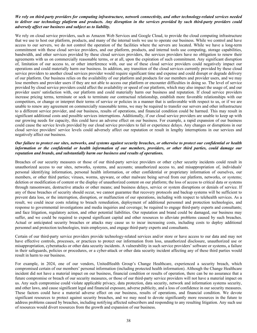 我们依赖第三方供应商提供计算基础设施、网络连接以及交付我们的技术平台和产品所需的其他技术相关服务。此类第三方供应商所提供服务的任何中断都可能对我们的业务产生不利影响,并使我们承担责任。我们依靠云服务提供商,例如Amazon Web Services和Google Cloud,来提供云计算基础设施,我们用来托管我们的平台、产品,以及我们用来运营业务的许多内部工具。虽然我们控制并有权访问我们的服务器,但我们不控制服务器所在设施的运行。虽然我们与这些云服务提供商有长期承诺,并且我们的平台、产品和内部工具使用这些云服务提供商提供的计算、存储能力、带宽和其他服务,但服务提供商没有义务以商业上合理的条款与我们续签协议,或者在此类承诺到期时根本没有义务与我们续签协议。对我们使用这些云服务提供商的任何重大干扰、限制我们访问或其他干扰都可能对我们的运营产生负面影响,并可能对我们的业务造成重大损害。此外,这些云服务提供商目前提供的云服务向另一家云服务提供商的任何过渡都将需要大量时间和费用,并可能扰乱或降低我们平台的交付。我们的业务依赖于我们的平台和产品对我们的会员和提供商用户的可用性,如果会员和提供商用户无法访问我们的平台或在这样做时遇到困难,我们可能会失去他们。云服务提供商提供的服务水平可能会影响我们平台的可用性或速度,这也可能会影响我们平台的使用以及我们提供商用户对我们平台的满意度,并可能对我们的业务和声誉造成重大损害。如果云服务提供商提高定价条款,终止或寻求终止我们的合同关系,与我们的竞争对手建立更有利的关系,或以对我们不利的方式改变或解释他们的服务条款或政策,或者如果我们无法以商业上合理的条款续签任何协议,我们可能会被要求将我们的服务器和其他基础设施转让给不同的服务提供商,我们的业务、运营结果和财务状况可能会受到损害。这可能会导致大量额外成本和可能的服务中断。此外,如果我们的云服务提供商无法跟上我们对容量不断增长的需求,这可能会对我们的业务产生不利影响。例如,我们业务的快速扩张可能会导致我们的云服务提供商提供的服务水平失败或经历延迟。我们的云服务提供商服务水平的任何变化或中断都可能对我们的声誉产生不利影响,或导致我们的服务长期中断,并对我们的业务产生负面影响。我们未能保护我们的站点、网络和系统免受安全漏洞的影响,或未能以其他方式保护我们的机密或健康信息或我们的会员、供应商或其他第三方的机密或健康信息,可能会损害我们的声誉和品牌,并严重损害我们的业务和经营业绩。违反我们或我们的第三方服务提供商的安全措施或其他网络安全事件可能导致未经授权访问我们的站点、网络、系统和账户;未经授权访问和盗用个人的个人身份信息、个人健康信息或我们自己、我们的成员或其他第三方的其他机密或专有信息;从我们的平台、网络或系统中提供的病毒、蠕虫、间谍软件或其他恶意软件;删除或修改内容或在我们的平台上展示未经授权的内容;通过勒索软件失去对关键数据或系统的访问权限,破坏性攻击或其他手段;以及业务延迟、服务或系统中断或拒绝服务。如果发生任何这些安全漏洞,我们无法保证恢复协议和备份系统将足以防止数据丢失,或我们的运营中断、中断或故障,包括远程医疗服务。因此,我们可能会产生与违规补救、部署额外人员和保护技术以及回应政府调查和媒体询问和报道有关的费用;被要求聘请第三方专家和顾问;并面临诉讼、监管行动和其他潜在责任。我们的声誉和品牌可能会受到损害,我们的业务可能会受到影响, 我们可能会被要求花费大量资金和其他资源来缓解此类违规行为带来的问题。实际或预期的安全漏洞或攻击可能会导致我们产生越来越多的成本,包括部署额外人员和保护技术、培训员工以及聘请第三方专家和顾问的成本。我们的某些第三方服务提供商提供与技术相关的服务和/或存储或访问我们的数据,可能没有有效的控制、流程或做法来保护我们的信息免受丢失、未经授权的披露、未经授权的使用或盗用、网络攻击或其他数据安全事件的影响。此类服务提供商的软件或系统中的漏洞、其保障措施、政策或程序出现故障,或影响任何这些第三方的网络攻击或其他数据安全事件,将对我们的业务造成损害。例如,在2024年,我们的供应商之一,联合健康的Change Healthcare医疗保健出现了安全漏洞,该漏洞泄露了我们某些会员的个人信息(包括受保护的健康信息)。尽管Change Healthcare事件对我们的业务、财务状况或经营业绩没有重大影响,但无法保证我们的安全措施或我们的第三方服务提供商的安全措施在未来的妥协或违反将不会对我们产生重大影响。任何此类妥协都可能违反适用的隐私、数据保护、数据安全、网络和信息系统安全等法律,并造成重大的法律和财务风险、负面宣传以及对我们的安全措施失去信心。这些因素可能对我们的业务、经营业绩和财务状况产生重大不利影响。我们投入了大量资源来防范安全漏洞,未来我们可能需要投入更多资源来解决由漏洞引起的问题,包括通知受影响的订户和应对由此产生的任何诉讼。任何这样的资源使用都会分流我们业务增长和扩张的资源。38