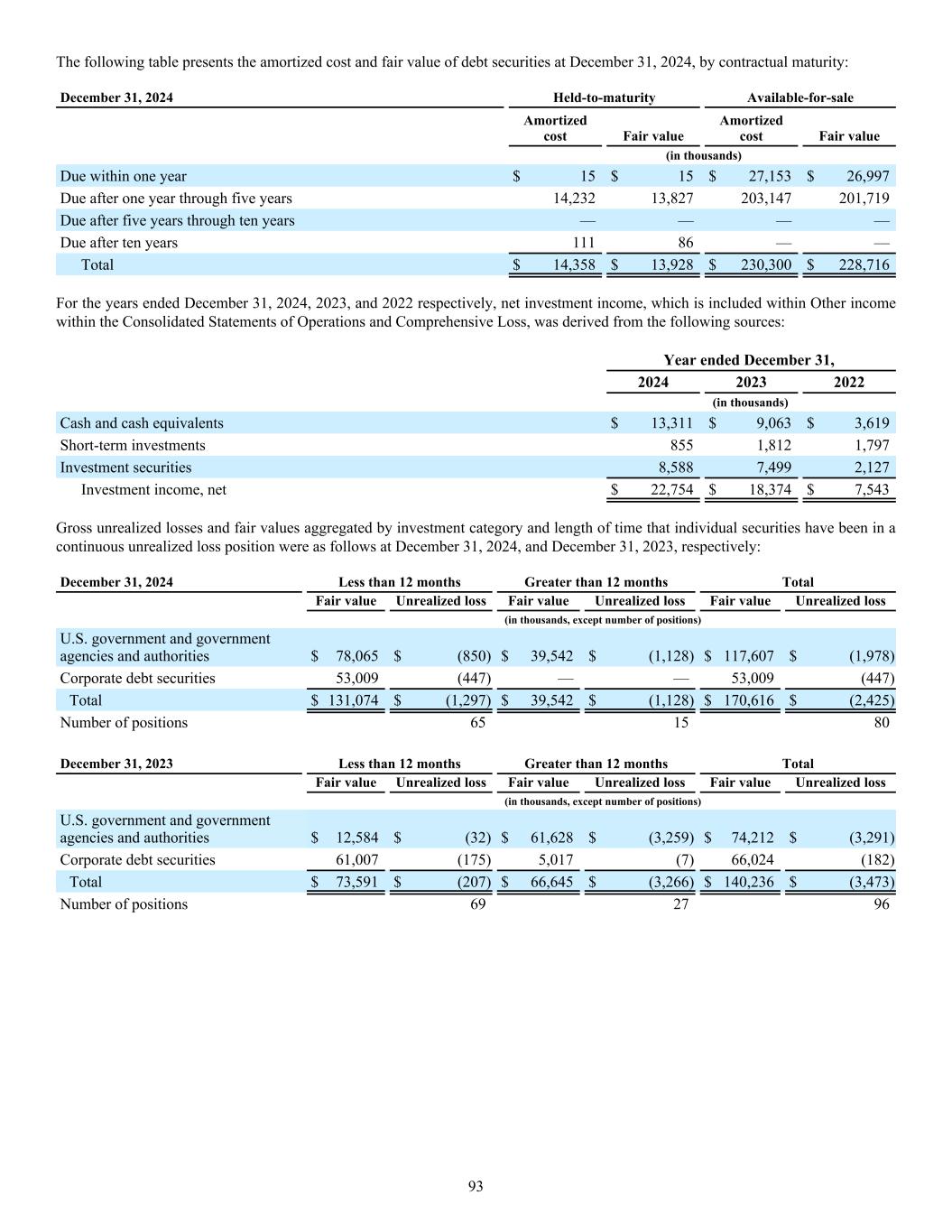 下表按合同期限列示截至2024年12月31日债务证券的摊余成本和公允价值:2024年12月31日持有至到期可供出售摊余成本公允价值摊余成本公允价值(单位:千)一年内到期$ 15 $ 15 $ 27,153 $ 26,997一年后至五年到期14,23213,827203,147201,719五年后至十年到期————十年后到期11186 ——合计14,358美元13,928美元230,300美元228,716分别截至2024年12月31日、2023年和2022年12月31日止年度,净投资收益,包括在综合经营和综合亏损报表的其他收入中,来自以下来源:截至2024年12月31日止年度20232022(单位:千)现金和现金等价物13,311美元9,063美元3,619美元短期投资8551,8121,797投资证券8,5887,4992,127投资收益净额22,754美元18,374美元7,543未实现亏损毛额和按投资类别和个别证券处于持续未实现亏损状态的时间长度汇总的公允价值如下,截至2024年12月31日和2023年12月31日,分别为:2024年12月31日少于12个月多于12个月公允价值未实现亏损总额公允价值未实现亏损公允价值未实现亏损(单位:千,持仓数量除外)美国政府和政府机构和当局$ 78,065 $(850)$ 39,542 $(1,128)$ 117,607 $(1,978)公司债务证券53,009(447)—— 53,009(447)总计$ 131,074 $(1,297)$ 39,542 $(1,128)$ 170,616 $(2,425)持仓数量651580 12月31日,2023少于12个月大于12个月公允价值未实现亏损总额公允价值未实现亏损公允价值未实现亏损(以千为单位,头寸数量除外)美国政府和政府机构和当局$ 12,584 $(32)$ 61,628 $(3,259)$ 74,212 $(3,291)公司债务证券61,007(175)5,017(7)66,024(182)总计$ 73,591 $(207)$ 66,645 $(3,266)$ 140,236 $(3,473)头寸数量69279693