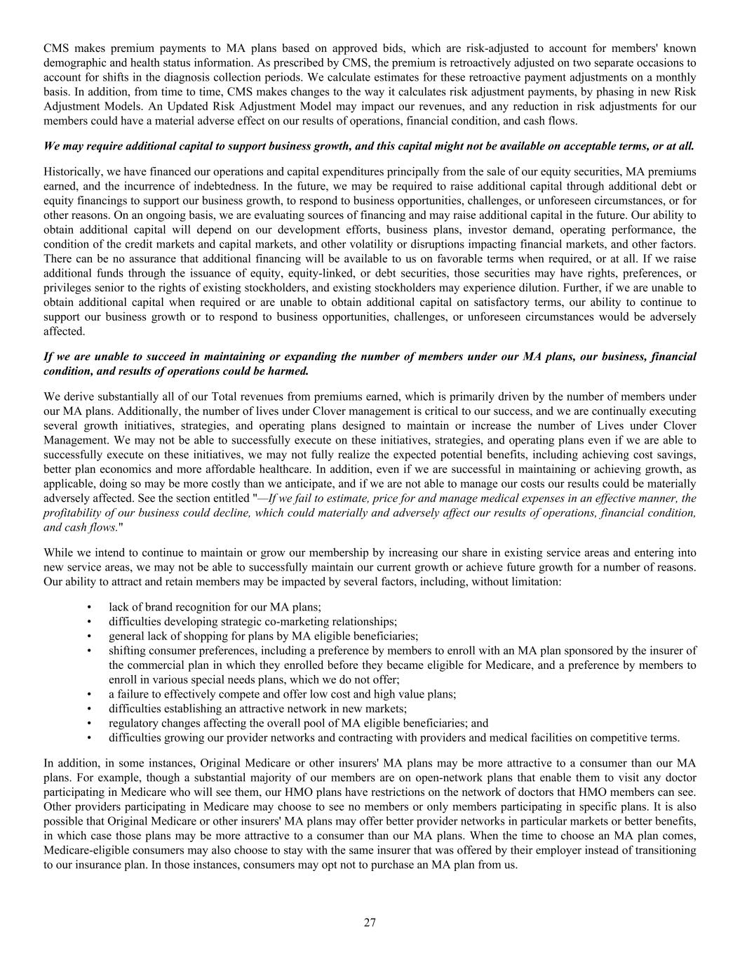 CMS根据批准的投标向MA计划支付保费,这些投标经过风险调整,以考虑成员的已知人口和健康状况信息。按照康哲药业的规定,保费在两个不同的情况下进行追溯调整,以计入诊断采集期的班次。我们按月计算这些追溯付款调整的估计数。此外,康哲药业不时改变其计算风险调整付款的方式,分阶段采用新的风险调整模型。更新的风险调整模型可能会影响我们的收入,我们会员的风险调整的任何减少都可能对我们的经营业绩、财务状况和现金流产生重大不利影响。我们可能需要额外的资本来支持业务增长,而这些资本可能无法以可接受的条件获得,或者根本无法获得。从历史上看,我们主要通过出售我们的股本证券、赚取的MA溢价以及产生债务来为我们的运营和资本支出提供资金。未来,我们可能会被要求通过额外的债务或股权融资筹集额外资金,以支持我们的业务增长,以应对商业机会、挑战或不可预见的情况,或出于其他原因。在持续的基础上,我们正在评估融资来源,并可能在未来筹集额外资金。我们获得额外资本的能力将取决于我们的发展努力、业务计划、投资者需求、经营业绩、信贷市场和资本市场的状况,以及影响金融市场的其他波动或干扰,以及其他因素。无法保证在需要时我们将以优惠条款获得额外融资,或者根本无法获得。如果我们通过发行股票、股票挂钩或债务证券筹集额外资金,这些证券可能拥有优先于现有股东权利的权利、优先权或特权,现有股东可能会经历稀释。此外,如果我们无法在需要时获得额外资本或无法以令人满意的条件获得额外资本,我们继续支持业务增长或应对商业机会、挑战或意外情况的能力将受到不利影响。如果我们无法成功维持或扩大我们MA计划下的会员数量,我们的业务、财务状况和经营业绩可能会受到损害。我们几乎所有的总收入都来自所赚取的保费,这主要是由我们MA计划下的会员数量驱动的。此外,Clover管理下的生命数量对我们的成功至关重要,我们正在持续执行多项增长计划、战略和运营计划,旨在维持或增加Clover管理下的生命数量。我们可能无法成功执行这些举措、战略和运营计划,即使我们能够成功执行这些举措,我们也可能无法充分实现预期的潜在收益,包括实现成本节约、更好的计划经济性和更实惠的医疗保健。此外,即使我们成功地维持或实现了增长(如适用),这样做的成本可能比我们预期的要高,如果我们无法管理我们的成本,我们的业绩可能会受到重大不利影响。请参阅题为“—如果我们未能以有效方式估计、定价和管理医疗费用,我们业务的盈利能力可能会下降,这可能会对我们的经营业绩、财务状况和现金流产生重大不利影响。”虽然我们打算通过增加我们在现有服务领域的份额和进入新的服务领域来继续保持或增加我们的会员人数,但由于多种原因,我们可能无法成功地保持我们目前的增长或实现未来的增长。我们吸引和留住会员的能力可能会受到几个因素的影响,包括但不限于:•我们的MA计划缺乏品牌认知度;•难以发展战略联合营销关系;• MA合格受益人普遍缺乏购买计划;•消费者偏好发生变化,包括会员倾向于在他们获得医疗保险资格之前参加由他们所参加的商业计划的保险人赞助的MA计划,以及会员倾向于参加各种特殊需求计划,我们不提供;•未能有效竞争并提供低成本和高价值的计划;•难以在新市场建立有吸引力的网络;•影响MA合格受益人整体池的监管变化;•难以扩大我们的供应商网络以及以竞争性条款与供应商和医疗设施签订合同。此外,在某些情况下, Original Medicare或其他保险公司的MA计划可能比我们的MA计划对消费者更具吸引力。例如,尽管我们的绝大多数成员都参加了开放网络计划,使他们能够访问任何参加医疗保险的医生,他们将看到他们,但我们的HMO计划对HMO成员可以看到的医生网络有限制。参与医疗保险的其他提供者可能会选择不看到成员或仅看到成员参与特定计划。也有可能Original Medicare或其他保险公司的MA计划可能会在特定市场提供更好的供应商网络或更好的福利,在这种情况下,这些计划可能比我们的MA计划对消费者更具吸引力。当选择MA计划的时机到来时,符合Medicare资格的消费者也可以选择留在其雇主提供的同一家保险公司,而不是过渡到我们的保险计划。在这些情况下,消费者可能会选择不向我们购买MA计划。27
