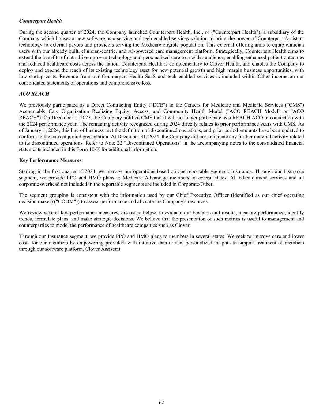 Counterpart Health在2024年第二季度,公司推出了Counterpart Health,Inc.,或(“Counterpart Health”),这是公司的一家子公司,其中包含一种新的软件即服务和技术支持服务解决方案,以将Counterpart Assistant技术的力量带给服务于Medicare合格人群的外部付款人和提供者。这一外部产品旨在为临床医生用户配备我们已经构建的、以临床医生为中心的、人工智能驱动的护理管理平台。战略上,Counterpart Health旨在将数据驱动的成熟技术和个性化护理的好处扩展到更广泛的受众,从而在全国范围内提高患者的治疗效果并降低医疗保健成本。Counterpart Health与Clover Health具有互补性,使公司能够部署并扩大现有技术资产的覆盖范围,以获得新的潜在增长和高利润率的业务机会,启动成本低。我们的Counterpart Health SaaS和技术支持服务的收入包含在我们综合运营和综合亏损报表的其他收入中。ACO REACH我们之前作为直接签约实体(“DCE”)参与了医疗保险和医疗补助服务中心(“CMS”)实现公平、准入和社区健康模式(“ACO REACH模式”或“ACO REACH”)的问责制护理组织。2023年12月1日,公司通知康哲药业,其将不再作为与2024年业绩年度相关的REACH ACO参与。2024年期间确认的剩余活动与CMS之前的业绩年度直接相关。截至2024年1月1日,该业务项目符合终止经营的定义,前期金额已更新以符合本期的列报方式。截至2024年12月31日,公司预计不会有任何与其已终止业务相关的进一步重大活动。有关更多信息,请参阅本10-K表中包含的合并财务报表附注中的附注22“终止经营”。从2024年第一季度开始的关键绩效指标,我们根据一个可报告的分部管理我们的运营:保险。通过我们的保险部门,我们向多个州的Medicare Advantage成员提供OPPO和HMO计划。未包括在可报告分部中的所有其他临床服务和所有公司间接费用均包含在公司/其他中。分部分组与我们的首席执行官(被确定为我们的首席运营决策者)(“CODM”)用于评估业绩和分配公司资源的信息一致。我们审查了以下讨论的几个关键绩效衡量标准,以评估我们的业务和结果,衡量绩效,确定趋势,制定计划,并做出战略决策。我们认为,这些指标的呈现有助于管理层和交易对手对三叶草等医疗保健公司的业绩进行建模。通过我们的保险部门,我们向几个州的成员提供了OPPO和HMO计划。我们寻求通过我们的软件平台Clover Assistant为提供者提供直观的数据驱动的个性化见解,以支持对成员的治疗,从而改善护理并降低我们会员的成本。62