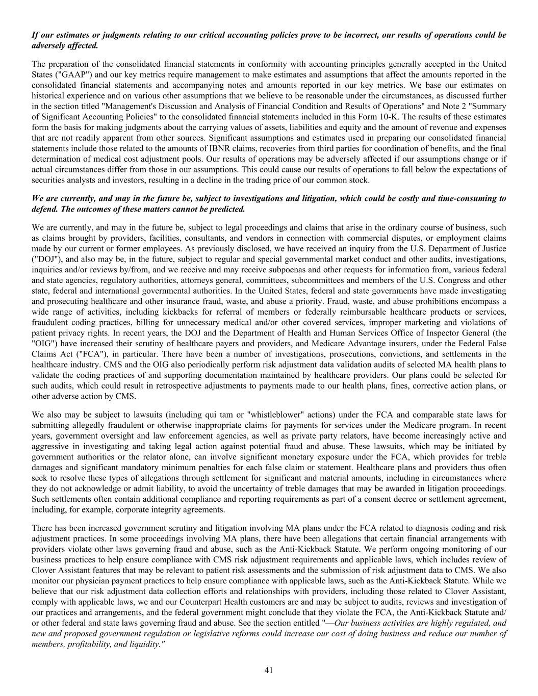 如果我们对关键会计政策的估计或判断被证明是不正确的,我们的经营业绩可能会受到不利影响。按照美国普遍接受的会计原则(“GAAP”)和我们的关键指标编制合并财务报表要求管理层做出估计和假设,这些估计和假设会影响合并财务报表和随附的附注中报告的金额以及我们的关键指标中报告的金额。我们的估计基于历史经验和我们认为在当时情况下合理的各种其他假设,如本表10-K中包含的合并财务报表标题为“管理层对财务状况和经营成果的讨论和分析”和附注2“重要会计政策摘要”部分中进一步讨论的那样。这些估计的结果构成了对资产、负债和权益的账面价值以及从其他来源不易看出的收入和费用金额作出判断的基础。在编制我们的合并财务报表时使用的重要假设和估计包括与IBNR索赔金额、为协调福利而从第三方追偿以及最终确定医疗成本调整池有关的假设和估计。如果我们的假设发生变化或实际情况与我们假设中的情况不同,我们的经营业绩可能会受到不利影响。这可能会导致我们的经营业绩低于证券分析师和投资者的预期,从而导致我们普通股的交易价格下降。我们目前正在、将来也可能会受到调查和诉讼的影响,这可能是昂贵和耗时的辩护。这些事项的结果无法预测。我们目前以及将来可能会受到日常业务过程中出现的法律诉讼和索赔,例如供应商、设施、顾问和供应商就商业纠纷提出的索赔,或我们现任或前雇员提出的就业索赔。如先前所披露,我们已收到美国司法部(“DOJ”)的调查,未来也可能受到定期和特别的政府市场行为和其他审计、调查、询问和/或审查,我们收到并可能收到来自各种联邦和州机构、监管机构、总检察长、委员会、小组委员会和美国国会成员以及其他州、联邦和国际政府机构的传票和其他信息请求。在美国,联邦和州政府已将调查和起诉医疗保健和其他保险欺诈、浪费和滥用列为优先事项。欺诈、浪费和滥用禁令涵盖范围广泛的活动,包括为会员转诊或联邦政府可报销的医疗保健产品或服务提供回扣、欺诈性编码做法、为不必要的医疗和/或其他涵盖服务计费、不当营销和侵犯患者隐私权。近年来,美国司法部和卫生与公众服务部监察长办公室(“OIG”)特别根据《联邦虚假索赔法》(“FCA”)加强了对医疗保健支付方和提供者以及医疗保险优势保险公司的审查。医疗保健行业出现了多起调查、起诉、定罪、和解等案件。CMS和OIG还定期对选定的MA健康计划进行风险调整数据验证审计,以验证医疗保健提供者维护的编码做法和支持文件。我们的计划可能会被选中进行此类审计,这可能会导致对我们的健康计划支付的款项进行追溯调整、罚款、纠正行动计划或CMS的其他不利行动。我们还可能因就医疗保险计划下的服务付款提交涉嫌欺诈或其他不适当的索赔而根据FCA和类似的州法律受到诉讼(包括qui tam或“举报人”诉讼)。近年来,政府监管和执法机构以及私人当事人关系者在调查和对潜在的欺诈和滥用行为采取法律行动方面变得越来越积极和积极。这些诉讼可能由政府当局或相关方单独发起,可能涉及根据FCA承担的重大金钱风险,该协议规定对每一项虚假索赔或陈述给予三倍的损害赔偿和重大的强制性最低处罚。因此,医疗保健计划和提供者经常寻求通过就重大和重大金额达成和解来解决这类指控,包括在他们不承认或不承认责任的情况下, 以避免诉讼程序中可能判给的三倍赔偿金的不确定性。此类和解通常包含额外的合规和报告要求,作为同意令或和解协议的一部分,例如包括公司诚信协议。涉及与诊断编码和风险调整实践相关的FCA下的MA计划的政府审查和诉讼有所增加。在一些涉及MA计划的诉讼中,有指控称,与供应商的某些财务安排违反了有关欺诈和滥用的其他法律,例如《反回扣法规》。我们对我们的业务实践进行持续监控,以帮助确保符合CMS风险调整要求和适用法律,其中包括审查可能与患者风险评估相关的Clover Assistant功能以及向CMS提交风险调整数据。我们还监控我们的医生付费做法,以帮助确保遵守适用的法律,例如反回扣法规。虽然我们认为我们的风险调整数据收集工作以及与提供者的关系,包括与Clover Assistant相关的数据收集工作以及与这些提供者的关系符合适用法律,但我们和我们的Counterpart Health客户现在并且可能会受到对我们的做法和安排的审计、审查和调查,联邦政府可能会得出结论,认为他们违反了《FCA》、《反回扣法规》和/或其他监管欺诈和滥用的联邦和州法律。请参阅题为“—我们的商业活动受到高度监管,新的和拟议的政府监管或立法改革可能会增加我们的经商成本,并减少我们的会员数量、盈利能力和流动性。”41
