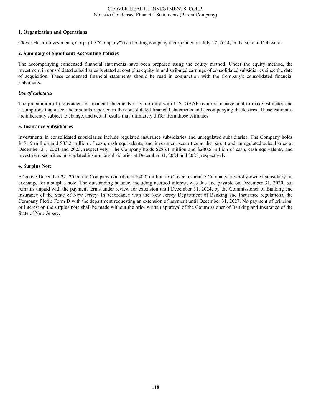 1.组织和运营Clover Health Investments, Corp.(“公司”)是一家控股公司,于2014年7月17日在特拉华州注册成立。2.重要会计政策摘要随附的简明财务报表采用权益法编制。权益法下,对并表子公司的投资自收购之日起按成本加权益计入并表子公司未分配收益。这些简明财务报表应与公司合并财务报表一并阅读。使用估计按照美国公认会计原则编制简明财务报表要求管理层做出影响合并财务报表和随附披露中报告的金额的估计和假设。这些估计数本质上可能会发生变化,实际结果最终可能与这些估计数不同。3.保险子公司对合并子公司的投资包括受监管的保险子公司和不受监管的子公司。截至2024年12月31日和2023年12月31日,公司在母公司和未受监管的子公司分别持有1.515亿美元和8320万美元的现金、现金等价物和投资证券。截至2024年12月31日和2023年12月31日,该公司在受监管的保险子公司中分别持有2.861亿美元和2.805亿美元的现金、现金等价物和投资证券。4.盈余票据自2016年12月22日起生效,公司向全资子公司Clover Insurance Company出资4000万美元,以换取盈余票据。包括应计利息在内的未偿余额于2020年12月31日到期应付,但仍未支付,新泽西州银行和保险专员正在审查付款条件,以将其延期至2024年12月31日。根据新泽西州银行和保险部的规定,该公司向该部门提交了一份表格D,要求将付款延期至2027年12月31日。未经新泽西州银行和保险专员事先书面批准,不得支付盈余票据的本金或利息。CLOVER Health Investments,CORP。简明财务报表附注(母公司)118