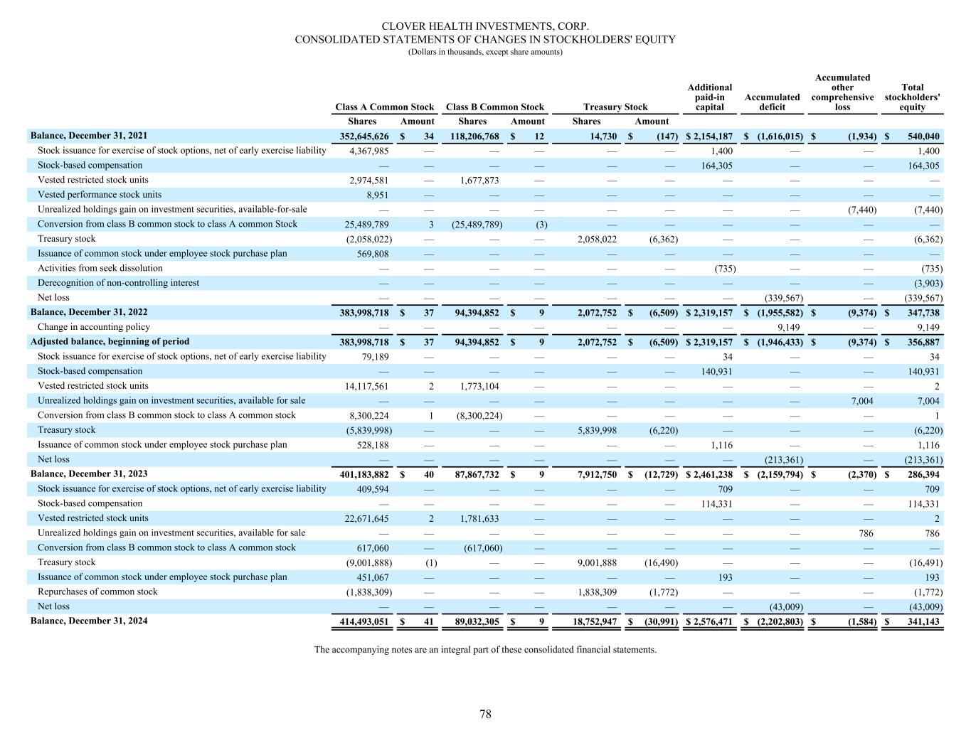 CLOVER Health Investments,CORP。合并股东权益变动表(单位:千美元,股份金额除外)A类普通股B类普通股库存股额外实收资本累计亏损累计其他综合亏损股东权益总额股份金额股份金额股份金额余额,2021年12月31日352,645,626美元34118,206,768美元1214,730美元(147)2,154,187美元(1,616,015)美元(1,934)540,040美元股票发行用于行使股票期权,扣除提前行权负债4,367,985 —————— 1,400 —— 1,400股票补偿—————— 164,305 —— 164,305已归属限制性股票单位2,974,581 — 1,677,873 ——————已归属业绩股票单位8,951 ————————————投资证券的未实现持股收益,可供出售————————(7,440)(7,440)B类普通股转为A类普通股25,489,7893(25,489,789)(3)——————库存股(2,058,022)———— 2,058,022(6,362)————(6,362)根据员工股票购买计划发行普通股569,808 ————————寻求解散的活动——————(735)——(735)终止确认非控股权益————————(3,903)净亏损————————(339,567)—(339,567)余额2022年12月31日383,998,718美元3794,394,852美元92,072,752美元(6,509)2,319,157美元(1,955,582)美元(9,374)347,738美元会计政策变更———————— 9,149 — 9,149调整后余额,期初383,998,718美元3794,394,852美元92,072,752美元(6,509)2,319,157美元(1,946,433)美元(9,374)美元356,887美元为行使股票期权发行股票,扣除提前行权负债79,189 —————— 34 —— 34以股票为基础的补偿—————— 140,931 —— 140,931个已归属限制性股票单位14,117,56121,773,104 —————— 2投资证券的未实现持股收益,可供出售———————— 7,0047,004从B类普通股转换为A类普通股8,300,2241(8,300,224)—————— 1库存股(5,839,998)———— 5,839,998(6,220)————(6,220)员工购股计划发行普通股528,188 ———— 1,116 —— 1,116净亏损——————(213,361)——(213,361)余额,12月31日,2023401,183,882美元4087,867,732美元97,912,750美元(12,729)美元2,461,238美元(2,159,794)美元(2,370)美元286,394美元为行使股票期权而发行的股票,扣除提前行权负债409,594 ———— 709 —— 709以股票为基础的补偿—————— 114,331 —— 114,331已归属限制性股票单位22,671,64521,781,633 —————— 2投资证券的未实现持股收益,可供出售———————— 786786从B类普通股转换为A类普通股617,060 —(617,060)————————库存股(9,001,888)(1)—— 9,001,888(16,490)————(16,491)根据员工股票购买计划发行普通股451,067 ———— 193 —— 193回购普通股(1,838,309)———— 1,838,309(1,772)————(1,772)净亏损——————(43,009)——(43,009)余额,12月31日,2024414,493,051美元4189,032,305美元918,752,947美元(30,991)2,576,471美元(2,202,803)美元(1,584)341,143美元所附附注是这些综合财务报表的组成部分。78