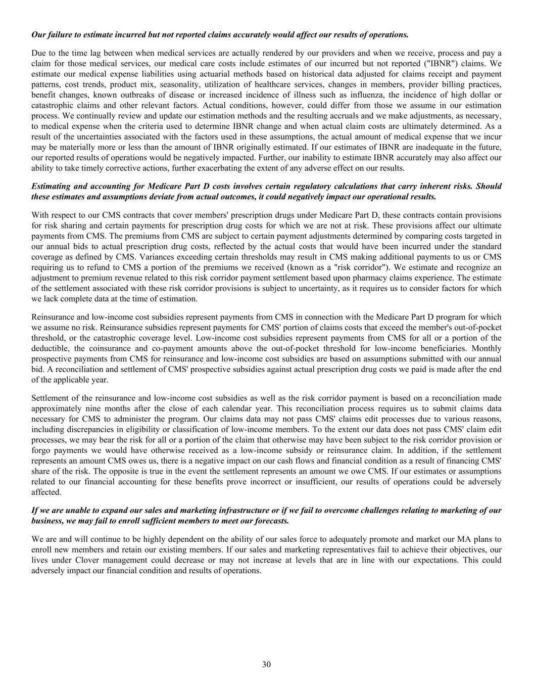 我们未能准确估计已发生但未报告的索赔将影响我们的经营业绩。由于我们的提供者实际提供医疗服务与我们接收、处理和支付这些医疗服务的索赔之间存在时间差,我们的医疗护理费用包括我们已发生但未报告(“IBNR”)索赔的估计。我们使用精算方法估计我们的医疗费用负债,这些方法基于根据索赔接收和支付模式、成本趋势、产品组合、季节性、医疗保健服务的利用、成员的变化、提供者计费做法、福利变化、已知的疾病爆发或流感等疾病发病率增加、高美元或灾难性索赔的发生率和其他相关因素调整的历史数据。然而,实际情况可能与我们在估算过程中假设的情况不同。我们不断审查和更新我们的估算方法和由此产生的应计费用,当用于确定IBNR的标准发生变化以及实际索赔成本最终确定时,我们会根据需要对医疗费用进行调整。由于与这些假设中使用的因素相关的不确定性,我们产生的实际医疗费用金额可能大大多于或少于最初估计的IBNR金额。如果我们对未来IBNR的估计不足,我们报告的运营结果将受到负面影响。此外,我们无法准确估计IBNR也可能影响我们采取及时纠正行动的能力,进一步加剧对我们结果的任何不利影响的程度。医疗保险D部分成本的估算和核算涉及某些带有固有风险的监管计算。如果这些估计和假设偏离实际结果,可能会对我们的运营结果产生负面影响。关于我们的CMS合同,涵盖医疗保险D部分下的会员处方药,这些合同包含风险分担条款和我们没有风险的处方药费用的某些付款。这些规定影响了我们从康哲药业获得的最终付款。来自康哲药业的溢价须经某些付款调整,这些调整是通过将我们年度投标中的目标成本与实际处方药成本进行比较而确定的,反映在康哲药业定义的标准承保范围下本应产生的实际成本。超过某些阈值的差异可能会导致CMS向我们支付额外款项或CMS要求我们向CMS退还我们收到的部分保费(称为“风险走廊”)。我们根据药房索赔经验估计并确认与此风险走廊付款结算相关的保费收入调整。与这些风险走廊条款相关的结算估计存在不确定性,因为它要求我们在估计时考虑我们缺乏完整数据的因素。再保险和低收入成本补贴代表来自CMS的与Medicare Part D计划相关的付款,我们对此不承担任何风险。再保险补贴是指对CMS超过成员自付门槛或灾难性承保水平的部分索赔成本的支付。低收入成本补贴是指CMS为低收入受益人支付的全部或部分免赔额、共同保险和共同支付金额高于自付门槛的款项。CMS为再保险和低收入成本补贴提供的每月预期付款是基于与我们的年度投标一起提交的假设。康哲药业的预期补贴与我们支付的实际处方药费用的对账和结算在适用年度结束后进行。再保险和低收入成本补贴以及风险走廊付款的结算是基于每个自然年度结束后大约九个月进行的对账。这一和解过程要求我们提交CMS管理该计划所需的索赔数据。由于各种原因,我们的理赔数据可能无法通过CMS的理赔编辑流程,包括低收入成员的资格或分类差异。如果我们的数据没有通过CMS的索赔编辑流程,我们可能会承担全部或部分索赔的风险,否则这些索赔可能会受到风险走廊条款的约束,或者放弃我们本来会作为低收入补贴或再保险索赔收到的付款。此外,如果结算代表CMS欠我们的金额,则由于融资CMS分担风险,对我们的现金流和财务状况有负面影响。在结算代表我们欠CMS的金额的情况下,情况正好相反。如果我们对这些收益的与我们的财务会计相关的估计或假设被证明不正确或不充分, 我们的经营业绩可能会受到不利影响。如果我们无法扩大我们的销售和营销基础设施,或者如果我们未能克服与我们业务的营销相关的挑战,我们可能无法招募足够的会员来满足我们的预测。我们现在并将继续高度依赖我们的销售队伍的能力,以充分推广和营销我们的MA计划,以注册新会员并留住现有会员。如果我们的销售和营销代表未能实现他们的目标,我们在三叶草管理下的生活可能会减少或可能不会增加到符合我们预期的水平。这可能会对我们的财务状况和经营业绩产生不利影响。30