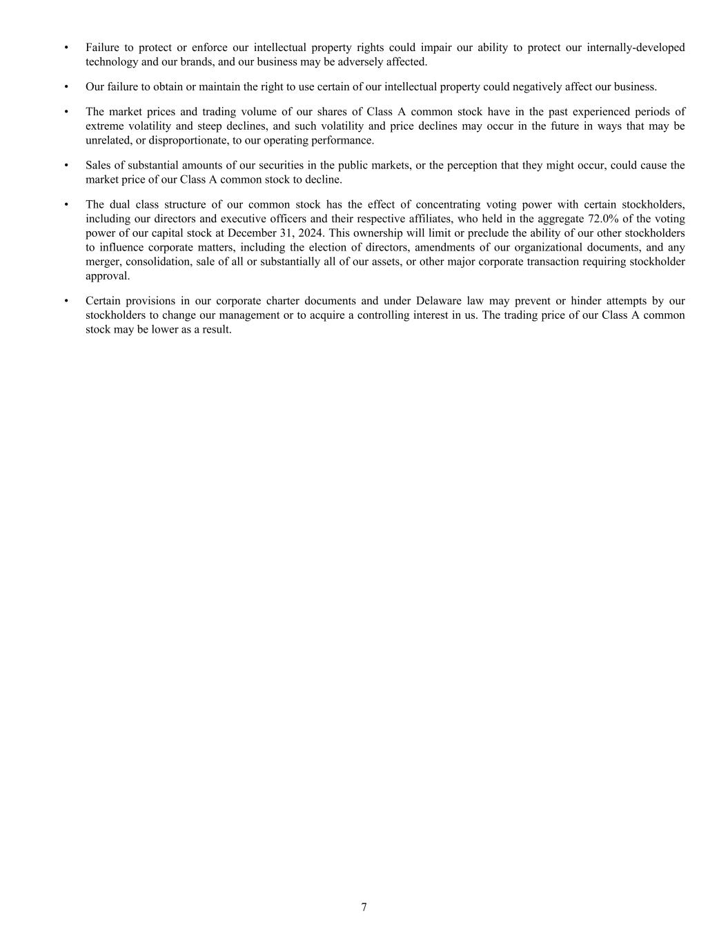 •未能保护或强制执行我们的知识产权可能会损害我们保护内部开发的技术和品牌的能力,我们的业务可能会受到不利影响。•我们未能获得或维持使用我们某些知识产权的权利可能会对我们的业务产生负面影响。•我们A类普通股股票的市场价格和交易量在过去经历了极端波动和急剧下跌的时期,未来这种波动和价格下跌可能会以与我们的经营业绩无关或不成比例的方式发生。•在公开市场上大量出售我们的证券,或认为它们可能发生,可能会导致我们A类普通股的市场价格下跌。•我们普通股的双重类别结构具有将投票权集中于某些股东的效果,包括我们的董事和执行官及其各自的关联公司,他们在2024年12月31日合计持有我们股本的72.0%的投票权。这种所有权将限制或排除我们的其他股东影响公司事务的能力,包括选举董事、修改我们的组织文件,以及任何合并、合并、出售我们的全部或几乎全部资产,或其他需要股东批准的重大公司交易。•我们的公司章程文件和特拉华州法律中的某些规定可能会阻止或阻碍我们的股东试图改变我们的管理层或收购我们的控股权。我们A类普通股的交易价格可能因此而更低。7