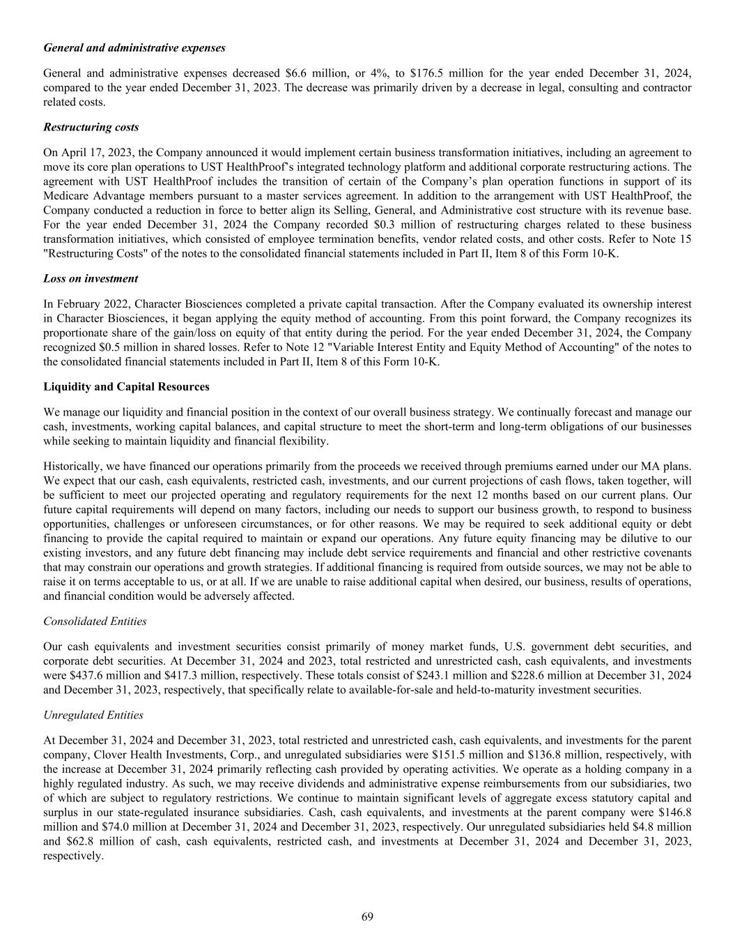 与截至2023年12月31日的年度相比,截至2024年12月31日的年度,一般和行政费用减少660万美元,或4%,至1.765亿美元。减少的主要原因是法律、咨询和承包商相关费用减少。重组成本2023年4月17日,该公司宣布将实施某些业务转型举措,包括同意将其核心计划运营迁移至UST HealthProof的综合技术平台,以及额外的公司重组行动。与UST HealthProof的协议包括根据主服务协议过渡公司的某些计划运营职能,以支持其Medicare Advantage成员。除了与UST HealthProof的安排外,该公司还进行了一次减持,以更好地使其销售、一般和行政成本结构与其收入基础保持一致。截至2024年12月31日止年度,公司记录了与这些业务转型举措相关的30万美元重组费用,其中包括员工解雇福利、供应商相关成本和其他成本。请参阅本10-K表第II部分第8项所包含的合并财务报表附注附注15“重组成本”。2022年2月,Character Biosciences完成了一项私人资本交易的投资损失。公司对Character Biosciences的所有权权益进行评估后,开始采用权益法核算。从这一点开始,公司确认其在该期间该实体的权益损益的比例份额。截至2024年12月31日止年度,公司确认了0.5百万美元的共担亏损。请参阅本10-K表第II部分第8项中包含的合并财务报表附注的附注12“可变利益实体和权益会计法”。流动性和资本资源我们在整体业务战略的背景下管理我们的流动性和财务状况。我们不断预测和管理我们的现金、投资、营运资金余额和资本结构,以满足我们业务的短期和长期义务,同时寻求保持流动性和财务灵活性。从历史上看,我们主要通过根据我们的MA计划赚取的保费获得的收益为我们的运营提供资金。我们预计,根据我们目前的计划,我们的现金、现金等价物、受限现金、投资以及我们目前对现金流的预测加在一起,将足以满足我们预计的未来12个月的运营和监管要求。我们未来的资本需求将取决于许多因素,包括我们支持业务增长的需求,应对商机、挑战或不可预见的情况,或出于其他原因。我们可能需要寻求额外的股权或债务融资,以提供维持或扩大我们的业务所需的资本。任何未来的股权融资可能会稀释我们现有的投资者,任何未来的债务融资可能包括偿债要求以及可能限制我们的运营和增长战略的财务和其他限制性契约。如果需要从外部来源获得额外融资,我们可能无法以我们可以接受的条件筹集,或者根本无法筹集。如果我们无法在需要时筹集额外资金,我们的业务、经营业绩和财务状况将受到不利影响。合并实体我们的现金等价物和投资证券主要包括货币市场基金、美国政府债务证券和公司债务证券。截至2024年12月31日和2023年12月31日,受限制和非限制现金、现金等价物和投资总额分别为4.376亿美元和4.173亿美元。截至2024年12月31日和2023年12月31日,这些总额分别为2.431亿美元和2.286亿美元,具体涉及可供出售和持有至到期投资证券。不受监管的实体截至2024年12月31日和2023年12月31日,母公司、Clover Health Investments, Corp.和不受监管的子公司的受限制和不受限制的现金、现金等价物和投资总额分别为1.515亿美元和1.368亿美元,2024年12月31日的增加主要反映了经营活动提供的现金。我们在一个受到高度监管的行业中作为一家控股公司运营。因此,我们可能会从我们的子公司获得股息和管理费用报销,其中两项受到监管限制。我们继续在受国家监管的保险子公司中保持显着水平的总超额法定资本和盈余。截至12月31日,母公司的现金、现金等价物和投资分别为1.468亿美元和74.0亿美元, 分别为2024年和2023年12月31日。截至2024年12月31日和2023年12月31日,我们不受监管的子公司分别持有480万美元和6280万美元的现金、现金等价物、限制性现金和投资。69