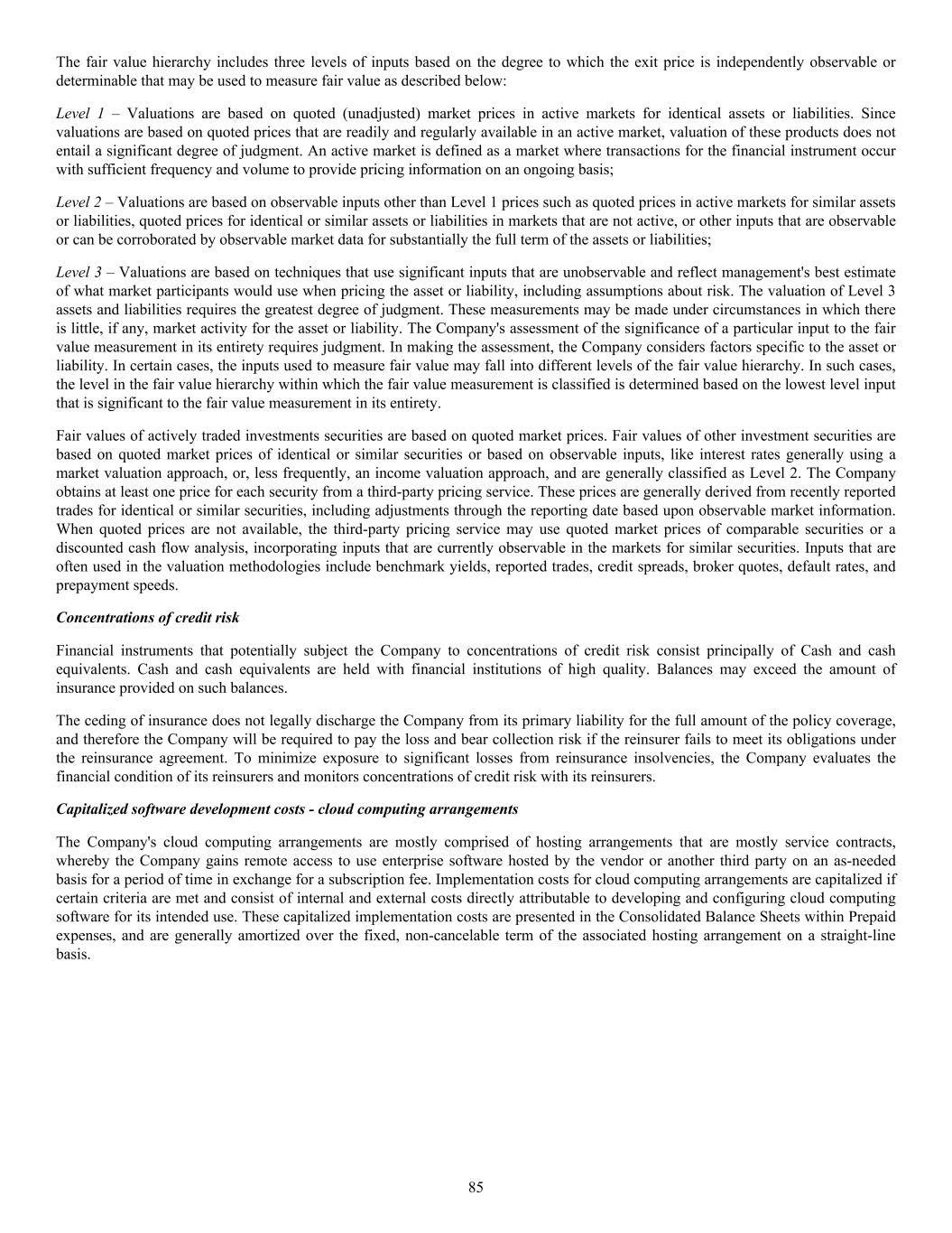 公允价值层次包括三个级别的输入值,这些输入值基于退出价格可独立观察或确定的程度,可用于计量如下所述的公允价值:第1级–估值基于相同资产或负债在活跃市场中的报价(未经调整)市场价格。由于估值是基于在活跃市场中随时可以定期获得的报价,因此对这些产品进行估值并不需要进行重大程度的判断。活跃市场定义为金融工具的交易以足够的频率和数量发生以持续提供定价信息的市场;第2级–估值基于第1级价格以外的可观察输入值,例如类似资产或负债在活跃市场中的报价、相同或类似资产或负债在不活跃市场中的报价,或在资产或负债的整个期限内可观察到或可由可观察市场数据证实的其他输入值;第3级–估值基于使用不可观察的重要输入值的技术,并反映管理层对市场参与者在为资产或负债定价时将使用的最佳估计,包括关于风险的假设。第3级资产负债的估值需要最大程度的判断。这些计量可以在资产或负债的市场活动很少(如果有的话)的情况下进行。公司评估特定输入值对公允价值计量整体的重要意义需要判断。公司在进行评估时,会考虑资产或负债的特定因素。在某些情况下,用于计量公允价值的输入值可能属于公允价值层次的不同层次。在这种情况下,公允价值计量在公允价值层次结构中分类的级别是根据对公允价值计量整体具有重要意义的最低级别输入值确定的。交易活跃的投资证券的公允价值以市场报价为基础。其他投资证券的公允价值基于相同或类似证券的市场报价或基于可观察的输入值,如利率通常使用市场估值法,或较少使用收益估值法,通常被归类为第2级。公司从第三方定价服务中获得每种证券至少一个价格。这些价格通常来自最近报告的相同或类似证券的交易,包括根据可观察的市场信息在报告日期进行的调整。当无法获得报价时,第三方定价服务可能会使用可比证券的市场报价或贴现现金流分析,其中包含目前在市场上可观察到的类似证券的投入。估值方法中经常使用的输入包括基准收益率、报告的交易、信用利差、经纪人报价、违约率和提前还款速度。信用风险集中可能使公司面临信用风险集中的金融工具主要包括现金和现金等价物。现金及现金等价物存放于优质金融机构。余额可能超过为此类余额提供的保险金额。分出保险并不合法地解除公司对保单保额全额的主要责任,因此,如果再保险人未能履行其在再保险协议下的义务,公司将被要求支付损失并承担催收风险。为尽量减少再保险破产造成的重大损失风险,公司评估其再保险公司的财务状况,并与再保险公司一起监测信用风险的集中度。资本化软件开发成本-云计算安排公司的云计算安排主要包括托管安排,这些安排大多是服务合同,据此,公司获得远程访问权限,以在一段时间内按需使用由供应商或另一第三方托管的企业软件,以换取订阅费。云计算安排的实施成本在满足某些标准的情况下资本化,包括直接归属于为其预期用途开发和配置云计算软件的内部和外部成本。这些资本化的实施成本在综合资产负债表的预付费用中列报,一般按直线法在相关托管安排的固定、不可取消的期限内摊销。85