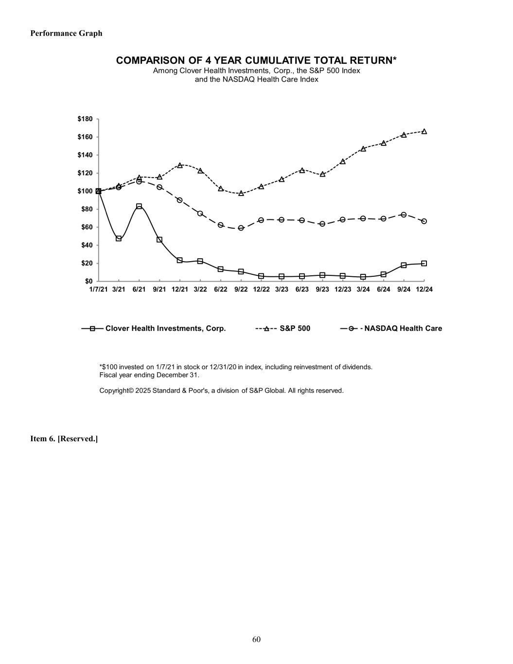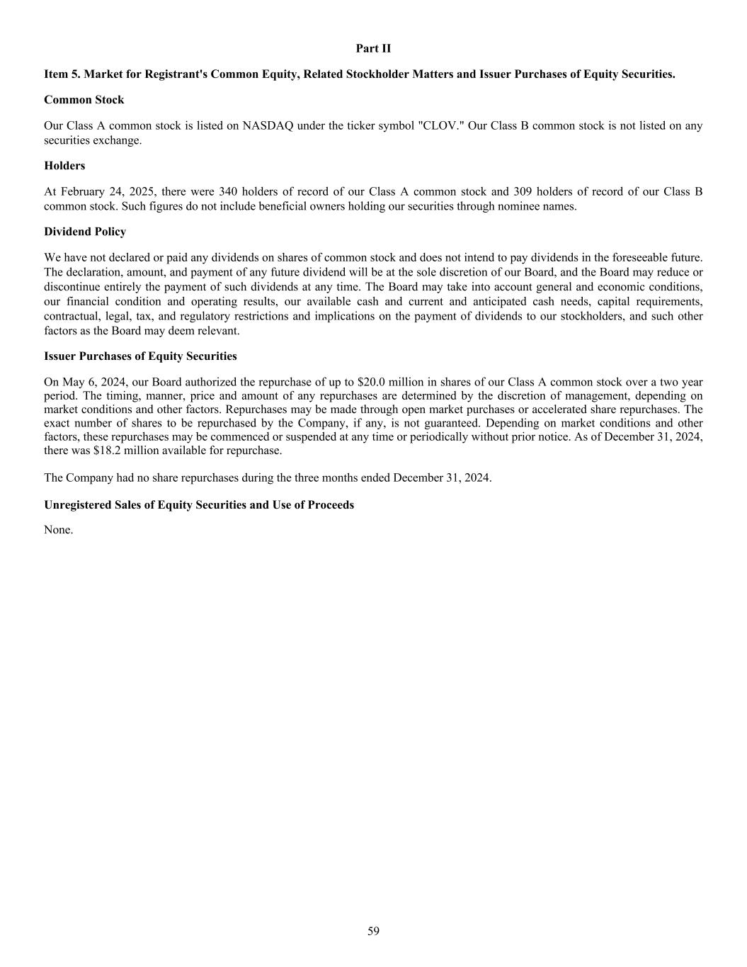 第二部分第5项。市场为注册人的普通股权、相关股东事项和发行人购买股本证券。普通股我们的A类普通股在纳斯达克上市,股票代码为“CLOV”。我们的B类普通股没有在任何证券交易所上市。持有人截至2025年2月24日,我们的A类普通股记录持有人有340名,B类普通股记录持有人有309名。这些数字不包括通过代名人名义持有我们证券的实益拥有人。股息政策我们没有宣布或支付任何普通股股息,也不打算在可预见的未来支付股息。任何未来股息的宣布、金额和支付将由我们的董事会全权酌情决定,董事会可随时减少或完全停止支付此类股息。董事会可能会考虑一般和经济状况、我们的财务状况和经营业绩、我们的可用现金以及当前和预期的现金需求、资本要求、合同、法律、税收和监管限制以及对向我们的股东支付股息的影响,以及董事会可能认为相关的其他因素。发行人购买股本证券2024年5月6日,我们的董事会授权在两年期间回购最多2000万美元的A类普通股。任何回购的时机、方式、价格和金额由管理层酌情决定,视市场情况和其他因素而定。可通过公开市场购买或加速股份回购等方式进行回购。不保证公司将回购的确切股份数量(如有)。视乎市场情况及其他因素,该等回购可于任何时间或定期开始或暂停,而无须事先通知。截至2024年12月31日,有1820万美元可供回购。截至2024年12月31日止三个月,公司无股份回购。未登记出售股权证券及所得款项用途无。59