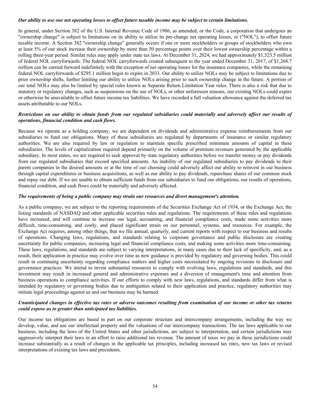 我们使用净经营亏损抵消未来应税收入的能力可能受到某些限制。一般来说,根据经修订的1986年美国国内税收法典第382条或该法典,发生“所有权变更”的公司利用变更前的净经营亏损或(“NOL”)抵消未来应税收入的能力受到限制。第382条“所有权变更”一般发生在一个或多个拥有我国股票至少5%的股东或股东群体在三年滚动期间内超过其最低所有权百分比增加超过50个百分点的情况下。类似的规则可能适用于州税法。截至2024年12月31日,我们有大约15.235亿美元的联邦NOL结转。截至2017年12月31日止年度之后产生的12.687亿美元联邦NOL结转可无限期结转,但保险公司的净经营亏损除外,而剩余的2.951亿美元联邦NOL结转将于2033年开始到期。由于之前的所有权转移,我们利用NOL的能力可能会受到限制,这进一步限制了我们利用未来此类所有权变更之前产生的NOL的能力。我们总NOL的一部分也可能受到称为单独退货限制年规则的特殊规则的限制。还有一种风险是,由于法定或监管变化,例如暂停使用NOL,或其他不可预见的原因,我们现有的NOL可能会到期或无法用于抵消未来的所得税负债。我们已针对归属于NOL的递延税项资产记录了全额估值备抵。限制我们从受监管子公司获得资金的能力可能会对我们的经营业绩、财务状况和现金流量产生重大不利影响。因为我们作为一家控股公司运营,我们依赖子公司的股息和行政费用报销来为我们的义务提供资金。这些子公司中,有不少受到保险部门或类似监管部门的监管。我们还被法律或法规要求在这些子公司中保持特定的规定最低资本金额。所需的资本化水平主要取决于适用的子公司产生的保费收入的数量。在大多数州,我们需要寻求州监管机构的批准,然后才能从我们受监管的子公司转移资金或支付超过规定金额的股息。如果我们的受监管子公司无法按所需金额或在我们选择的时间向其母公司支付股息,可能会对我们通过资本支出或业务收购对业务进行再投资的能力,以及我们支付股息、回购普通股和偿还债务的能力产生不利影响。如果我们无法从我们的子公司获得足够的资金来为我们的债务提供资金,我们的经营业绩、财务状况和现金流可能会受到重大不利影响。作为公众公司的要求可能会使我们的资源紧张,并转移管理层的注意力。作为一家上市公司,我们受制于1934年《证券交易法》或《交易法》的报告要求、纳斯达克的上市标准以及其他适用的证券规则和法规。这些规章制度的要求提高了,将继续增加我们的法律、会计、财务合规成本,使一些活动变得更加困难、耗时、成本更高,给我们的人员、制度、资源带来了明显的压力。例如,《交易法》要求,除其他外,我们就我们的业务和经营业绩提交年度、季度和当前报告。与公司治理和公开披露相关的法律、法规和标准不断变化,正在给公众公司带来不确定性,增加法律和财务合规成本,并使一些活动更加耗时。这些法律、法规和标准受到不同的解释,在许多情况下是由于它们缺乏特殊性,因此,随着监管和理事机构提供新的指导,它们在实践中的应用可能会随着时间的推移而演变。这可能会导致合规事项的持续不确定性,以及持续修订披露和治理实践所需的更高成本。我们打算投入大量资源以遵守不断变化的法律、法规和标准,而这项投资可能会导致一般和行政费用增加,并将管理层的时间和注意力从业务运营转移到合规活动上。如果我们努力遵守新的法律法规, 由于与其应用和实践相关的模糊性,标准与监管机构或理事机构的意图不同,监管机构可能会对我们提起法律诉讼,我们的业务可能会受到损害。有效税率的意外变化或审查我们的收入或其他纳税申报表导致的不利结果可能会使我们面临比预期更大的纳税义务。我们的所得税义务部分基于我们的公司结构和公司间安排,包括我们开发、评估和使用我们的知识产权的方式以及公司间交易的估值。适用于我们业务的税法,包括美国和其他司法管辖区的法律,将受到解释,某些司法管辖区可能会积极解释其法律,以努力筹集额外税收。由于适用的税收原则发生变化,包括税率提高、新的税法或对现有税法和先例的修订解释,我们在这些司法管辖区缴纳的税额可能会大幅增加。54