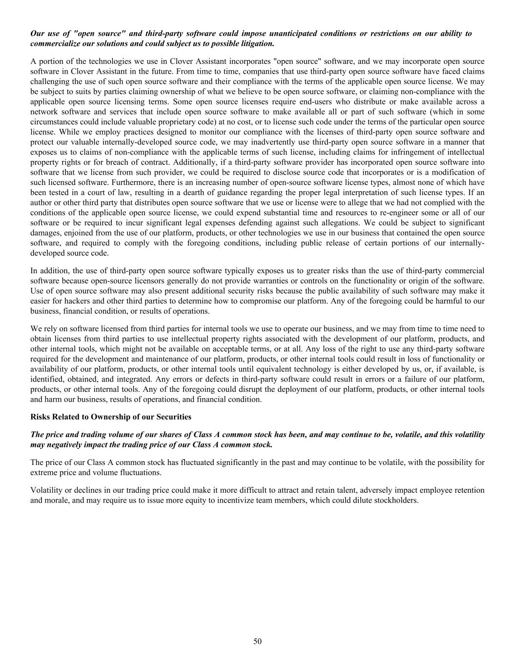 我们使用“开源”和第三方软件可能会对我们将解决方案商业化的能力施加意想不到的条件或限制,并可能使我们面临可能的诉讼。我们在Clover Assistant中使用的部分技术包含了“开源”软件,未来我们可能会在Clover Assistant中加入开源软件。不时有使用第三方开源软件的公司面临质疑使用此类开源软件及其遵守适用的开源许可条款的指控。我们可能会受到声称拥有我们认为是开源软件的所有权的各方的诉讼,或者声称不遵守适用的开源许可条款。一些开源许可要求在包含开源软件的网络软件和服务中分发或提供的最终用户免费提供全部或部分此类软件(在某些情况下可能包括有价值的专有代码),或根据特定开源许可的条款许可此类代码。虽然我们采用旨在监测我们对第三方开源软件许可的遵守情况并保护我们有价值的内部开发的源代码的做法,但我们可能会无意中使用第三方开源软件,从而使我们面临不遵守此类许可适用条款的索赔,包括侵犯知识产权或违约索赔。此外,如果第三方软件提供商已将开源软件纳入我们从该提供商获得许可的软件中,我们可能会被要求披露包含或修改此类许可软件的源代码。此外,开源软件许可类型越来越多,几乎没有一种在法庭上进行过测试,导致缺乏关于此类许可类型的适当法律解释的指导。如果分发我们使用或许可的开源软件的作者或其他第三方声称我们没有遵守适用的开源许可的条件,我们可能会花费大量时间和资源来重新设计我们的部分或全部软件,或者被要求承担针对此类指控进行辩护的大量法律费用。我们可能会受到重大损害,被禁止使用我们的平台、产品或我们在业务中使用的包含开源软件的其他技术,并被要求遵守上述条件,包括公开发布我们内部开发的源代码的某些部分。此外,与使用第三方商业软件相比,使用第三方开源软件通常会使我们面临更大的风险,因为开源许可机构通常不会对软件的功能或来源提供保证或控制。使用开源软件还可能带来额外的安全风险,因为此类软件的公开可用性可能使黑客和其他第三方更容易确定如何破坏我们的平台。上述任何情况都可能对我们的业务、财务状况或经营业绩造成损害。我们在经营业务时使用的内部工具依赖第三方许可的软件,我们可能不时需要从第三方获得许可,以使用与我们的平台、产品和其他内部工具的开发相关的知识产权,这些可能无法以可接受的条款获得,或者根本无法获得。失去使用开发和维护我们的平台、产品或其他内部工具所需的任何第三方软件的权利,可能会导致我们的平台、产品或其他内部工具的功能或可用性丧失,直到我们开发出同等技术,或者,如果有,被识别、获得和集成。第三方软件中的任何错误或缺陷都可能导致我们的平台、产品或其他内部工具出现错误或故障。上述任何情况都可能扰乱我们的平台、产品或其他内部工具的部署,并损害我们的业务、运营结果和财务状况。与我们证券所有权相关的风险我们A类普通股股票的价格和交易量一直并可能继续波动,这种波动可能会对我们A类普通股的交易价格产生负面影响。我们A类普通股的价格过去波动较大,可能会继续波动,存在价格和数量极端波动的可能性。我们交易价格的波动或下跌可能会使吸引和留住人才变得更加困难,对员工的留任和士气产生不利影响,并可能要求我们发行更多股权以激励团队成员, 这可能会稀释股东。50