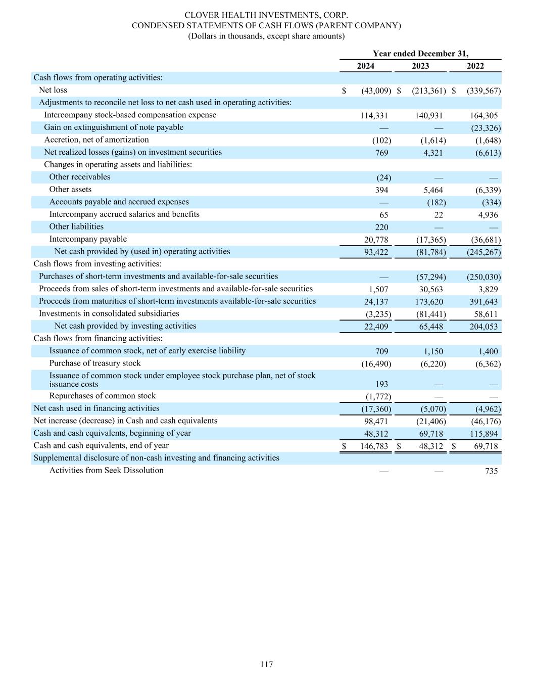 截至2024年12月31日的年度2023年2022年收入:其他收入9,355美元8,413美元5,898总收入9,3558,4135,898营业费用:一般和行政费用11778784营业费用总额11778784营业收入9,2388,3355,114股权投资损失(收益)4674,726(5,314)应付票据清偿收益——(23,326)合并子公司净亏损中的权益51,780216,970373,321净亏损$(43,009)$(213,361)$(339,567)CLOVER Health Investments,CORP。简明经营报表(母公司)(单位:千美元,股份金额除外)116