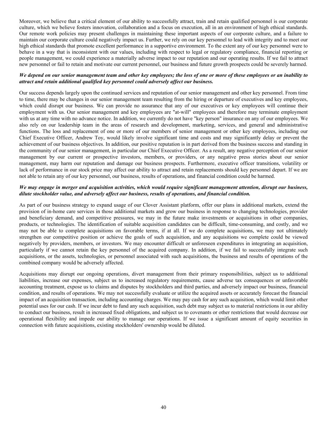 此外,我们认为,我们成功吸引、培训和留住合格人员的能力的一个关键因素是我们的企业文化,我们认为这种文化促进了创新、协作和对执行的关注,所有这些都是在高道德标准的环境中。我们的远程工作政策可能会在维护我们企业文化的这些重要方面带来挑战,未能维护我们的企业文化可能会对我们产生负面影响。此外,我们依靠我们的关键人员以诚信领导,并达到我们在支持性环境中促进卓越表现的高道德标准。如果我们的任何关键人员的行为方式与我们的价值观不一致,包括在法律或监管合规、财务报告或人员管理方面,我们的声誉和经营业绩可能会受到重大不利影响。如果我们未能吸引新的人员或未能留住和激励现有人员,我们的业务和未来增长前景可能会受到严重损害。我们依赖于我们的高级管理团队和其他关键员工;失去一名或多名这些员工或无法吸引和留住额外的合格关键人员可能会对我们的业务产生不利影响。我们的成功很大程度上取决于我们的高级管理层和其他关键人员的持续服务和声誉。我们的高级管理团队可能会不时因高管和关键员工的聘用或离职而发生变化,这可能会扰乱我们的业务。我们无法保证我们的任何高管或关键员工将继续受雇于我们。我们的高级管理层和关键员工是“随意”的员工,因此可能随时终止与我们的雇佣关系,无需提前通知。此外,我们目前没有给任何员工上“关键人物”保险。我们在研发、市场营销、服务以及一般和行政职能领域也依靠我们的领导团队。我们的一名或多名高级管理层成员或其他关键员工,包括我们的首席执行官Andrew Toy的流失和更换,可能会涉及大量时间和成本,并可能严重延迟或阻止我们业务目标的实现。此外,我们的正面声誉部分源于我们的高级管理层,特别是我们的首席执行官在商业上的成功和在社区中的地位。因此,我们当前或潜在的投资者、会员或供应商对我们高级管理层的任何负面看法,或任何关于我们高级管理层的负面新闻报道,都可能损害我们的声誉并损害我们的业务前景。此外,如果关键人员离职,我们的高管过渡、股价波动或缺乏表现可能会影响我们吸引和留住替代人员的能力。如果我们无法留住任何关键人员,我们的业务、经营业绩和财务状况都可能受到损害。我们可能会从事并购活动,这将需要管理层的重大关注,扰乱我们的业务,稀释股东价值,并对我们的业务、经营业绩和财务状况产生不利影响。作为我们业务战略的一部分,以扩大使用我们的Clover Assistant平台,在更多市场提供我们的计划,在这些额外市场扩大提供居家护理服务,并根据不断变化的技术、提供者和受益者的需求以及竞争压力发展我们的业务,我们可能在未来对其他公司、产品或技术进行投资或收购。确定合适的收购候选人可能是困难的、耗时的、成本高昂的,而且我们可能无法以优惠的条件完成收购,如果有的话。如果我们进行完整的收购,我们可能最终不会加强我们的竞争地位或实现此类收购的目标,我们完成的任何收购都可能受到供应商、成员或投资者的负面评价。我们在整合收购时可能会遇到困难或无法预见的支出,特别是如果我们无法留住被收购公司的关键人员。此外,如果我们未能成功整合此类收购,或与此类收购相关的资产、技术或人员,合并后公司的业务和经营业绩将受到不利影响。收购可能会扰乱我们的持续运营,转移管理层对其主要责任的注意力,使我们承担额外的责任,增加我们的开支,使我们受到更高的监管要求,造成不利的税务后果或不利的会计处理,使我们面临股东和第三方的索赔和纠纷,并对我们的业务、财务状况产生不利影响, 和运营结果。我们可能无法成功评估或利用收购的资产或准确预测收购交易的财务影响,包括会计费用。我们可能会为任何此类收购支付现金,这将限制我们现金的其他潜在用途。如果我们为资助任何此类收购而产生债务,则此类债务可能会使我们在开展业务的能力方面受到重大限制,导致固定债务增加,并使我们受到契约或其他限制,这将降低我们的运营灵活性并阻碍我们管理运营的能力。如果我们发行大量与未来收购相关的股本证券,现有股东的所有权将被稀释。40
