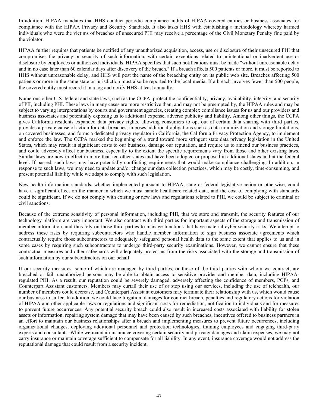 此外,HIPAA要求HHS对HIPAA涵盖的实体或业务伙伴进行定期合规审计,以确保其符合HIPAA隐私和安全标准。它还责成HHS建立一种方法,据此,作为无担保PHI违约行为受害者的受损害个人可能会获得违规者支付的一定比例的民事罚款。HIPAA还要求,如果未经授权获得、访问、使用或披露其无担保PHI,损害了此类信息的隐私或安全,则应通知患者,但与雇员或获授权个人无意或无意使用或披露有关的某些例外情况除外。HIPAA规定,此类通知必须“不得无理拖延,且在任何情况下不得迟于发现违规行为后的60个日历日”。如果一项违约行为影响到500名或更多患者,则必须立即向HHS报告,不得无理拖延,HHS将在其公共网站上发布违约主体的名称。影响同一州或辖区内500名或更多患者的违规行为也必须向当地媒体报告。如果一项违约涉及的人数少于500人,则涵盖的实体必须记录在日志中,并至少每年通知一次HHS。美国许多其他联邦和州的法律,例如CCPA,都保护包括PHI在内的PII的机密性、隐私权、可用性、完整性和安全性。在许多情况下,这些法律比HIPAA规则更具限制性,并且可能不会被HIPAA规则所取代,并且可能会受到法院和政府机构的不同解释,从而给我们以及我们的供应商和商业伙伴带来复杂的合规问题,并可能使我们面临额外的费用、负面宣传和责任。除其他事项外,CCPA赋予加州居民扩大的数据隐私权,允许消费者选择不与第三方共享某些数据,为数据泄露提供私人诉讼理由,规定数据最小化和存储限制等额外义务;对涵盖的企业;并在加州组建一个专门的隐私监管机构,即加州隐私保护局,以实施和执法。CCPA标志着美国开始出现更严格的州数据隐私立法的趋势,这可能会给我们的业务带来重大成本,损害我们的声誉,并要求我们修改我们的商业惯例,并可能对我们的业务产生不利影响,尤其是具体要求与这些法律和其他现行法律有所不同。类似的法律目前已在其他十多个州生效,并已在其他州和联邦一级通过或提出。如果获得通过,这类法律可能会有潜在的相互冲突的要求,这将使合规变得具有挑战性。此外,为了应对此类法律,我们可能需要更新和/或改变我们的数据收集做法,这可能是昂贵的、耗时的,并且在我们适应遵守此类立法时会产生潜在的责任。新的健康信息标准,无论是根据HIPAA、州或联邦立法行动或其他方式实施,都可能对我们必须处理医疗保健相关数据的方式产生重大影响,遵守标准的成本可能很高。如果我们不遵守与PHI相关的现有或新的法律法规,我们可能会受到刑事或民事制裁。由于我们存储和传输的个人信息,包括PHI的极端敏感性,我们的技术平台的安全特性非常重要。我们还与第三方就成员信息的存储和传输的重要方面签订合同,从而依赖那些第三方来管理具有重大网络安全风险的职能。我们试图通过要求处理会员信息的分包商签署商业伙伴协议来解决这些风险,这些协议在合同上要求这些分包商在适用于我们的相同程度上充分保护个人健康数据,在某些情况下还要求这些分包商接受第三方安全检查。然而,我们无法确保这些合同措施和其他保障措施将充分保护我们免受与我们的分包商代表我们存储和传输此类信息相关的风险。如果我们的安全措施(其中一些由第三方管理,或我们与之签约的第三方的安全措施)遭到破坏或失败,未经授权的人员可能能够获得对敏感的提供者和成员数据的访问,包括受HIPAA监管的PHI。因此,我们的声誉可能会受到严重损害,对会员、PCP和对口助理客户的信心产生不利影响。会员可能会减少使用或停止使用我们的服务,包括使用远程医疗,我们的会员数量可能会减少, 和对口助理客户可能会终止与我们的关系,这将导致我们的业务受到影响。此外,我们可能面临诉讼、合同违约损害赔偿、违反HIPAA和其他适用法律或法规的处罚和监管行动,以及补救、通知个人和防止未来发生的措施的重大成本。任何潜在的安全漏洞还可能导致与被盗资产或信息的责任相关的成本增加,修复此类漏洞可能造成的系统损坏,向业务合作伙伴提供激励措施以努力在漏洞发生后维持我们的业务关系,并实施措施以防止未来发生,包括组织变革、部署额外人员和保护技术、培训员工和聘请第三方专家和顾问。虽然我们保有涵盖某些安全和隐私损害和索赔费用的保险,但我们可能不会携带保险或维持足以赔偿所有责任的保险。无论如何,保险范围不会涉及安全事故可能导致的声誉损害。47