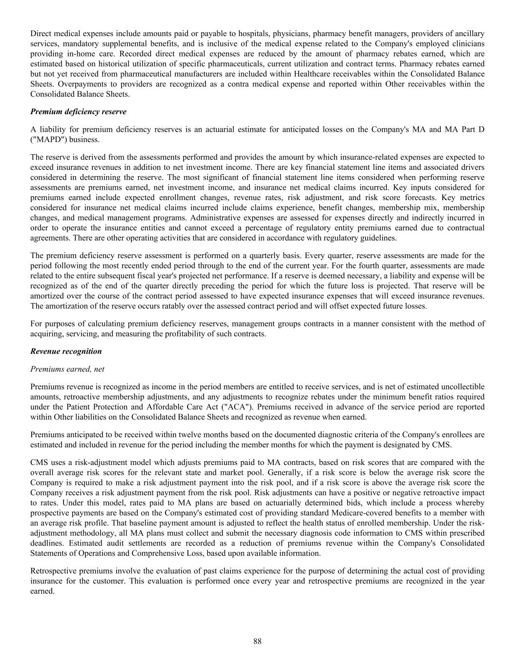 直接医疗费用包括支付或应付给医院、医生、药房福利管理人员、辅助服务提供者、强制性补充福利的金额,包括与公司受雇临床医生提供居家护理相关的医疗费用。记录的直接医疗费用减去赚取的药房回扣金额,这是根据特定药品的历史使用情况、当前使用情况和合同条款进行估计的。从药品制造商获得但尚未收到的药房回扣包含在合并资产负债表内的医疗保健应收账款中。向提供者多付的款项被确认为对冲医疗费用,并在综合资产负债表的其他应收款中报告。溢价不足准备金溢价不足准备金负债是对公司MA和MA D部分(“MAPD”)业务的预期损失的精算估计。准备金是从执行的评估中得出的,并提供了除净投资收益外,预计与保险相关的费用将超过保险收入的金额。在确定准备金时考虑了关键的财务报表项目和相关的驱动因素。在进行准备金评估时考虑的财务报表项目中,最重要的是已赚保费、净投资收益和发生的保险净医疗索赔。已赚保费考虑的关键输入包括预期注册人数变化、收入率、风险调整和风险评分预测。为发生的保险净医疗索赔考虑的关键指标包括索赔经验、福利变化、会员组合、会员变化和医疗管理计划。管理费用评估的是为经营保险实体而直接和间接发生的费用,不能超过因合同约定而赚取的监管实体保费的一个百分比。有其他经营活动根据监管指引予以考虑。保费不足准备金评估按季度进行。每个季度,对最近结束的时期之后到本年度结束的时期进行储备评估。对于第四季度,评估与整个下一财年的预计净业绩相关。如果认为有必要提取准备金,将在预测未来损失的期间之前的季度末确认负债和费用。该准备金将在经评估具有超过保险收入的预期保险费用的合同期内摊销。准备金的摊销在评估的合同期内按比例发生,并将抵消预期的未来损失。为计算溢价不足准备金,管理层将合同按与获取、服务和衡量此类合同盈利能力的方法一致的方式进行分组。收入确认已赚取的保费、净保费收入在会员有权获得服务期间确认为收入,并扣除估计无法收回的金额、追溯会员调整以及根据《患者保护和平价医疗法案》(“ACA”)要求的最低福利比率确认回扣的任何调整。服务期提前收到的保费在合并资产负债表的其他负债中列报,并在赚取时确认为收入。根据公司参保人的书面诊断标准,预计将在十二个月内收到的保费估计并计入包括CMS指定付款的会员月份在内的期间的收入。CMS使用风险调整模型,该模型根据风险评分与相关状态和市场池的总体平均风险评分进行比较,调整向MA合约支付的溢价。一般情况下,如果某项风险评分低于平均风险评分,则要求公司将风险调整款支付入风险池,如果某项风险评分高于平均风险评分,则公司从风险池获得风险调整款。风险调整可能对利率产生正面或负面的追溯影响。在这种模式下,向MA计划支付的费率基于精算确定的出价,其中包括一个过程,预期付款基于公司向风险状况一般的成员提供标准医疗保险覆盖福利的估计成本。该基准支付金额进行调整,以反映注册会员的健康状况。在风险调整方法论下, 所有MA计划都必须在规定的期限内收集并向CMS提交必要的诊断代码信息。根据现有信息,估计的审计结算在公司的综合运营和综合损失报表中记录为保费收入的减少。追溯保费涉及对以往理赔经验的评估,以确定为客户提供保险的实际成本。该评估每年进行一次,追溯保费在已赚年度确认。88