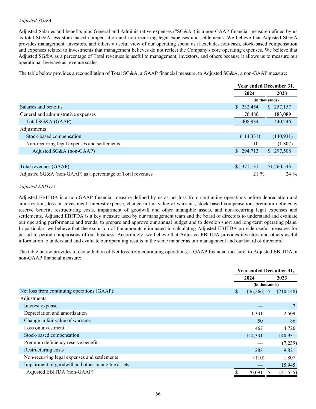 调整后的SG & A调整后的工资和福利加上一般和行政费用(“SG & A”)是一种非GAAP财务指标,我们将其定义为SG & A总额减去基于股票的薪酬以及非经常性法律费用和和解。我们认为,调整后的SG & A为管理层、投资者和其他人提供了关于我们运营支出的有用观点,因为它不包括非现金、基于股票的薪酬以及与管理层认为不反映公司核心运营支出的投资相关的费用。我们认为,调整后的SG & A占总收入的百分比对管理层、投资者和其他人有用,因为它使我们能够以收入规模来衡量我们的运营杠杆。下表提供了GAAP财务指标Total SG & A与非GAAP指标调整后SG & A的对账:截至12月31日止年度,20242023(单位:千)工资和福利$ 232,454 $ 257,157一般和行政费用176,480183,089 SG & A总额(GAAP)408,934440,246调整股票薪酬(114,331)(140,931)非经常性法律费用和和解110(1,807)调整后SG & A(non-GAAP)$ 294,713 $ 297,508总收入(GAAP)$ 1,371,131 $ 1,260,543调整后SG & A(non-GAAP)占总收入的百分比21% 24%调整后EBITDA调整后EBITDA是一种非GAAP财务指标,我们将其定义为折旧和摊销前的持续经营净亏损、投资损失、利息费用、认股权证公允价值变动、股票薪酬,溢价不足准备金利益、重组费用、商誉及其他无形资产减值、非经常性法律费用及和解。调整后的EBITDA是我们的管理团队和董事会用来理解和评估我们的经营业绩和趋势、编制和批准我们的年度预算以及制定短期和长期经营计划的关键衡量标准。特别是,我们认为,在计算调整后EBITDA时排除剔除的金额为我们业务的期间比较提供了有用的衡量标准。因此,我们认为,调整后的EBITDA为投资者和其他人提供了有用的信息,以了解和评估我们的经营业绩,方式与我们的管理层和董事会相同。下表提供了持续经营净亏损(GAAP财务指标)与调整后EBITDA(非GAAP财务指标)的对账:截至12月31日止年度,20242023(千)持续经营净亏损(GAAP):$(46,266)$(210,148)调整利息支出— 7折旧和摊销1,3312,509认股权证公允价值变动5086投资损失4674,726股票补偿114,331140,931溢价不足准备金收益—(7,239)重组成本2889,821非经常性法律费用和和解(110)1,807商誉和其他无形资产减值— 15,945调整后EBITDA(non-GAAP)70,091美元(41,555)66