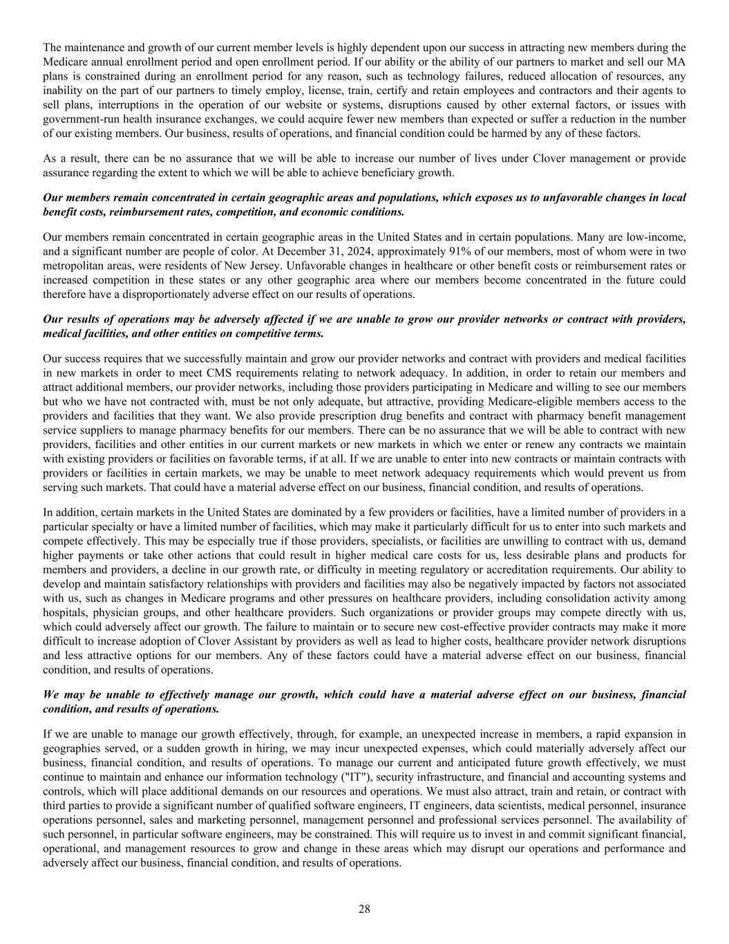 我们现有会员水平的保持和增长高度依赖于我们在Medicare年度注册期间和开放注册期间成功吸引新会员。如果我们或我们的合作伙伴营销和销售我们的MA计划的能力在注册期间因任何原因受到限制,例如技术故障、资源分配减少、我们的合作伙伴无法及时雇用、许可、培训、认证和留住员工和承包商及其代理人以销售计划、我们的网站或系统运营中断、其他外部因素造成的中断或政府运营的健康保险交易所的问题,我们可能会获得比预期更少的新会员,或者我们现有会员的数量会减少。我们的业务、经营业绩和财务状况可能会受到上述任何因素的损害。因此,无法保证我们将能够在Clover管理下增加我们的生命数量,或就我们能够在多大程度上实现受益增长提供保证。我们的成员仍然集中在某些地理区域和人口中,这使我们面临当地福利成本、报销率、竞争和经济状况的不利变化。我们的成员仍然集中在美国的某些地理区域和某些人口中。许多人是低收入,相当多的人是有色人种。截至2024年12月31日,我们大约91%的成员,其中大多数位于两个大都市区,是新泽西州的居民。因此,在这些州或我们的成员未来变得集中的任何其他地理区域,医疗保健或其他福利成本或报销率的不利变化或竞争加剧可能会对我们的经营业绩产生不成比例的不利影响。如果我们无法发展我们的供应商网络或以竞争性条款与供应商、医疗设施和其他实体签订合同,我们的经营业绩可能会受到不利影响。我们的成功要求我们成功地维护和发展我们的供应商网络,并与新市场的供应商和医疗设施签订合同,以满足与网络充分性相关的CMS要求。此外,为了留住我们的成员并吸引更多的成员,我们的提供者网络,包括那些参与医疗保险并愿意看到我们的成员但我们没有与之签约的提供者,必须不仅是足够的,而且是有吸引力的,为符合医疗保险资格的成员提供他们想要的提供者和设施的访问权限。我们还提供处方药福利,并与药房福利管理服务供应商签约,为我们的会员管理药房福利。无法保证我们将能够与我们当前市场或新市场中的新供应商、设施和其他实体签订合同,在这些市场中,我们以优惠条件进入或续签我们与现有供应商或设施维持的任何合同(如果有的话)。如果我们无法与某些市场的供应商或设施签订新合同或维持合同,我们可能无法满足网络充足性要求,这将阻止我们为此类市场提供服务。这可能对我们的业务、财务状况和经营业绩产生重大不利影响。此外,美国的某些市场由少数供应商或设施主导,特定专业的供应商数量有限或设施数量有限,这可能使我们特别难以进入此类市场并有效竞争。如果那些提供者、专家或设施不愿意与我们签订合同、要求更高的付款或采取其他行动,可能会导致我们的医疗保健成本增加、会员和提供者的计划和产品不那么理想、我们的增长率下降或难以满足监管或认证要求,情况可能尤其如此。我们与提供者和设施发展和保持令人满意的关系的能力也可能受到与我们无关的因素的负面影响,例如医疗保险计划的变化和对医疗保健提供者的其他压力,包括医院、医生团体和其他医疗保健提供者之间的合并活动。这类组织或供应商集团可能会与我们直接竞争,这可能会对我们的增长产生不利影响。未能维持或确保新的具有成本效益的供应商合同可能会使供应商更难增加对Clover Assistant的采用,并导致更高的成本、医疗保健供应商网络中断以及对我们会员的吸引力降低的选择。任何这些因素都可能对我们的业务、财务状况和经营业绩产生重大不利影响。我们可能无法有效管理我们的增长, 这可能对我们的业务、财务状况和经营业绩产生重大不利影响。如果我们无法有效地管理我们的增长,例如,通过成员的意外增加、所服务的地区的快速扩张或招聘的突然增长,我们可能会产生意外费用,这可能会对我们的业务、财务状况和经营业绩产生重大不利影响。为了有效管理我们当前和预期的未来增长,我们必须继续维护和加强我们的信息技术(“IT”)、安全基础设施以及财务和会计系统和控制,这将对我们的资源和运营提出额外的要求。还要吸引、培养和留住,或者与第三方签约,提供数量可观的合格软件工程师、IT工程师、数据科学家、医疗人员、保险运营人员、销售营销人员、管理人员和专业服务人员。这类人员,特别是软件工程师的可用性可能会受到限制。这将要求我们投资并投入大量财务、运营和管理资源,以在这些领域实现增长和变化,这可能会扰乱我们的运营和业绩,并对我们的业务、财务状况和经营业绩产生不利影响。28