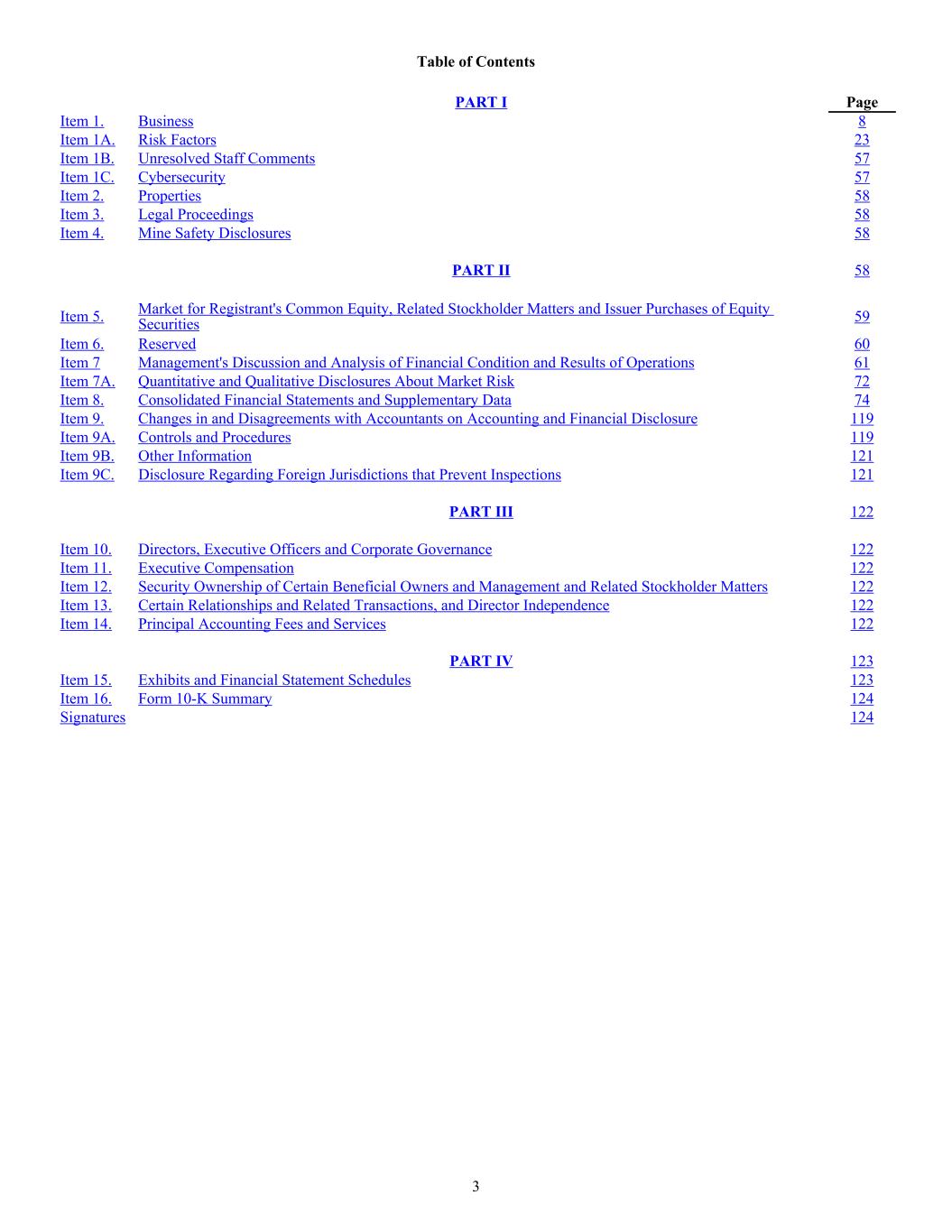 目录第一部分第1页第1项。业务8项目1a。风险因素23项目1b。未解决的工作人员意见57项目1c。网络安全57项目2。属性58第3项。法律程序58第4项。矿山安全披露58第二部分58项目5。市场对注册人的普通股权、相关股东事项和发行人购买股本证券59第6项。保留60项7管理层对财务状况和经营成果的讨论与分析61项7a。关于市场风险的定量和定性披露72项目8。合并财务报表和补充数据74项目9。关于会计和财务披露的变更和与会计师的分歧119第9A项。控制和程序119项目9b。其他信息121项目9c。关于阻止检查的外国司法管辖区的披露121第III部分122项10。董事、执行官和公司治理122项目11。高管薪酬122项目12。若干受益所有人的安全所有权和管理层及相关股东事项122第13项。某些关系和关联交易,以及董事独立性122项目14。主要会计费用和服务122第四部分123项目15。展品和财务报表附表123项目16。表格10-K摘要124签名1243