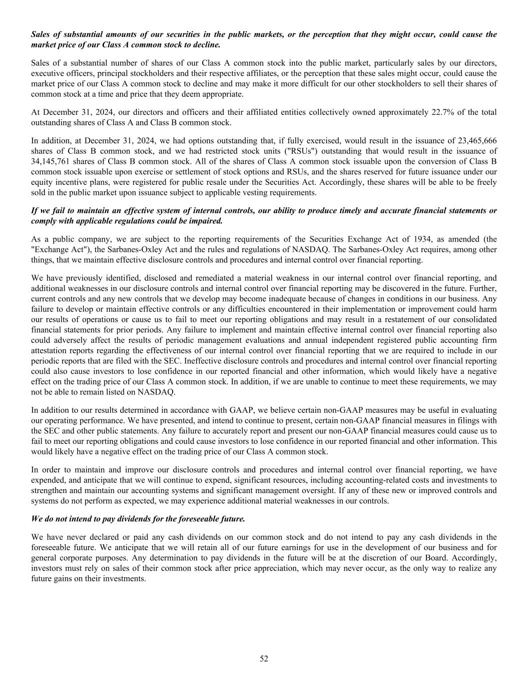 在公开市场上大量出售我们的证券,或认为它们可能发生,可能会导致我们A类普通股的市场价格下跌。向公开市场出售大量我们的A类普通股,特别是我们的董事、执行官、主要股东及其各自关联公司的出售,或认为这些出售可能会发生,可能会导致我们的A类普通股的市场价格下跌,并可能使我们的其他股东更难在他们认为合适的时间和价格出售他们的普通股。截至2024年12月31日,我们的董事和高级职员及其关联实体合计拥有A类和B类普通股总流通股的约22.7%。此外,在2024年12月31日,我们有未行使的期权,如果完全行使,将导致发行23,465,666股B类普通股,我们有未行使的限制性股票单位(“RSU”),将导致发行34,145,761股B类普通股。在股票期权和RSU行使或结算时可发行的B类普通股转换后可发行的所有A类普通股股份,以及根据我们的股权激励计划为未来发行保留的股份,均已根据《证券法》登记公开转售。因此,这些股份将能够在发行时在公开市场上自由出售,但须遵守适用的归属要求。如果我们未能维持有效的内部控制系统,我们编制及时准确的财务报表或遵守适用法规的能力可能会受到损害。作为一家上市公司,我们须遵守经修订的1934年《证券交易法》(《交易法》)、《萨班斯-奥克斯利法案》和纳斯达克的规则和条例的报告要求。《萨班斯-奥克斯利法案》除其他外,要求我们保持有效的披露控制和程序以及对财务报告的内部控制。我们之前已经发现、披露并纠正了我们在财务报告内部控制方面的重大缺陷,未来可能会发现我们在披露控制和财务报告内部控制方面的其他缺陷。此外,当前的控制和我们开发的任何新的控制可能会因为我们业务条件的变化而变得不够充分。任何未能制定或维持有效控制措施或在实施或改进这些措施时遇到的任何困难都可能损害我们的经营业绩或导致我们未能履行我们的报告义务,并可能导致我们对以往各期的合并财务报表进行重述。任何未能实施和维持有效的财务报告内部控制也可能对我们被要求在提交给SEC的定期报告中包含的关于我们的财务报告内部控制有效性的定期管理评估和年度独立注册会计师事务所鉴证报告的结果产生不利影响。无效的披露控制和程序以及财务报告内部控制也可能导致投资者对我们报告的财务和其他信息失去信心,这可能会对我们的A类普通股的交易价格产生负面影响。此外,如果我们无法继续满足这些要求,我们可能无法继续在纳斯达克上市。除了我们根据公认会计原则确定的结果外,我们认为某些非公认会计原则措施可能有助于评估我们的经营业绩。我们已经在提交给SEC的文件和其他公开声明中提出并打算继续提出某些非GAAP财务措施。任何未能准确报告和提出我们的非公认会计原则财务措施的情况都可能导致我们未能履行我们的报告义务,并可能导致投资者对我们报告的财务和其他信息失去信心。这可能会对我们A类普通股的交易价格产生负面影响。为了维持和改善我们的披露控制和程序以及对财务报告的内部控制,我们已经并预计将继续花费大量资源,包括与会计相关的成本和投资,以加强和维持我们的会计制度和重大的管理监督。如果这些新的或改进的控制和系统中的任何一个没有按预期执行, 我们的控制可能会遇到额外的实质性弱点。我们不打算在可预见的未来派发股息。我们从未就我们的普通股宣布或支付任何现金股息,也不打算在可预见的未来支付任何现金股息。我们预计,我们将保留我们未来的所有收益,以用于我们的业务发展和一般公司用途。未来派发股息的任何决定将由我们的董事会酌情决定。因此,投资者必须依赖在价格升值后出售其普通股,这可能永远不会发生,作为实现其投资未来收益的唯一途径。52