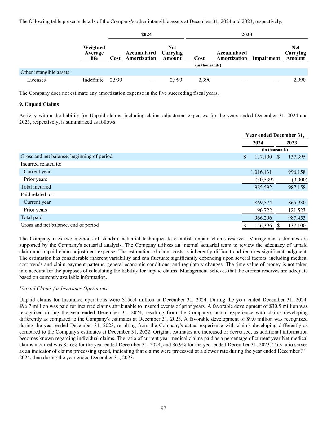 下表分别列示了2024年12月31日和2023年12月31日公司其他无形资产的详细情况:20242023加权平均寿命成本累计摊销净账面金额成本累计摊销减值净账面金额(单位:千)其他无形资产:许可证无限期2,990 — 2,9902,990 —— 2,990公司未估计以后五个会计年度的任何摊销费用。9.未付索赔分别截至2024年12月31日和2023年12月31日止年度未付索赔负债范围内的活动,包括索赔调整费用,汇总如下:截至2024年12月31日止年度2023年(单位:千)毛额和净余额,期初137,100美元137,395美元发生相关:本年度1,016,13 1996,158以前年度(30,539)(9,000)发生总额985,592987,158已支付相关:本年度869,574865,930以前年度96,722121,523已付总额966,296987,453毛额和净余额,期末156,396美元137,100美元公司使用标准精算技术的两种方法来建立未付索赔准备金。管理层的估计得到了公司精算分析的支持。公司利用内部精算团队审查未支付的索赔和未支付的索赔调整费用的充分性。索赔成本的估算具有内在的难度,需要进行重大的判断。该估算具有相当大的内在可变性,并可能因医疗成本趋势和索赔支付模式、总体经济状况和监管变化等几个因素而大幅波动。在计算未付债权的赔偿责任时,不考虑货币的时间价值。管理层认为,根据目前可获得的信息,目前的储备是足够的。截至2024年12月31日,保险业务的未支付索赔保险业务的未支付索赔为1.564亿美元。在截至2024年12月31日的一年中,为前几年保险事件引起的已发生索赔支付了9670万美元。在截至2024年12月31日的年度内确认了3050万美元的有利发展,这是由于公司在索赔发展方面的实际经验与公司在2023年12月31日的估计不同。截至2023年12月31日止年度确认了900万美元的有利发展,这是由于公司在索赔发展方面的实际经验与公司在2022年12月31日的估计不同。随着有关个人索赔的更多信息被知晓,原始估计数会增加或减少。截至2024年12月31日止年度,支付的当年医疗索赔占当年发生的净医疗索赔的百分比为85.6%,截至2023年12月31日止年度为86.9%。这一比率作为索赔处理速度的指标,表明截至2024年12月31日止年度的索赔处理速度低于截至2023年12月31日止年度。97