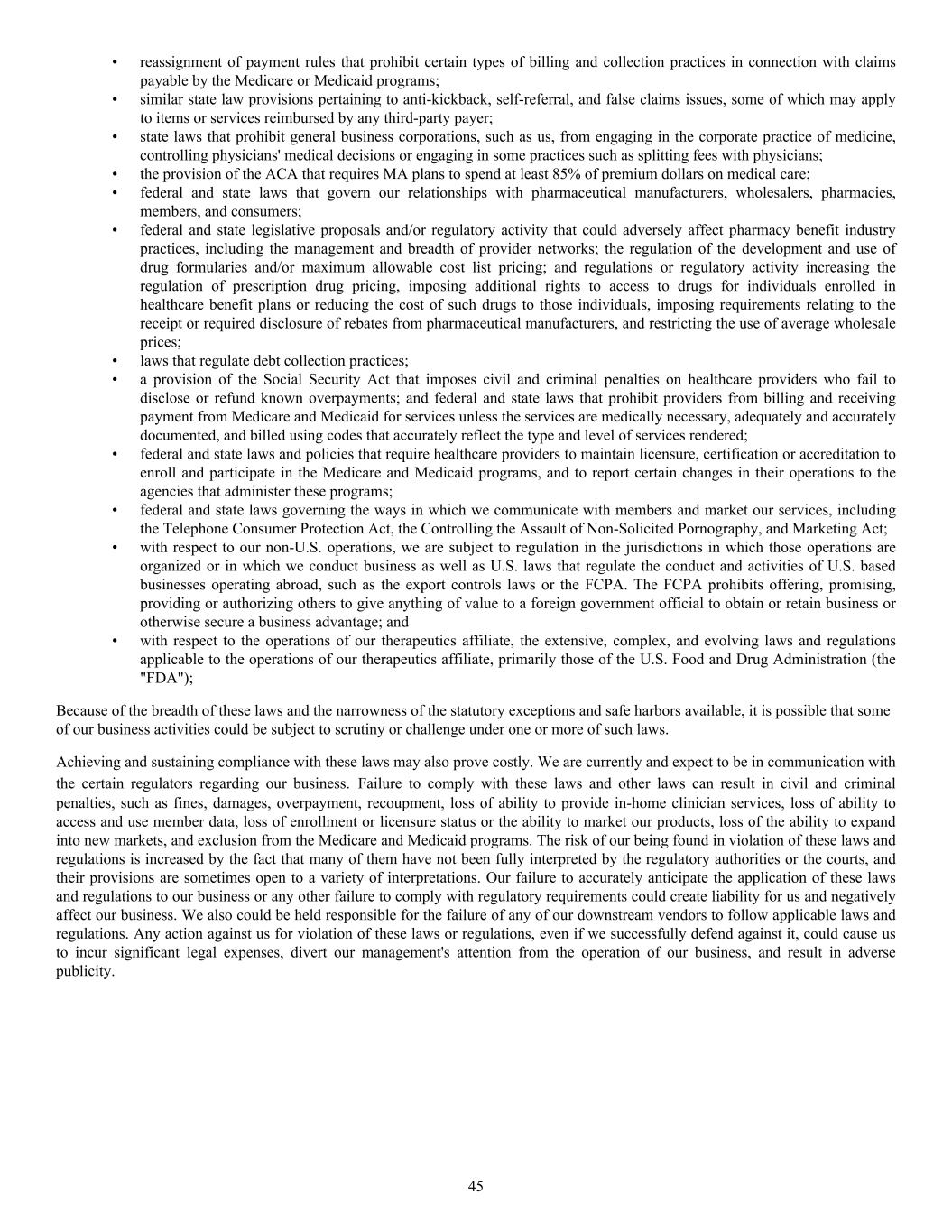 •重新分配支付规则,禁止与医疗保险或医疗补助计划应付的索赔有关的某些类型的计费和收款做法;•与反回扣、自我转介和虚假索赔问题有关的类似的州法律规定,其中一些可能适用于任何第三方付款人报销的项目或服务;•州法律禁止一般商业公司,例如我们,从事医药的公司实践,控制医生的医疗决定或从事一些实践,例如与医生分摊费用;•规定MA计划将至少85%的保费用于医疗保健的ACA;•管辖我们与药品制造商、批发商、药房、会员和消费者关系的联邦和州法律;•可能对药房产生不利影响的联邦和州立法提案和/或监管活动,有利于行业实践,包括供应商网络的管理和广度;对药物处方集的开发和使用和/或最高允许成本清单定价的监管;以及加强对处方药定价监管的法规或监管活动,对参加医疗保健福利计划的个人施加额外的获得药物的权利或降低这些个人的此类药物成本,对药品制造商的回扣的收取或要求披露施加相关要求,并限制使用平均批发价格;•规范讨债行为的法律;•《社会保障法》的一项条款,对未披露或退还已知多付款项的医疗保健提供者施加民事和刑事处罚;联邦和州法律禁止提供者就服务开具账单和接受医疗保险和医疗补助支付的款项,除非这些服务在医疗上是必要的,有充分和准确的记录,并使用准确反映所提供服务的类型和水平的代码开具账单;•要求医疗保健提供者保持许可的联邦和州法律和政策,注册和参与医疗保险和医疗补助计划的认证或认证,并向管理这些计划的机构报告其运营中的某些变化;•联邦和州法律规范我们与会员沟通和营销我们的服务的方式,包括《电话消费者保护法》、《控制非邀约色情制品袭击和营销法》;•关于我们的非美国业务,我们受组织这些业务或我们开展业务的司法管辖区的监管以及规范在国外经营的美国企业的行为和活动的美国法律的约束,例如出口管制法或FCPA。FCPA禁止向外国政府官员提供、承诺、提供或授权他人提供任何有价值的东西,以获得或保留业务或以其他方式获得业务优势;•关于我们的治疗附属公司的运营,适用于我们的治疗附属公司运营的广泛、复杂和不断演变的法律法规,主要是美国食品和药物管理局(“FDA”)的那些法律法规;由于这些法律的广度以及可用的法定例外和安全港的狭窄,根据一项或多项此类法律,我们的某些业务活动可能会受到审查或质疑。实现并持续遵守这些法律也可能证明代价高昂。我们目前正在并预计将就我们的业务与某些监管机构进行沟通。不遵守这些法律和其他法律可能会导致民事和刑事处罚,例如罚款、损害赔偿、多付、补偿、丧失提供居家临床医生服务的能力、丧失访问和使用会员数据的能力、丧失注册或许可身份或营销我们产品的能力、丧失拓展新市场的能力,以及被排除在医疗保险和医疗补助计划之外。我们被认定违反这些法律法规的风险,是因为其中很多没有得到监管部门或法院的充分解释,它们的规定有时会有各种各样的解释。我们未能准确预测这些法律法规对我们业务的应用或任何其他未能遵守监管要求的情况可能会给我们造成责任并对我们的业务产生负面影响。我们还可能对我们的任何下游供应商未能遵守适用的法律法规负责。任何因违反这些法律或法规而对我们采取的行动,即使我们成功地进行了抗辩,也可能导致我们产生重大的法律费用, 转移我们管理层对我们业务运营的注意力,造成负面宣传。45